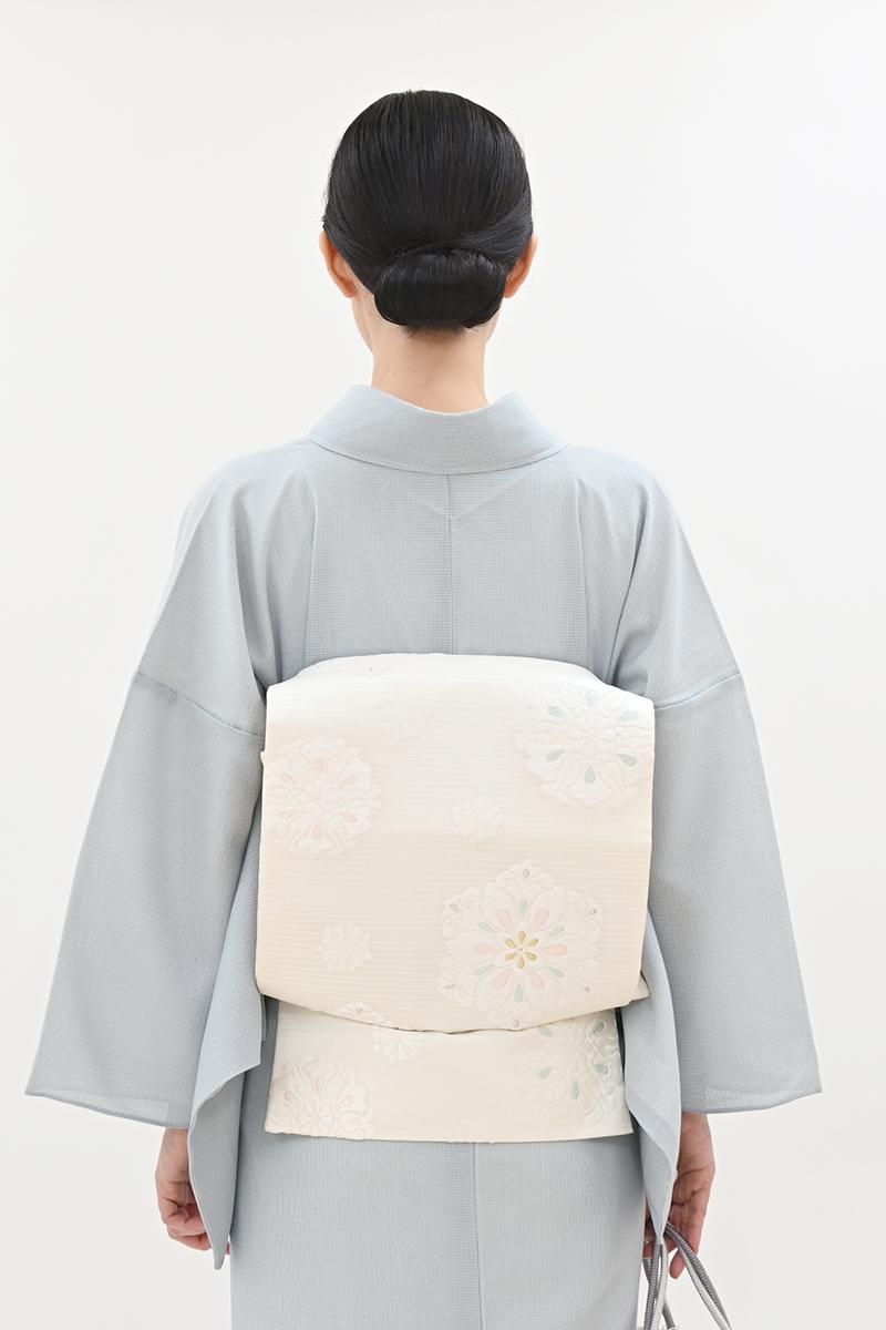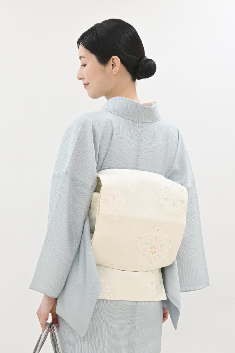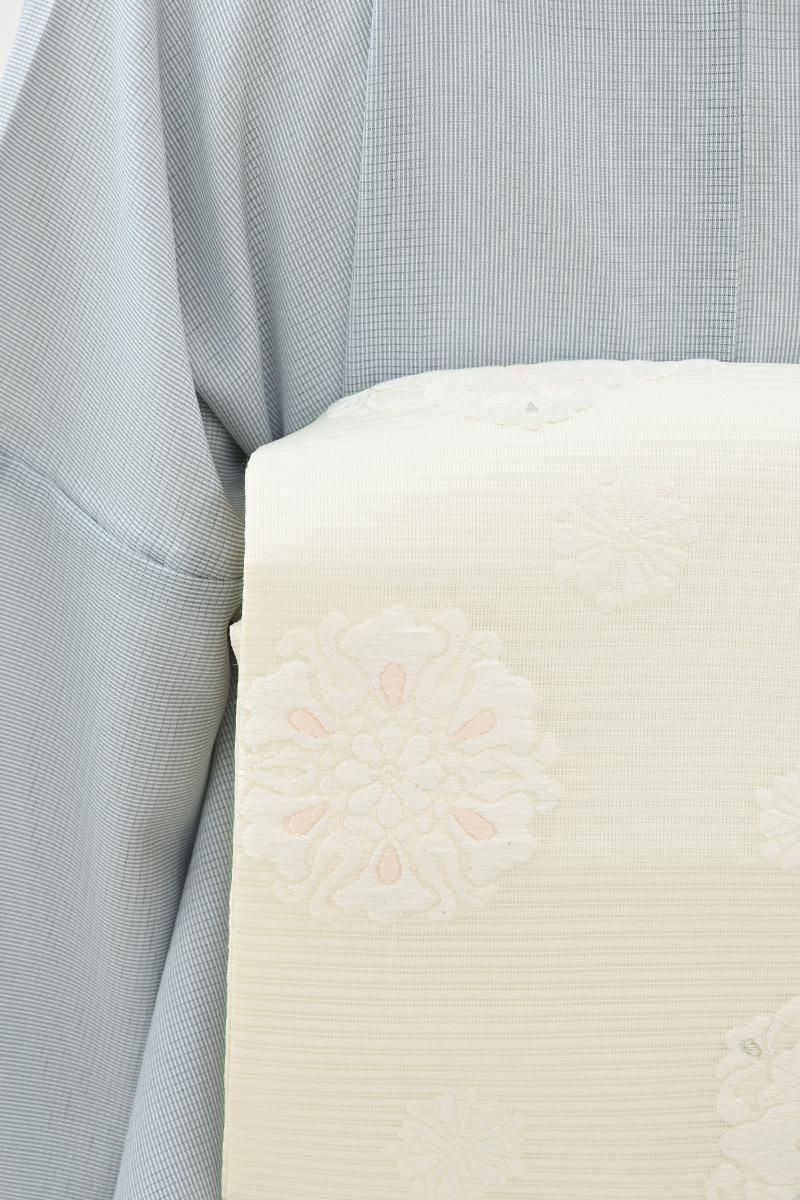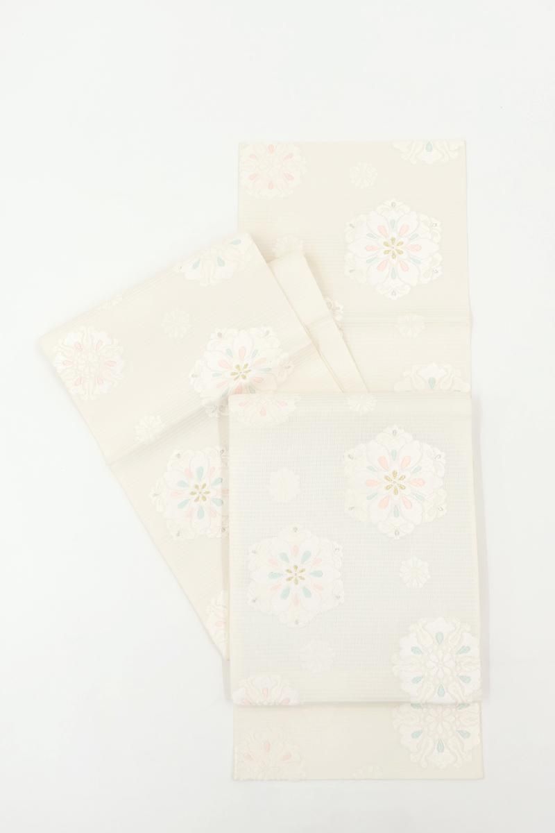 清々しい白色の地に、様々な大きさの華文を織りだした夏の袋帯です。