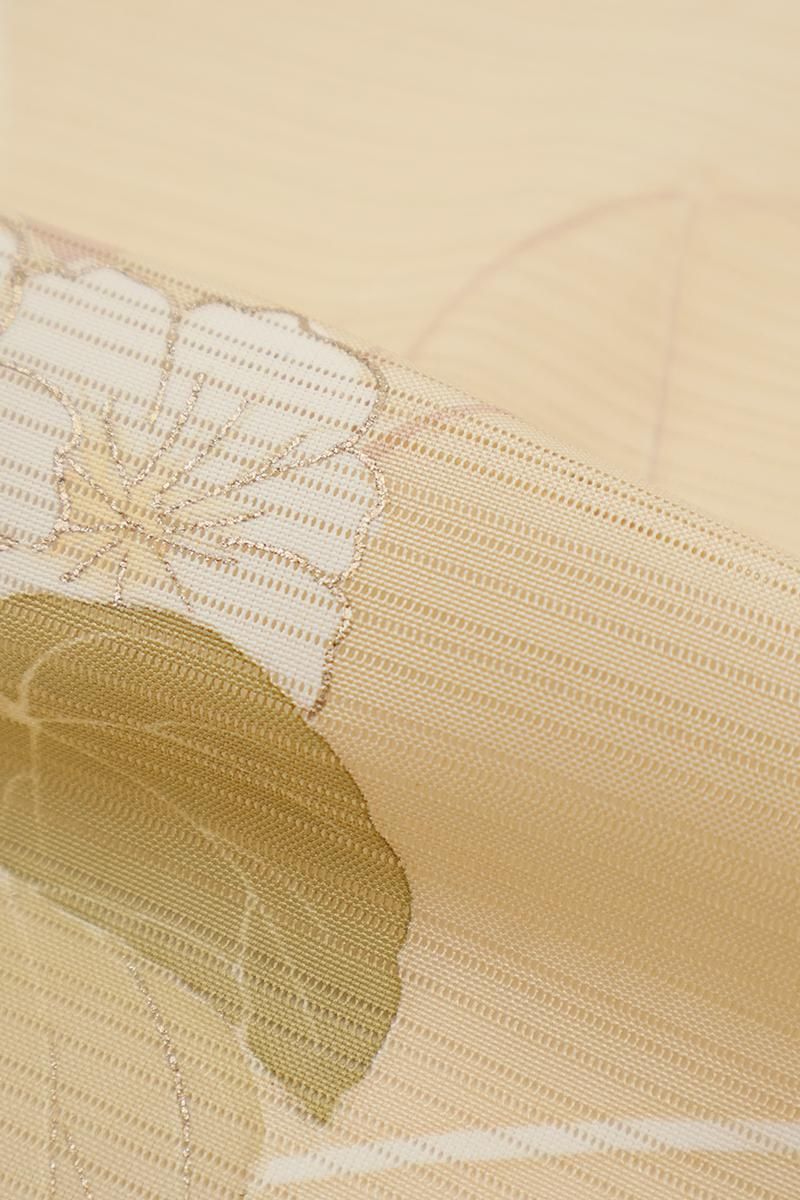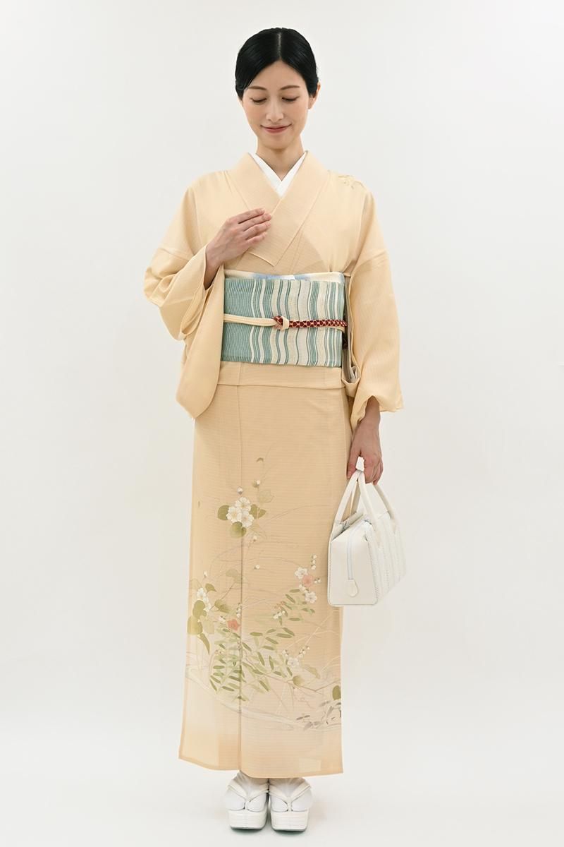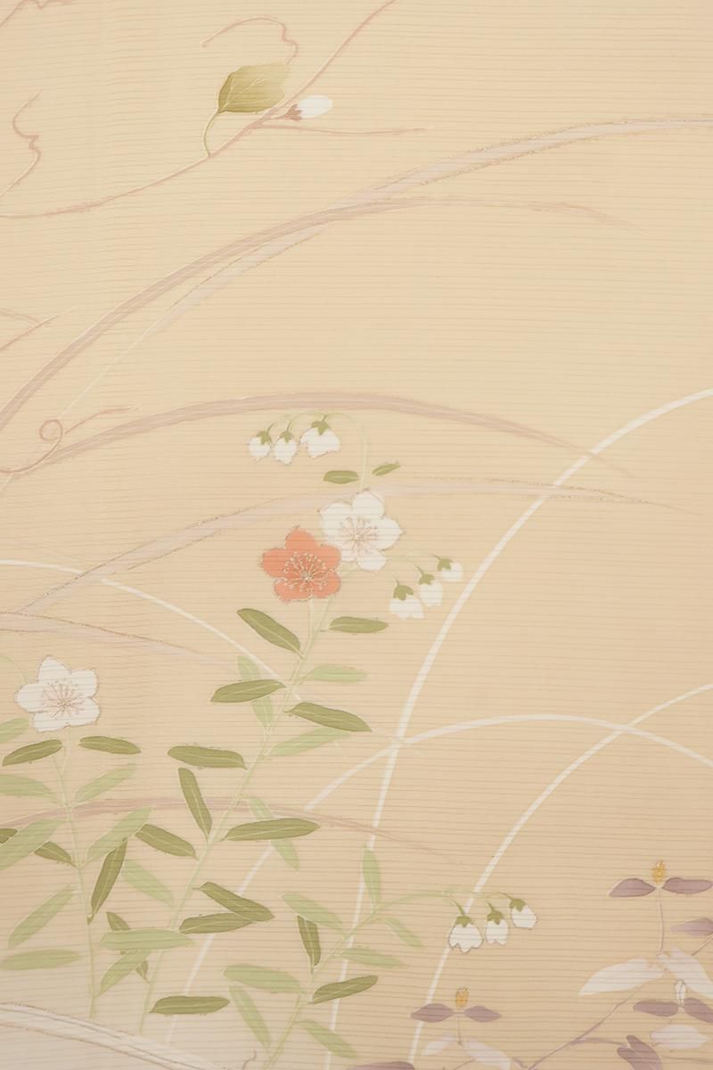 やや明度を上げた桑色が近いでしょうか、ベージュの地にゆったりとした流水に野の花の図を描いた絽の付下げです。女性らしいお色目に繊細な筆致で描かれた花々がしっとりと上品な印象のお品、それぞれの草花が見せる、楚々として奥ゆかしげな表情が着る方の気品を引き立ててくれますね。どなたにも好感度の高く、エレガントな印象の装いをお楽しみ頂けることと思います。夏のお呼ばれや改まったお席などにいかがでしょうか。