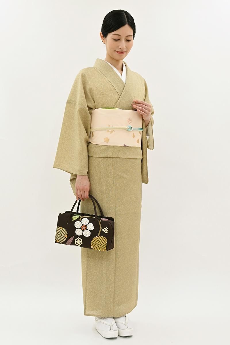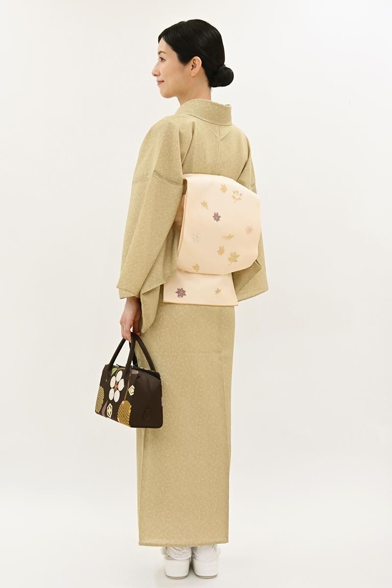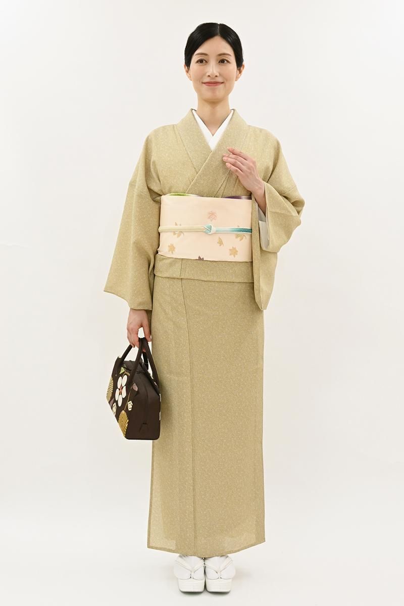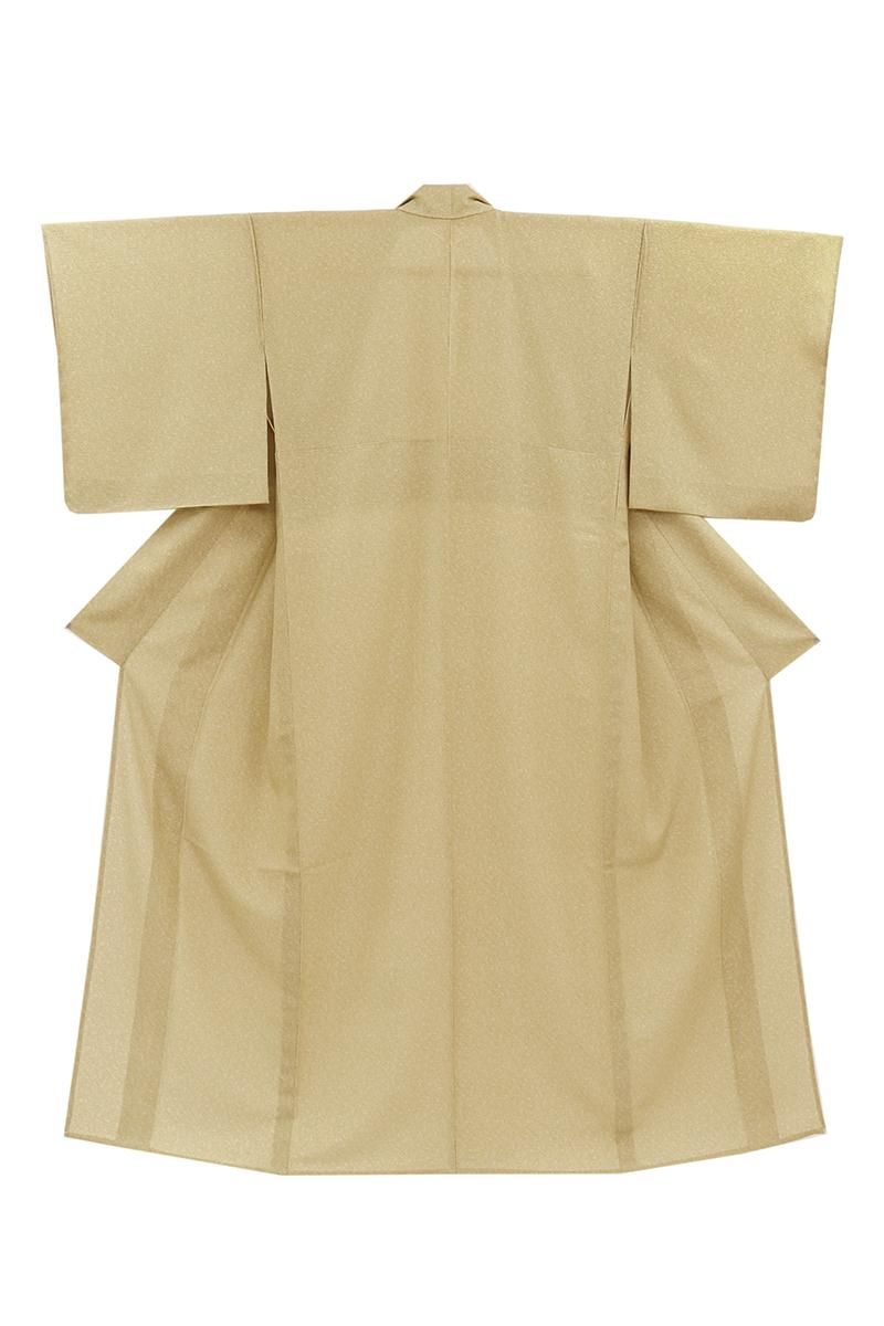 木蘭色が近いでしょうか、灰みのイエローベージュの地に、細やかな南天を染めた絽の江戸小紋です。「難を転ずる」にかけた吉祥文様としても親しまれている南天、ベーシックな柄ゆきは幅広い場面に重宝にお召しいただけますね。やさしいお色目も装いをしっとりと引き立ててくれることと思います。この機会にいかがでしょうか。
