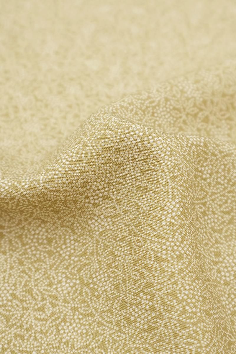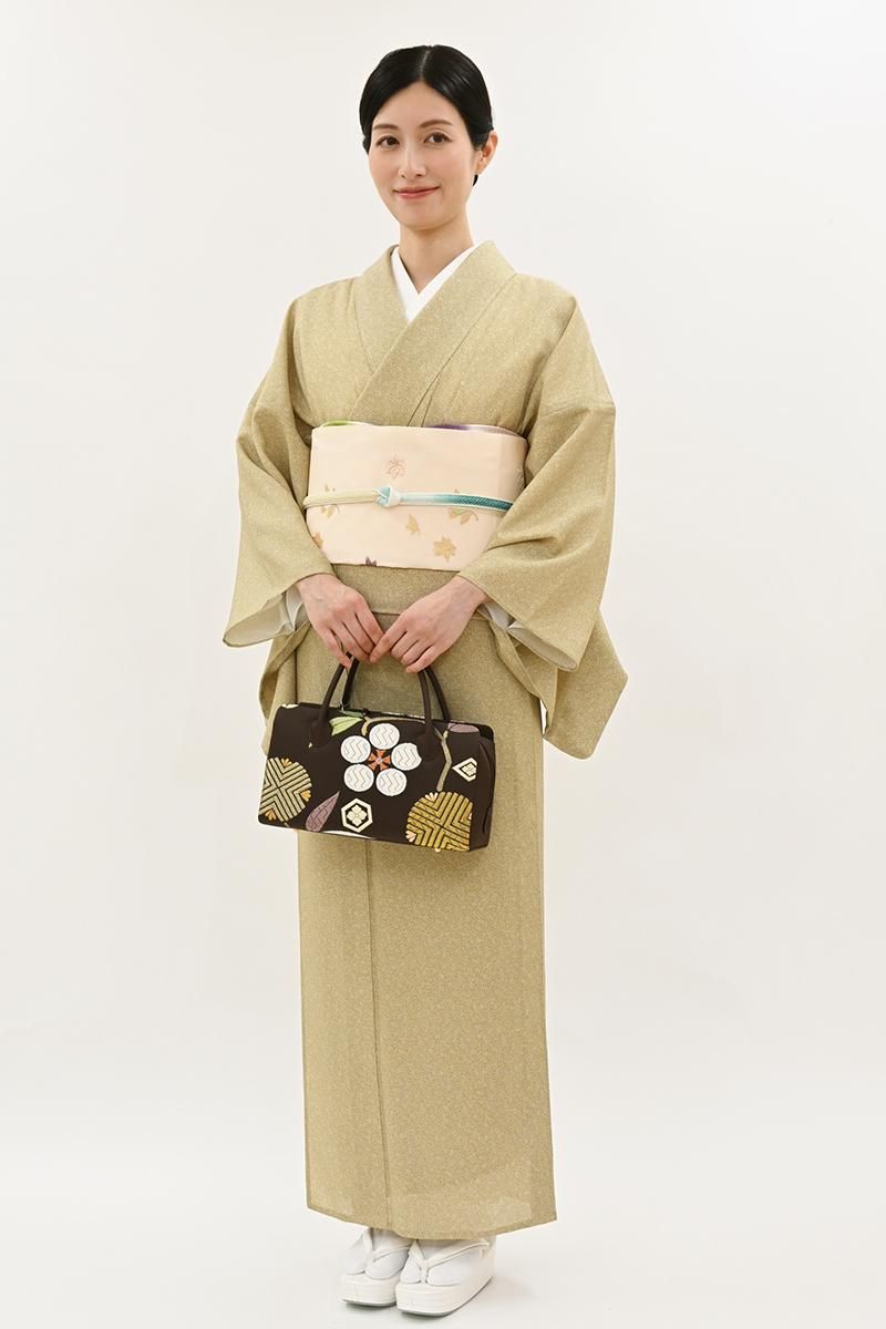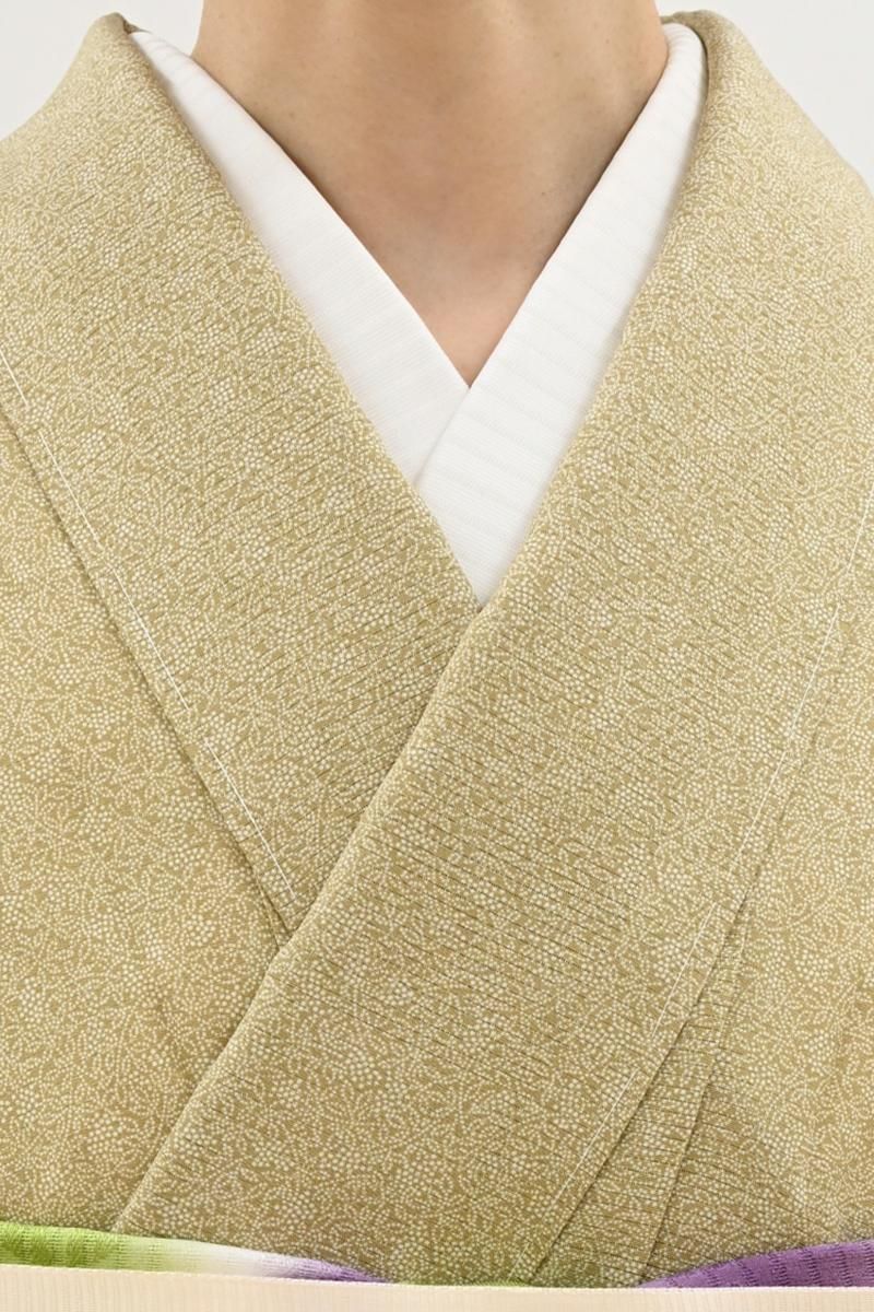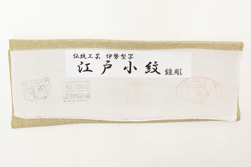 木蘭色が近いでしょうか、灰みのイエローベージュの地に、細やかな南天を染めた絽の江戸小紋です。「難を転ずる」にかけた吉祥文様としても親しまれている南天、ベーシックな柄ゆきは幅広い場面に重宝にお召しいただけますね。やさしいお色目も装いをしっとりと引き立ててくれることと思います。この機会にいかがでしょうか。