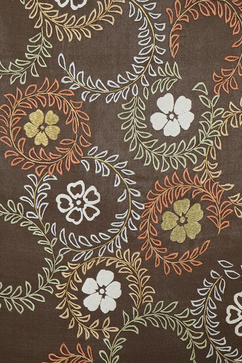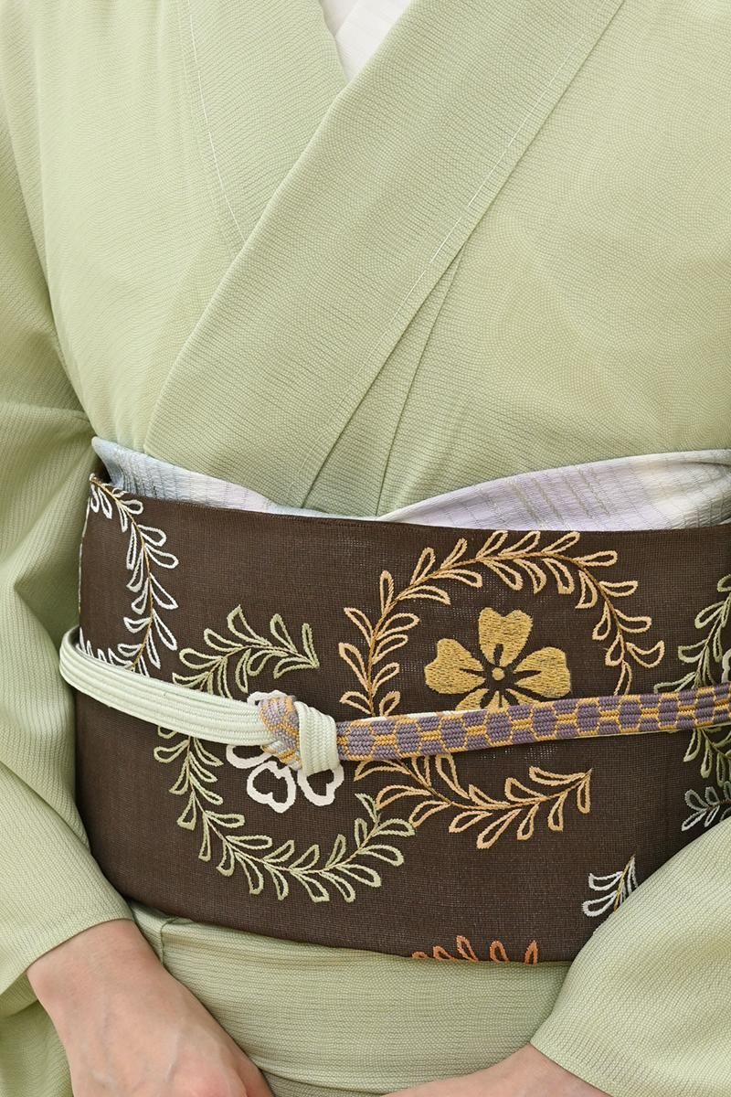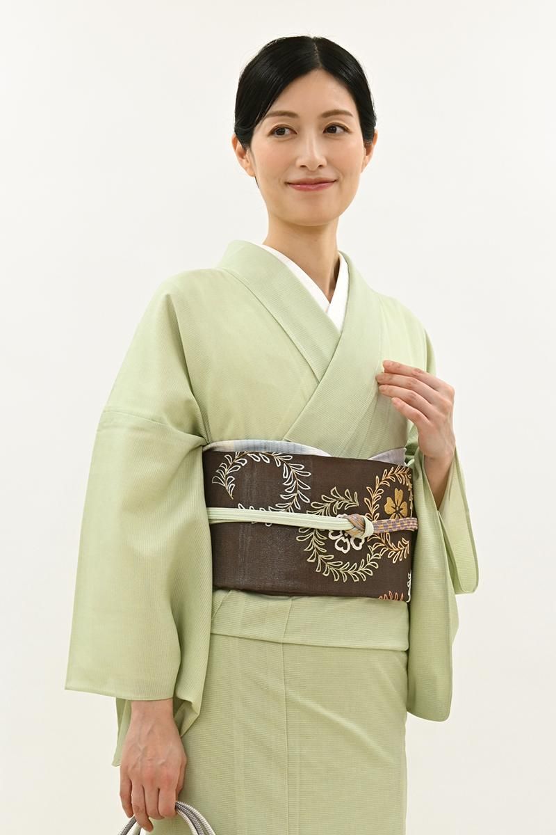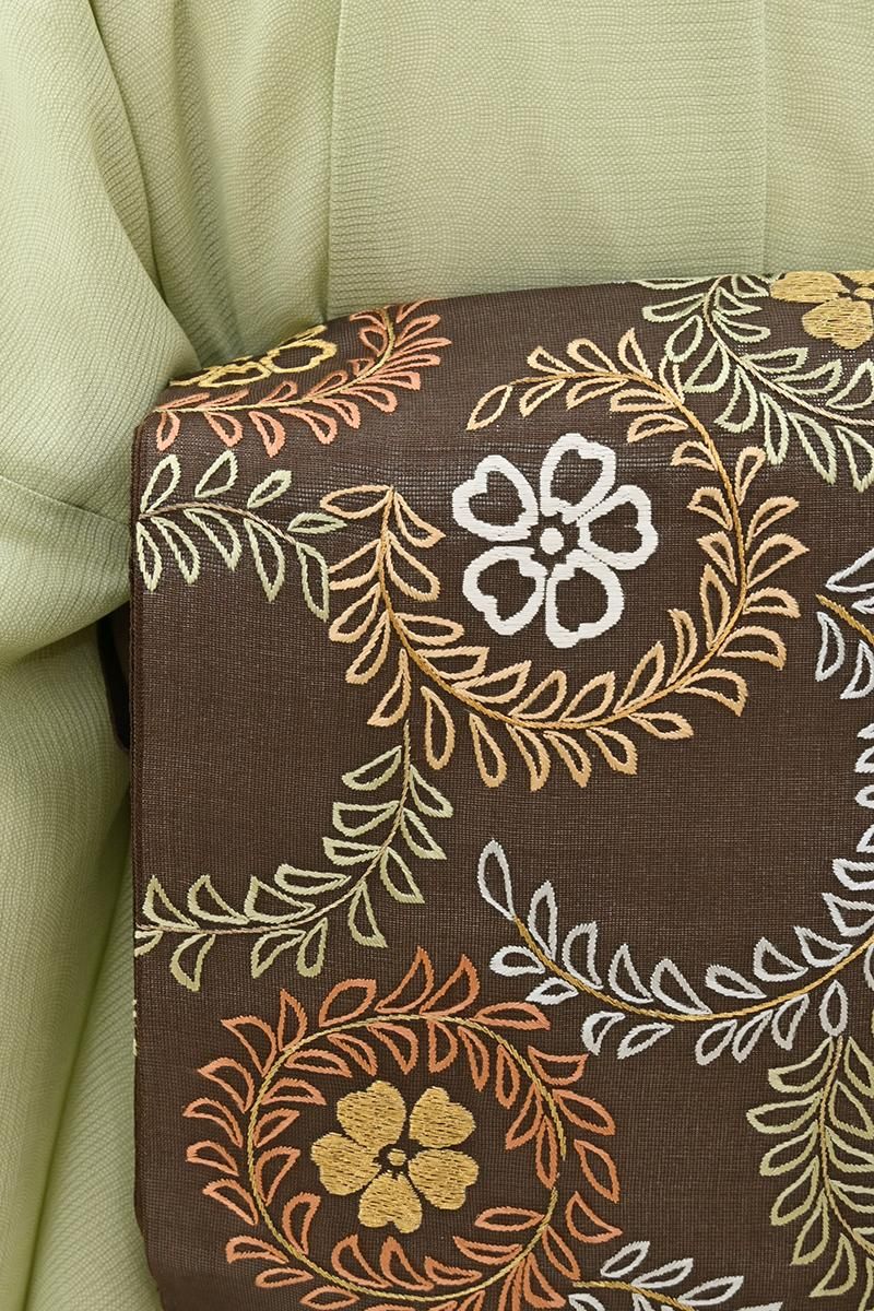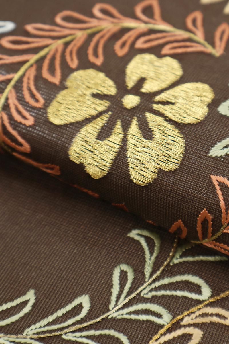 マルーン色が近いでしょうか、ほんのり赤みを含んだごく深い茶色の地に、優雅な曲線を描く花唐草文を織り出した夏の袋帯です。透け感のあるしゃりっとした地風に、モダンな色遣いで表現されたモチーフが華やかに映えるお品、ぐっとシックなお色目は合わせるお着物の色柄を選ばず、装いをきりりと引き立ててくれそうですね。色無地や付け下げなどに合わせて、お茶席やお呼ばれなどの改まった場面にいかがでしょうか。