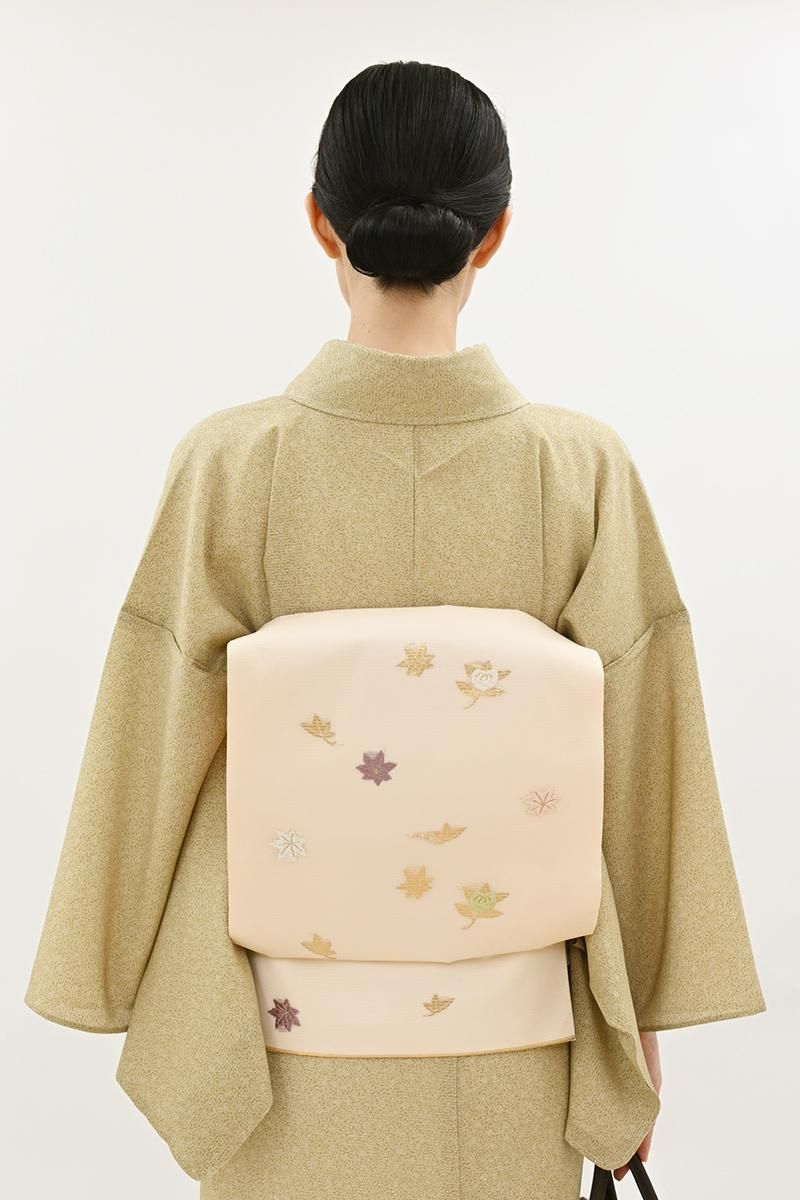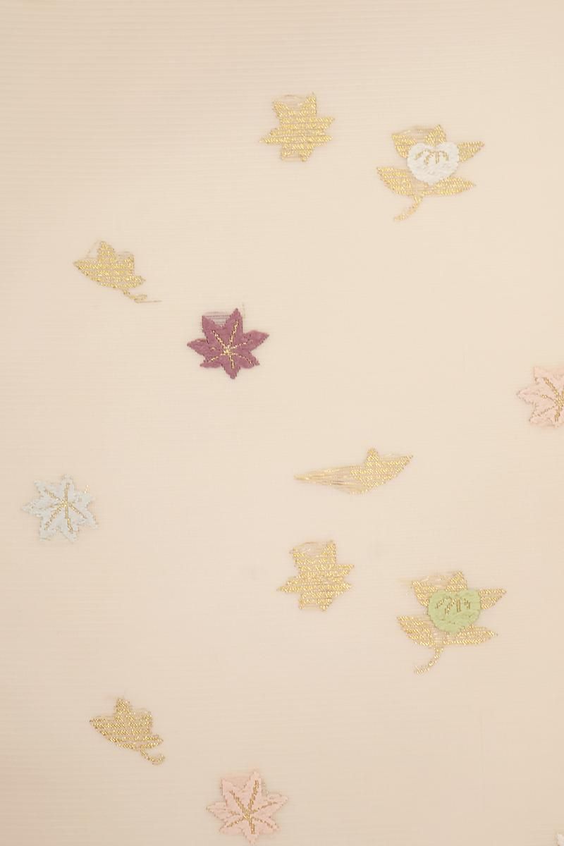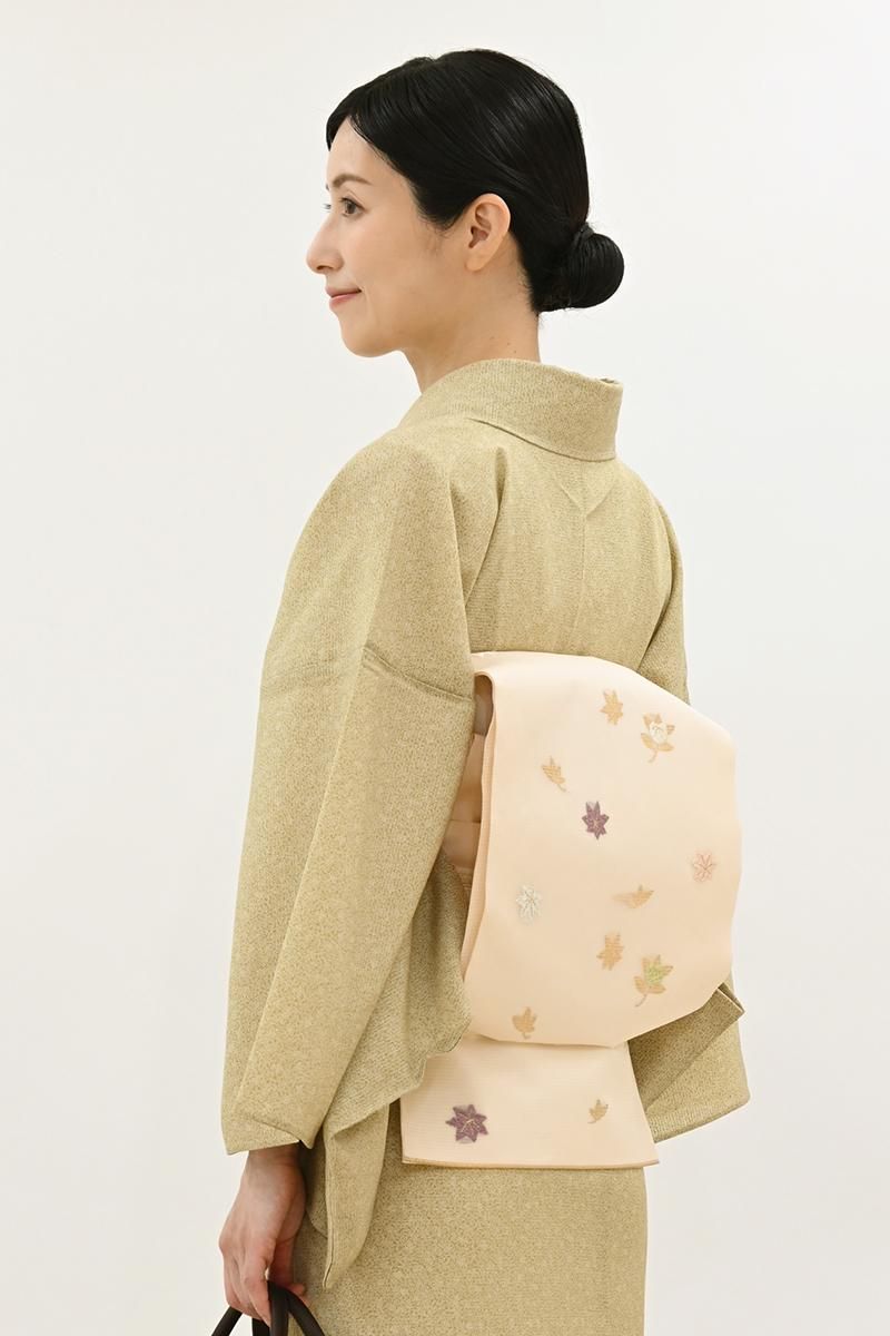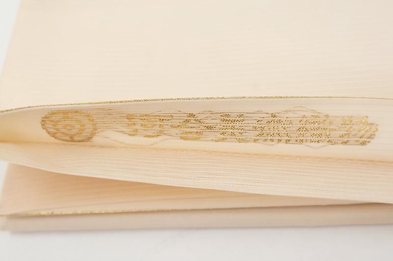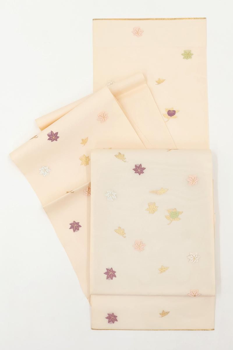 やや色を薄めたシェルピンク色が近いでしょうか、透け感ゆたかな薄手の地に、ふっくらとした唐織で楓や橘の図を配したお品、明るい金糸のきらめきが華やぎを添え、装いをしっとりと引き立ててくれることと思います。色無地や江戸小紋、付下げなどに合わせて夏のお呼ばれにいかがでしょうか。