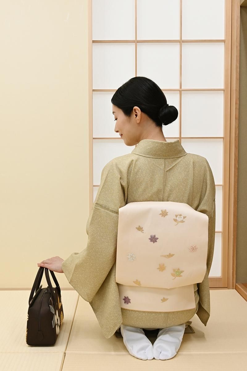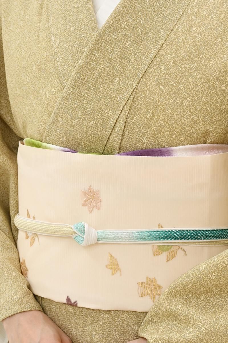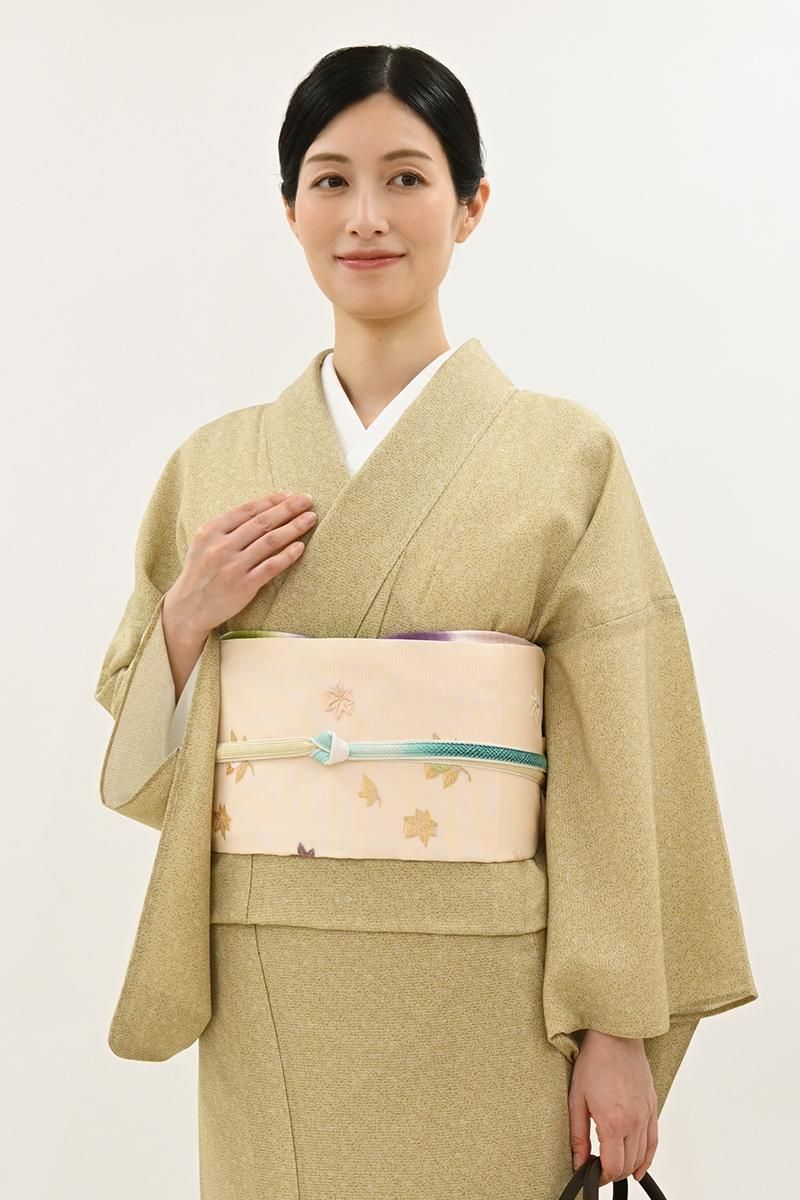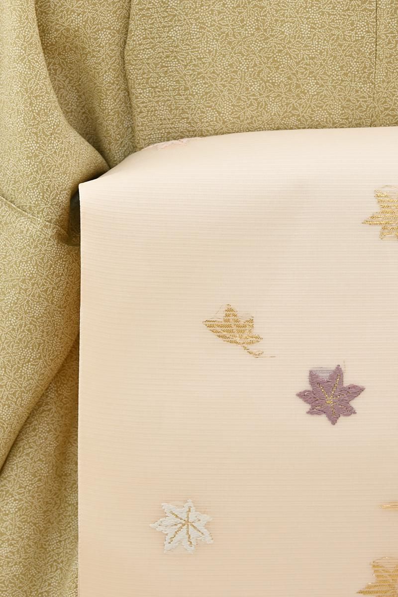 やや色を薄めたシェルピンク色が近いでしょうか、透け感ゆたかな薄手の地に、ふっくらとした唐織で楓や橘の図を配したお品、明るい金糸のきらめきが華やぎを添え、装いをしっとりと引き立ててくれることと思います。色無地や江戸小紋、付下げなどに合わせて夏のお呼ばれにいかがでしょうか。