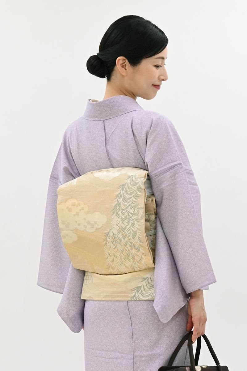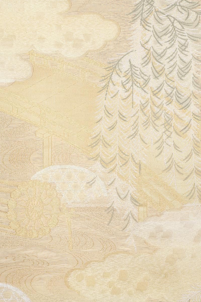 鳥の子色が近いでしょうか、灰みを含んだベージュの地に、雲に柳、橋や蛇籠など水辺の風景を織り出した紗の袋帯です。さっくりとした地風に風流な水辺の風景が涼やかな景色を創るお品、抑えた色遣いと金銀糸の煌めきが全体を華やかに引き立てていますね。色無地や付下げ、訪問着などに合わせて、夏のお呼ばれや改まったお席など、様々な場面でお楽しみくださいませ。