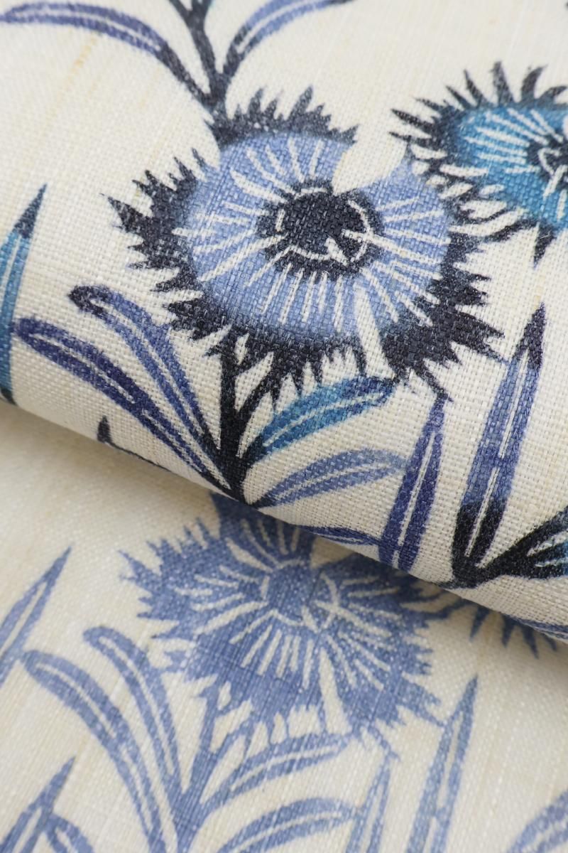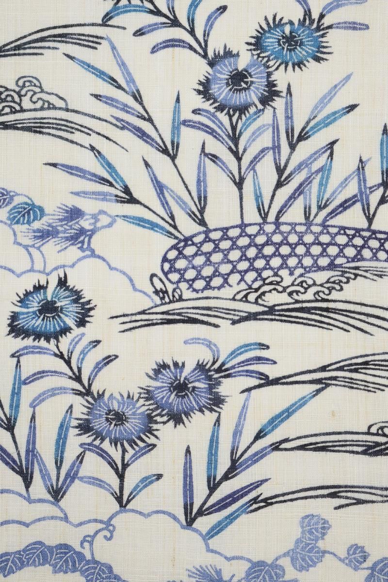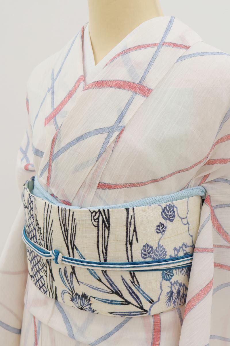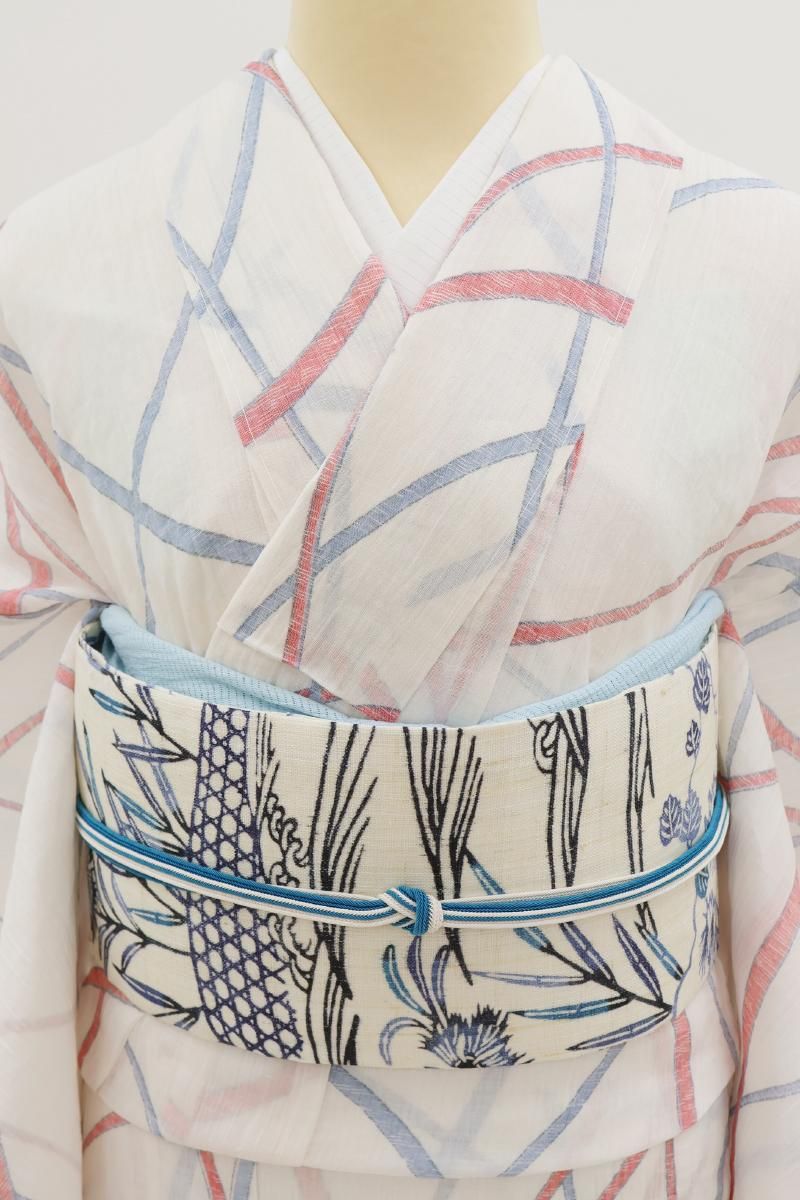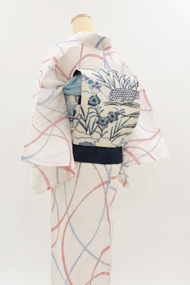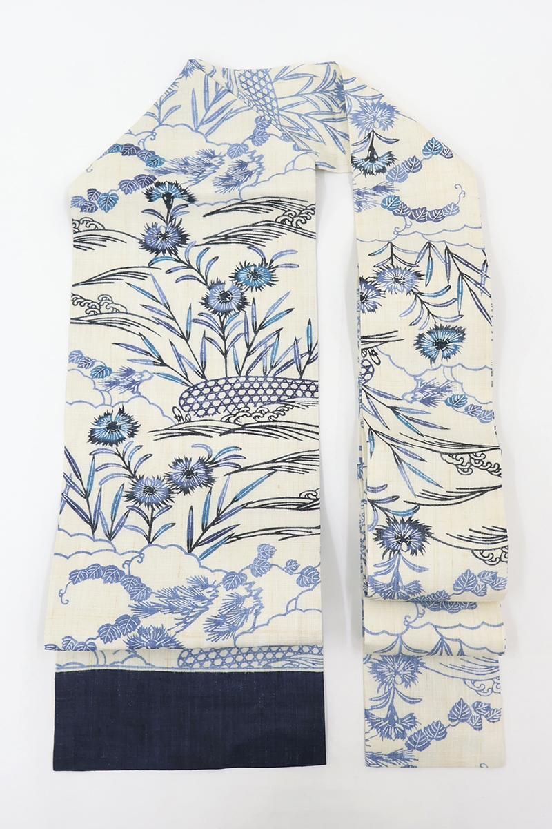 京都の山懐にて和染紅型の名で洗練された型染めの着物や帯を創り続ける「栗山工房」製の染名古屋帯です。こちらはざっくりとしたオフホワイトの麻地に、青色系の彩りで蛇籠の置かれた水辺に撫子などを配したお品、涼やかで落ち着いた彩りの冴えが、栗山工房さんらしい存在感を備えていますね。よそゆきの浴衣から夏紬、小紋などに合わせてすっきりと趣味性豊かな装いをお楽しみくださいませ。