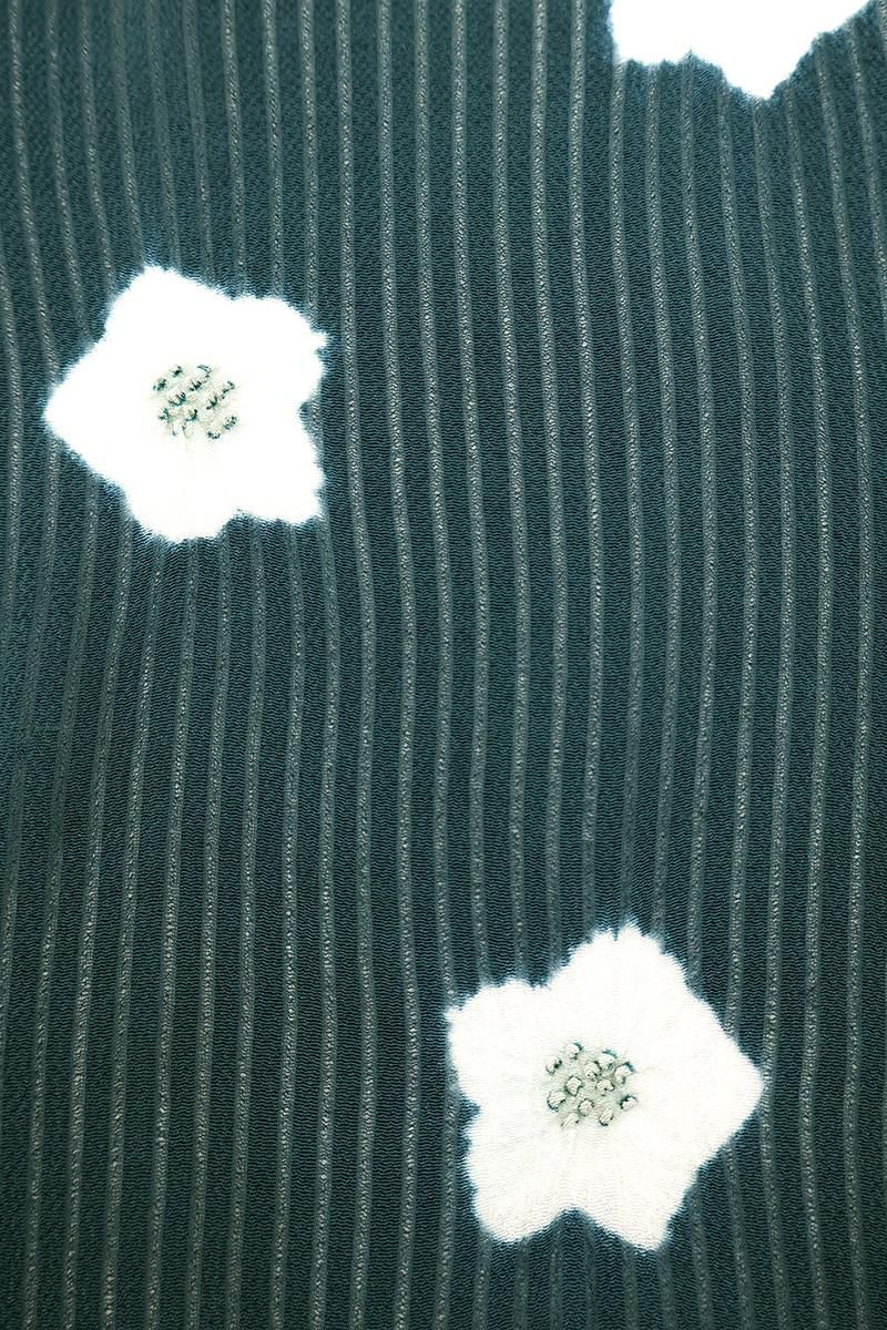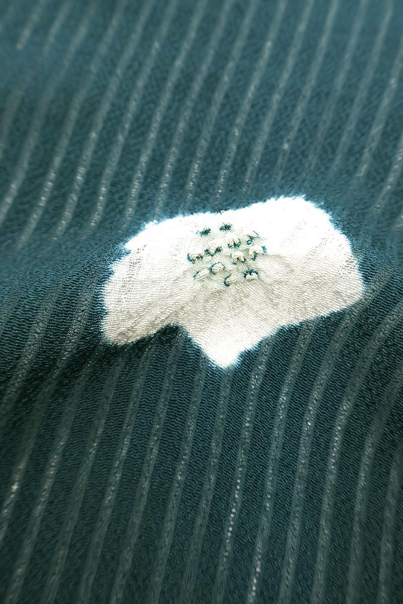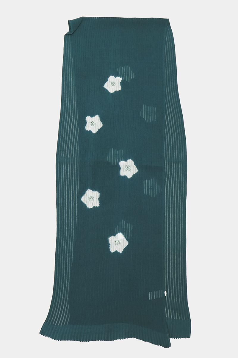 半衿や帯締めなど、きものまわりの小物の老舗として定評ある京都・衿秀製の帯揚げです。シボ感のある絽縮緬地に絞り染めで桔梗を描いたお品、上質な絽縮緬ならではの涼やかな感触が爽やかですね。こちらは濃い青緑色の地と白い桔梗の花のコントラストが印象的な一枚、カジュアルな装いに程よい愛らしさと洒落みを添えて引き立ててくれることと思います。単衣時期のお出かけに、涼やかな一枚をいかがでしょうか。
