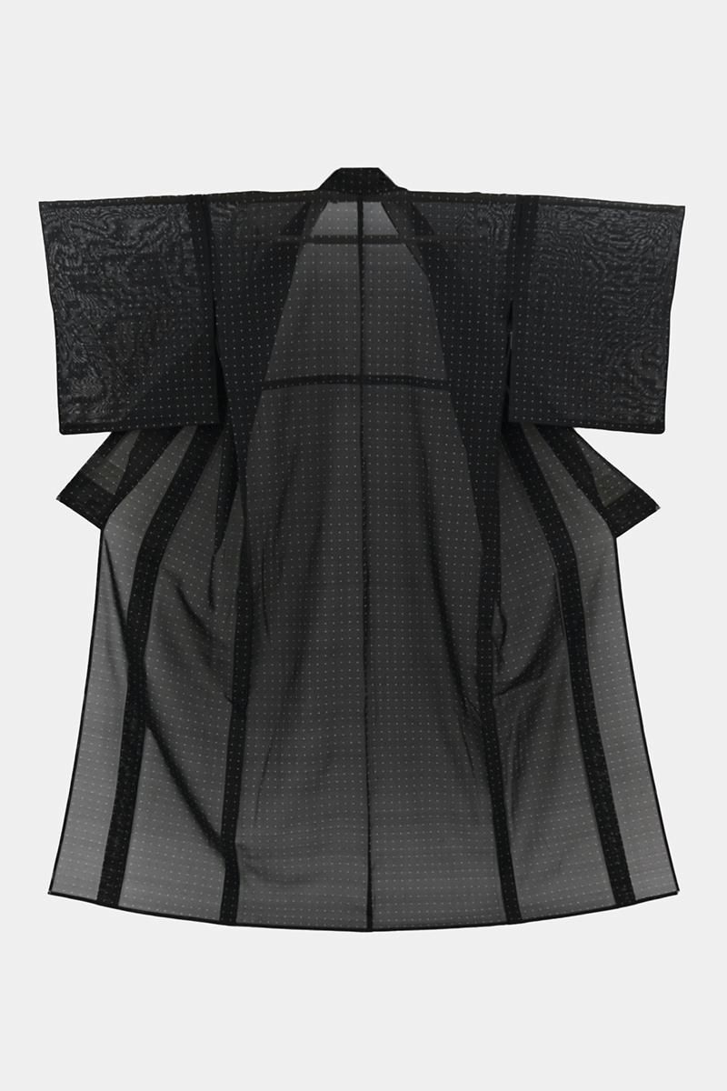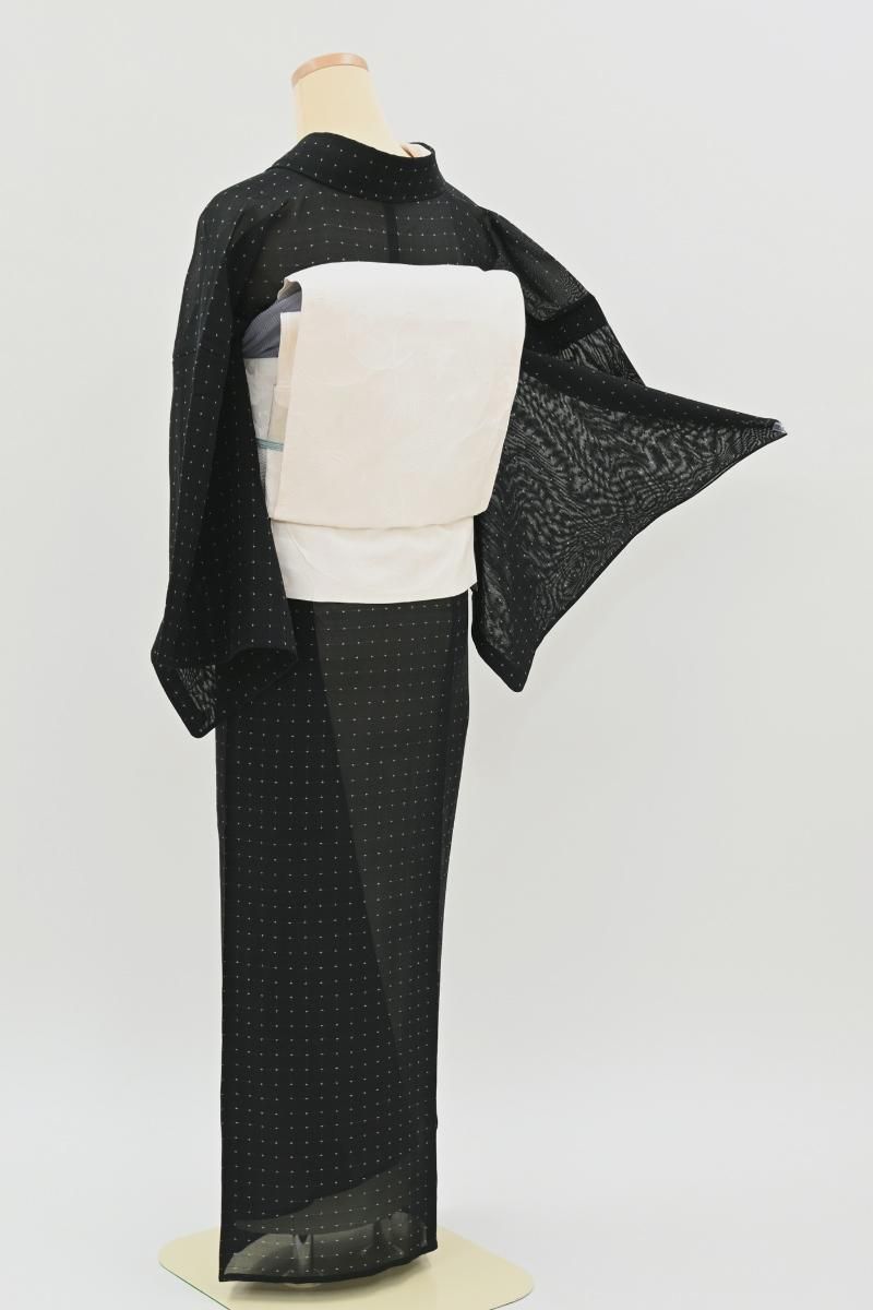 シンプルな景色が合わせる帯を選ばず、季節の染め帯から素材の味わい豊かな八寸など、幅広い帯合わせでお楽しみ頂けるベーシックな一品、しゃりっとした手触りを備えたごく薄手の風合いに加えて、白い襦袢をほのかに透かす濃色の地がいっそう涼やかな風情を引き立てていますね。夏の装いの定番として活躍してくれることと思います。この機会にいかがでしょうか。