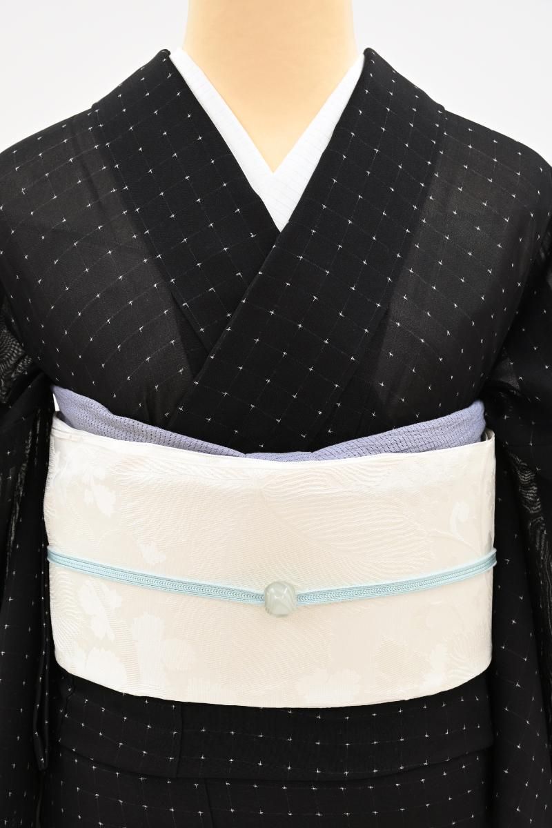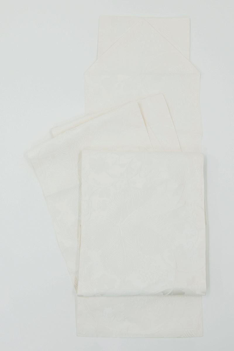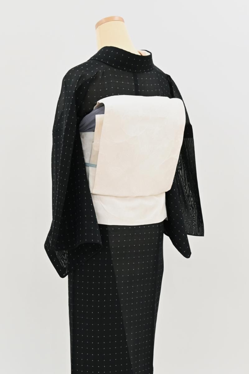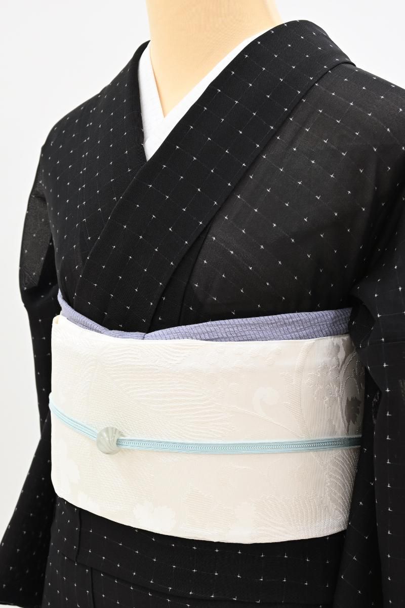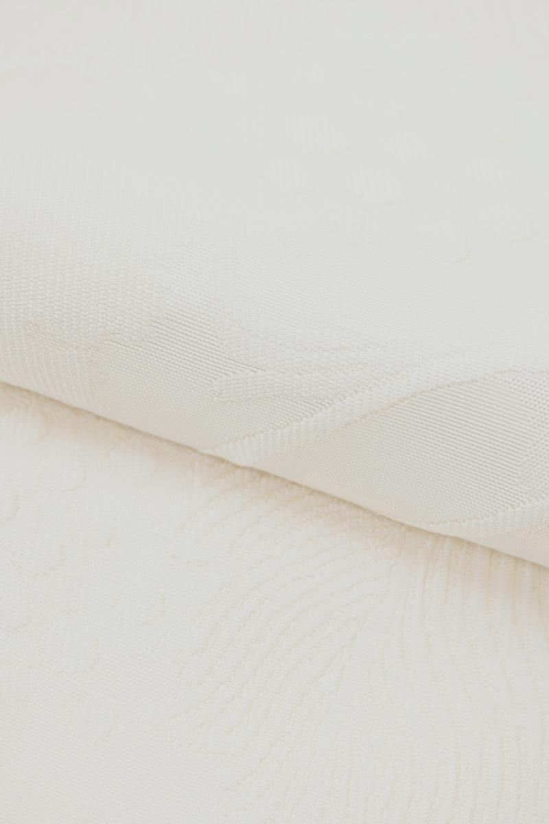 こちらはオフホワイトの地に、おおらかな葡萄唐草文を織り出したお品、同系の彩りが上品な印象で装いをすっきりとまとめあげてくれそうですね。薄手ながら打ち込みの良い博多独特のしなやかでぱりっとした地風は、お使い頂く季節を問いません。浴衣から紬、小紋など様々なお着物に合わせてお出かけなどにいかがでしょうか。