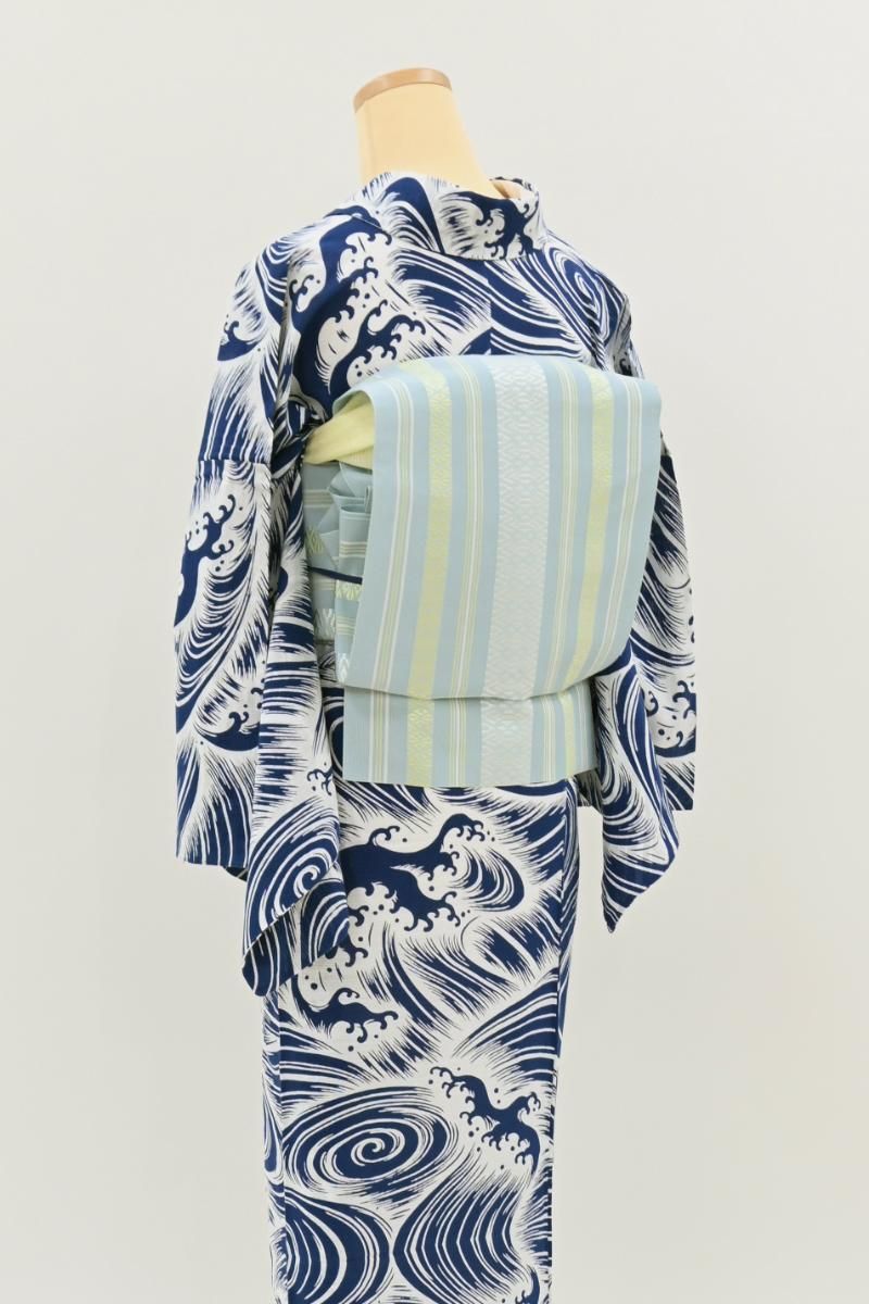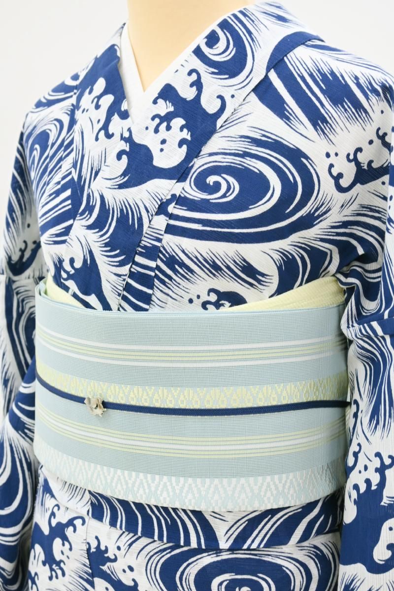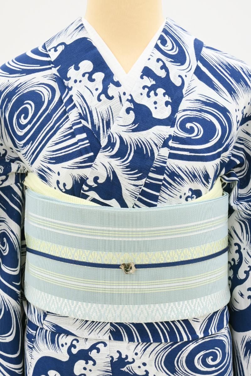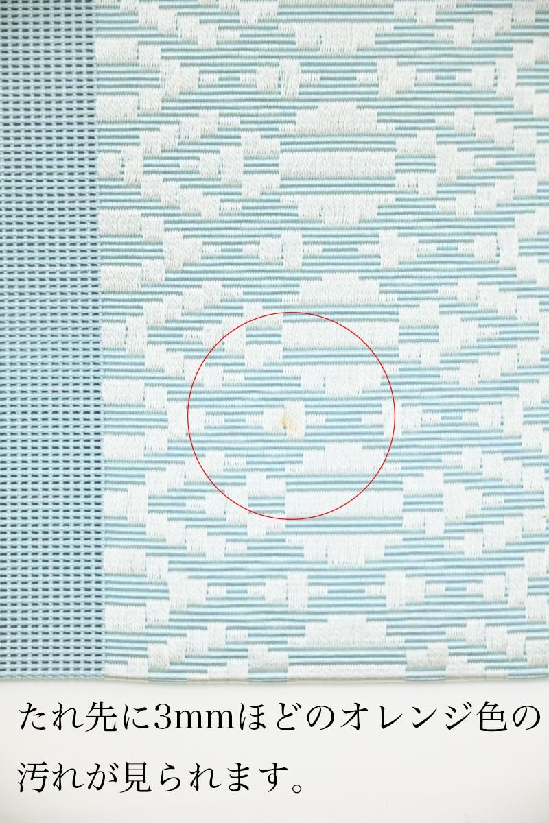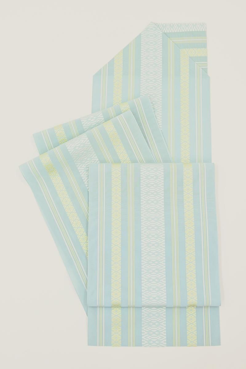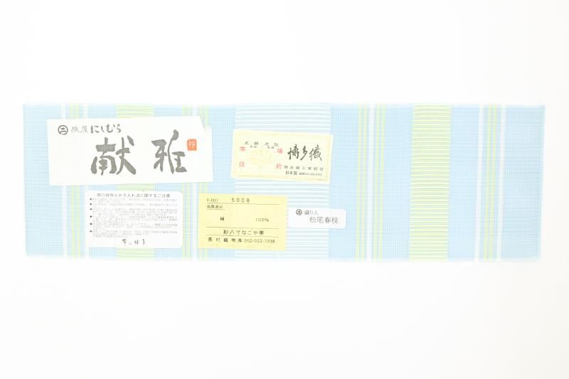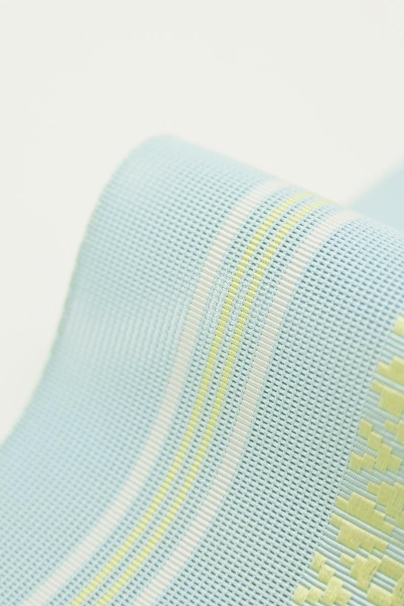 こちらはやや色を薄めたわすれなぐさ色が近いでしょうか、水色の紗地に白や淡い黄色で献上柄を織り出したお品、爽やかなお色目が夏の装いにすっきりとした清涼感を添えてくれそうですね。シンプルな一色のみの帯は合わせる着物の色柄も幅広く、浴衣から紬、小紋などに合わせて上質な博多織ならではの締め心地の良さをお楽しみいただけることと思います。ぜひこの夏のお支度にいかがでしょうか。