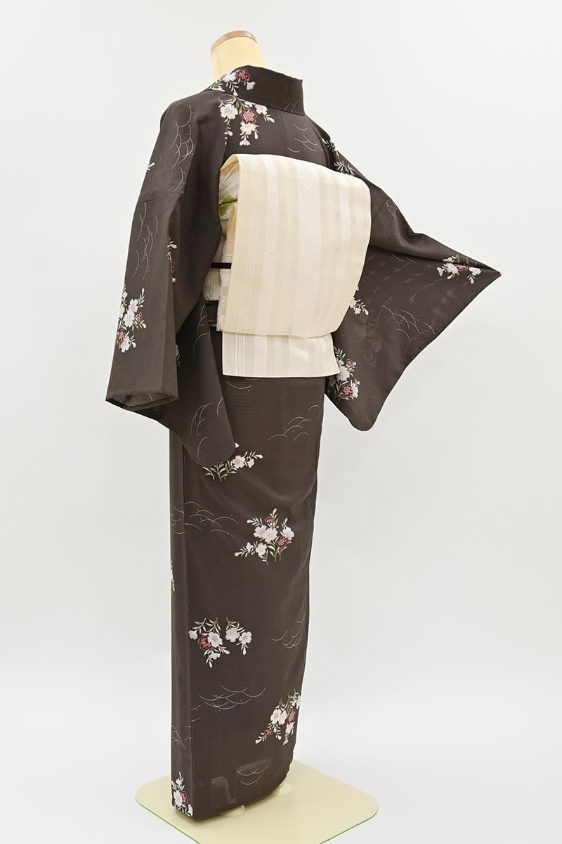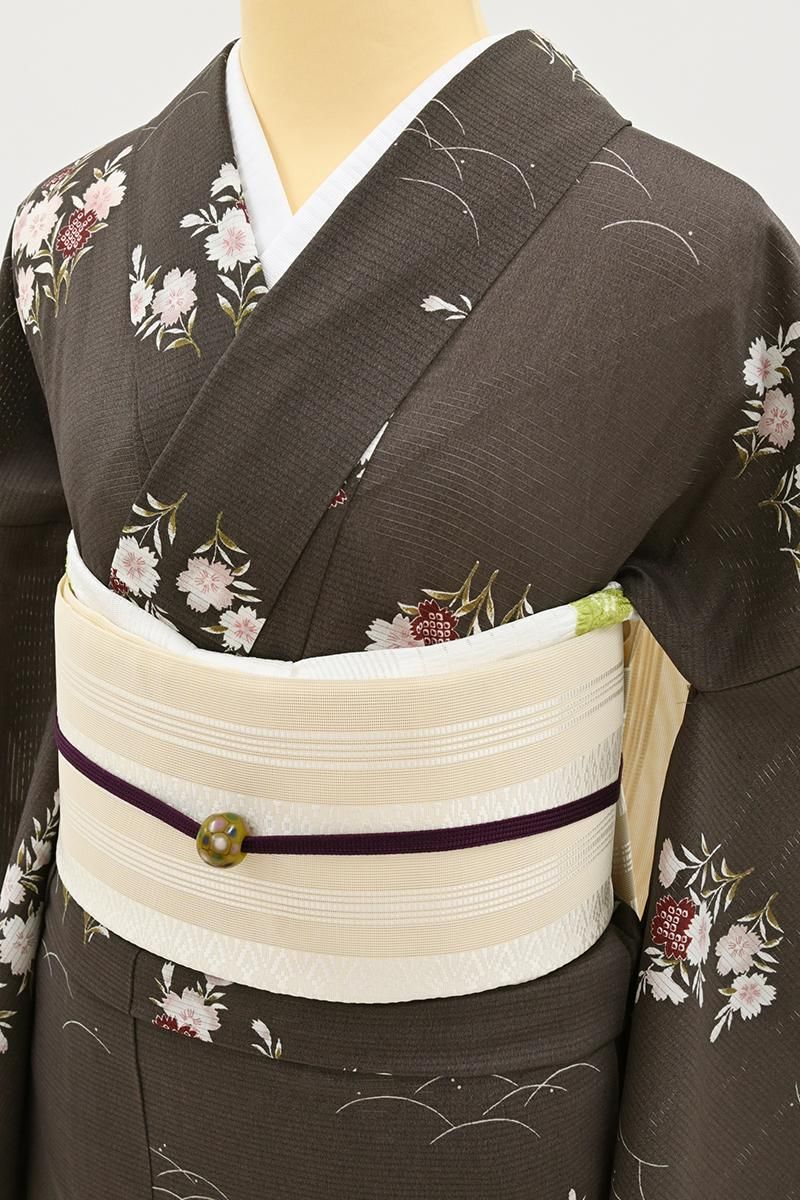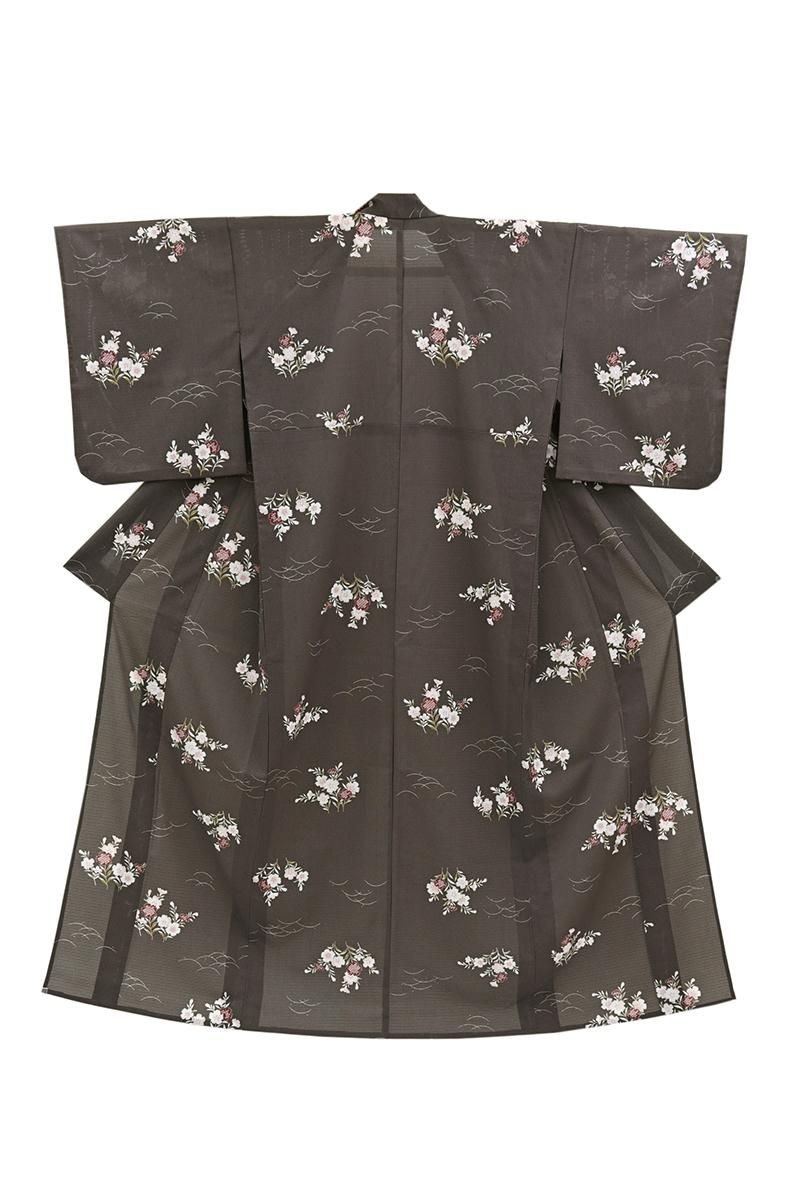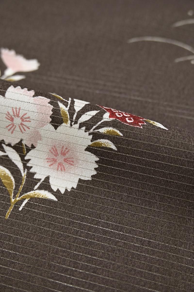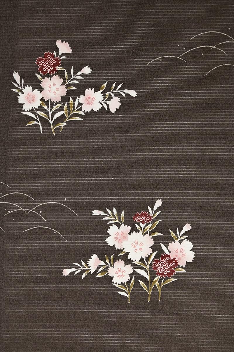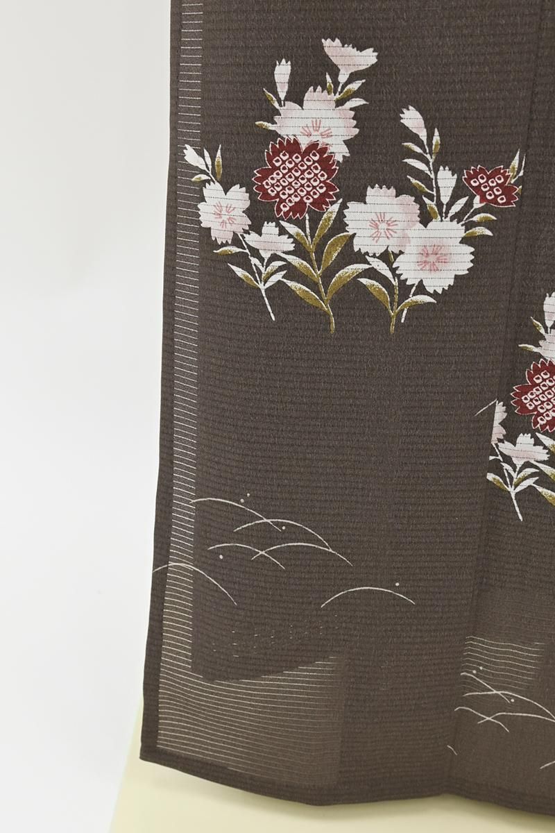 ココア色が近いでしょうか、ほんのり灰みの焦茶色系の地に、撫子や露芝の図を描いた絽の小紋です。こちらはシックなお色目に、はんなりとした彩りで描かれたモチーフが品良い甘さを備えたお品、着姿に大人の愛らしさを添えて引き立ててくれることと思います。様々な帯合わせで、これからの季節のおでかけやちょっとしたお呼ばれなどにいかがでしょうか。