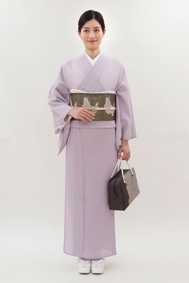やや明度を上げた浅紫色が近いでしょうか、淡い薄紫色の地に、万筋を配した絽の江戸小紋です。