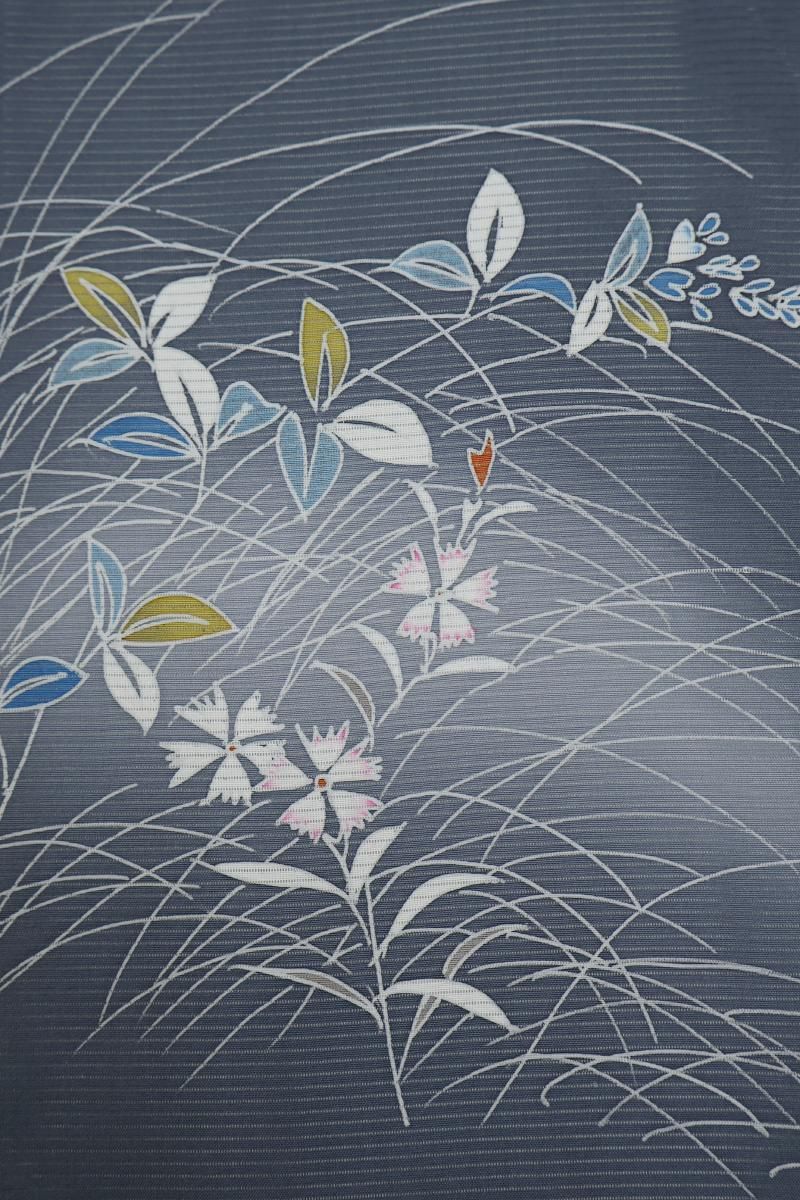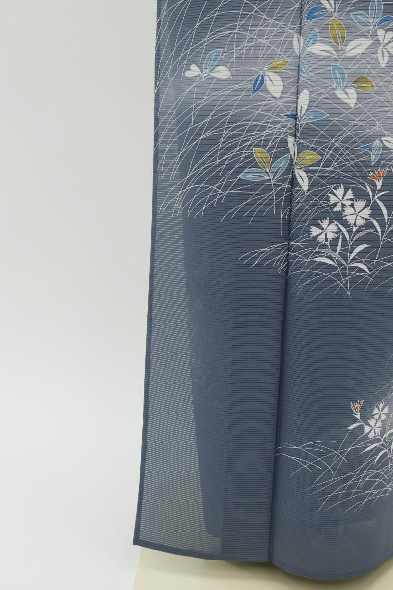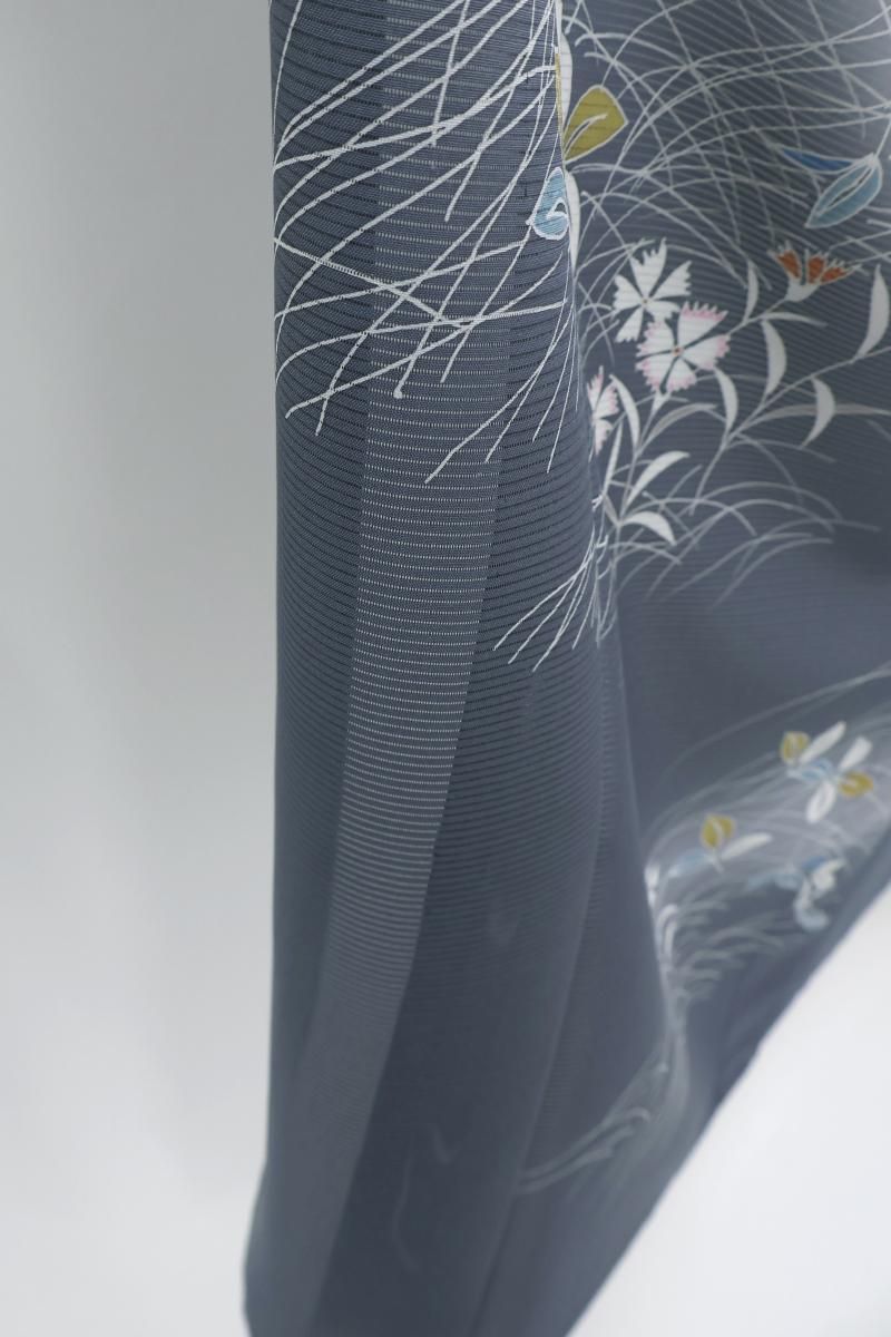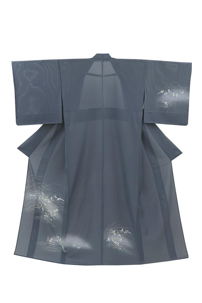 紺鼠色が近いでしょうか、青みの深いグレーの地に、芒や撫子など秋草文を伸びやかに描いた絽の付下げです。透け感豊かなシックなお色目に、優しい彩りで表現された意匠がすっと目を惹くお品、秋の気配漂う景色がしっとりと涼やかな表情を見せていますね。見る人にも涼をもたらす夏衣、風情ある装いをお楽しみくださいませ。