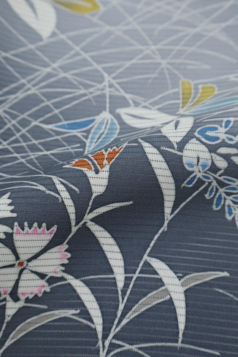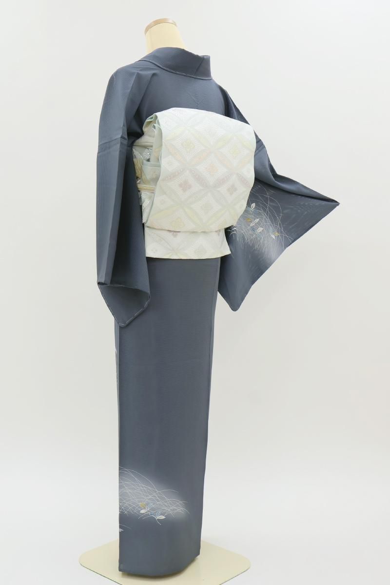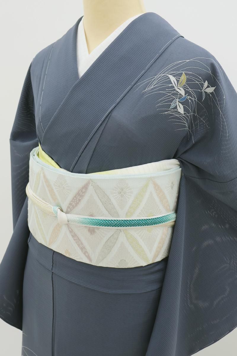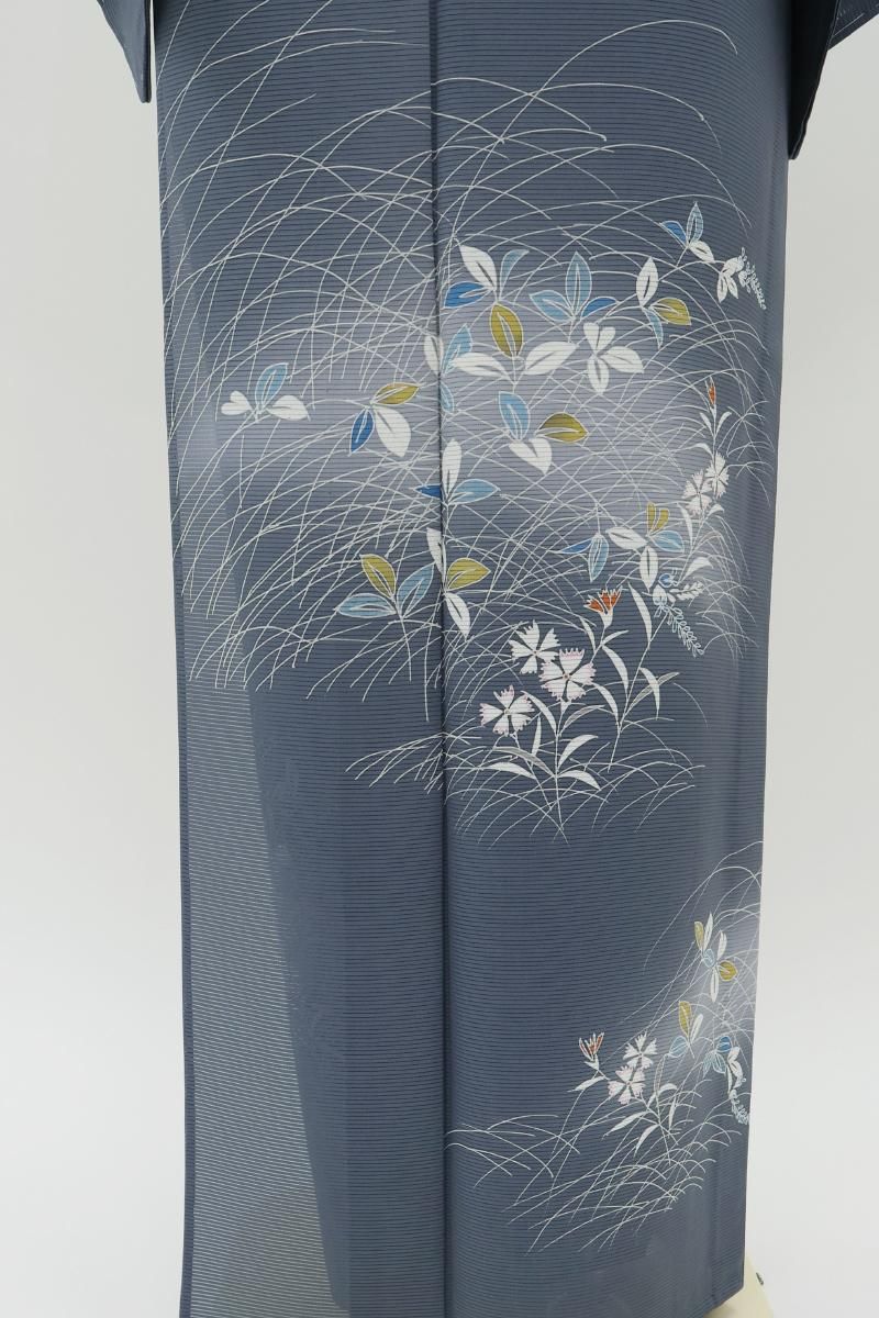 紺鼠色が近いでしょうか、青みの深いグレーの地に、芒や撫子など秋草文を伸びやかに描いた絽の付下げです。透け感豊かなシックなお色目に、優しい彩りで表現された意匠がすっと目を惹くお品、秋の気配漂う景色がしっとりと涼やかな表情を見せていますね。見る人にも涼をもたらす夏衣、風情ある装いをお楽しみくださいませ。