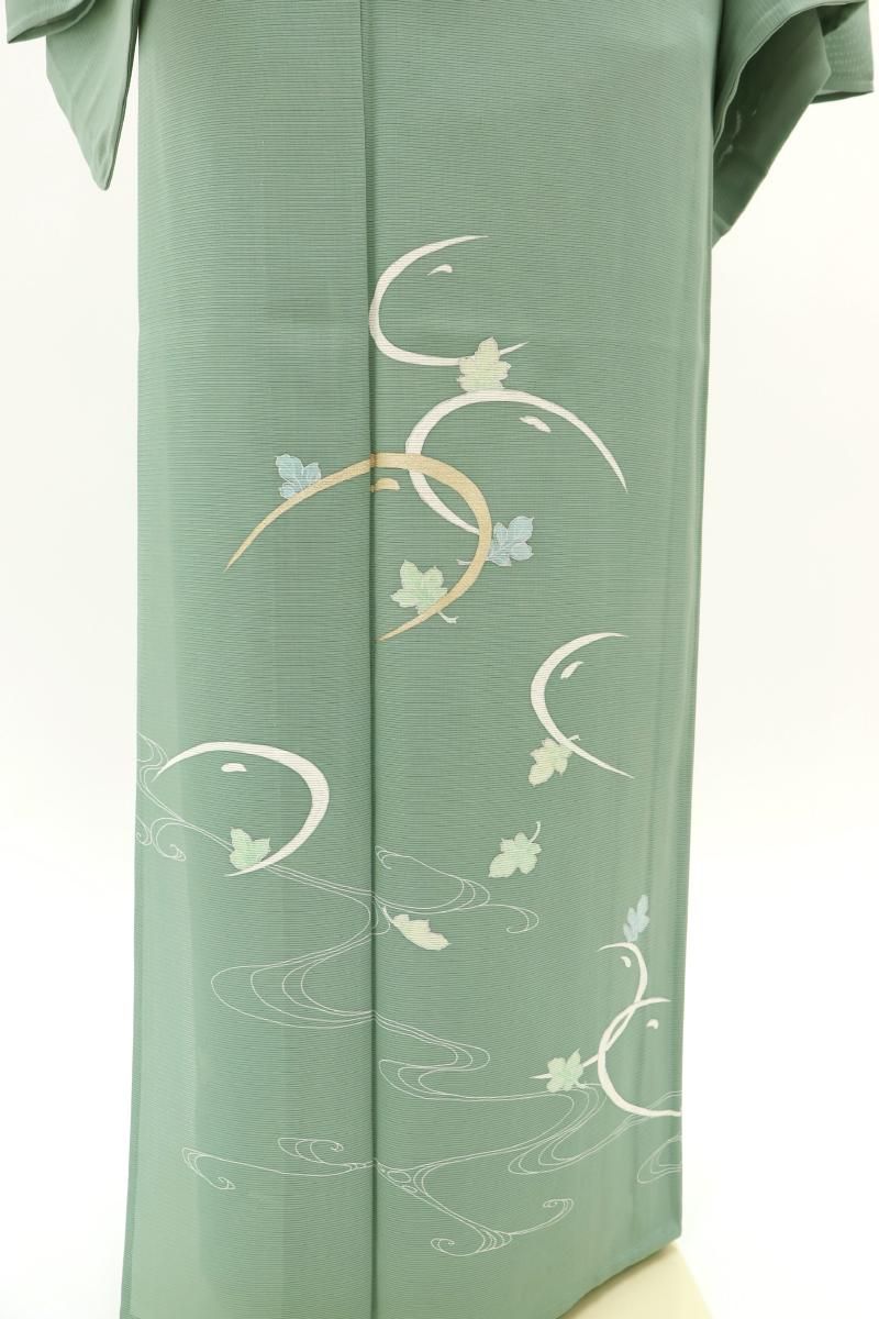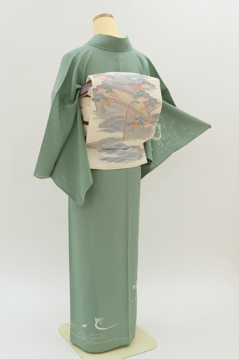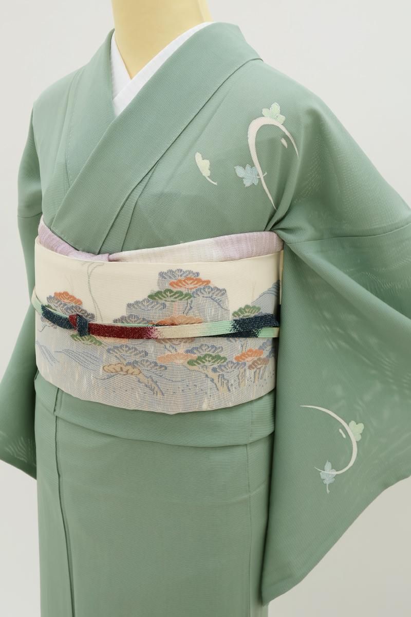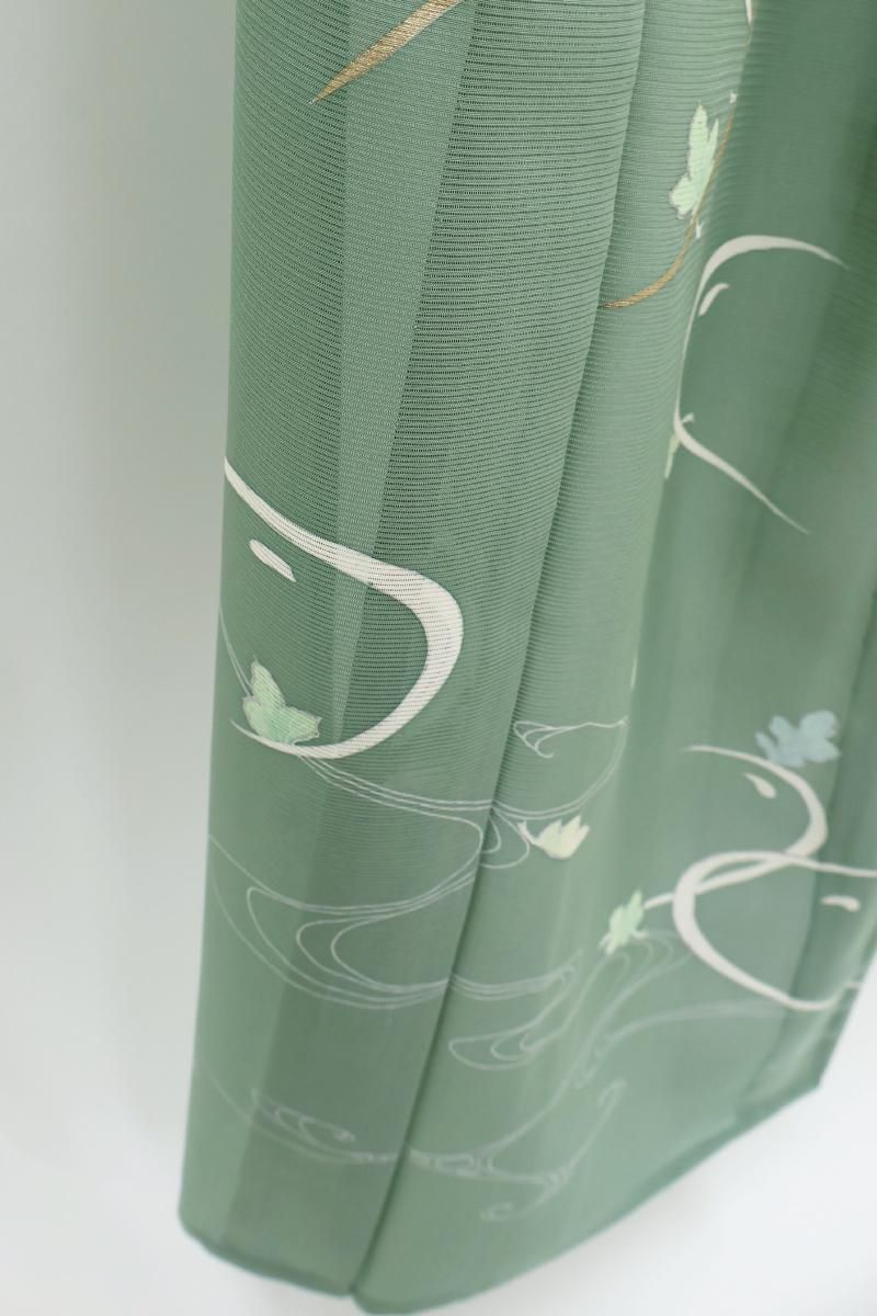 山葵色が近いでしょうか、灰みの薄緑色の地に、弧を描く抽象的な文様や流水、植物の図を描いた絽の付下げです。さらりとした地風にシンプルに描かれた意匠が風雅な印象のお品、一歩控えた穏やかなお色目に品の良さが薫りますね。金銀彩のほんのりとした煌めきがさりげない気品を添え、装いをしっとりと引き立ててくれることと思います。季節感豊かな夏の社交着、この機会にいかがでしょうか。
