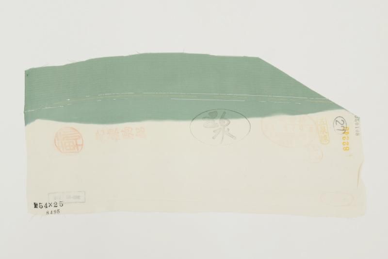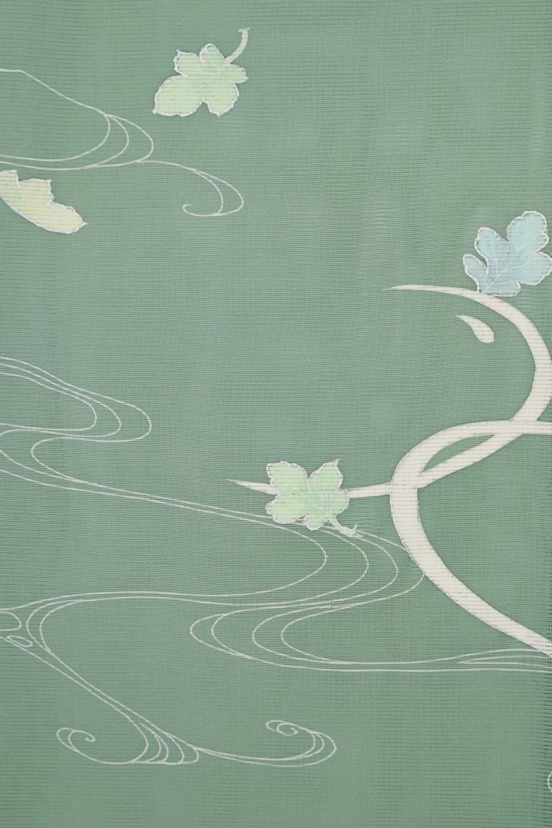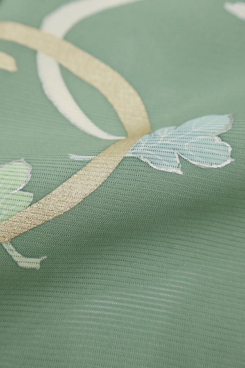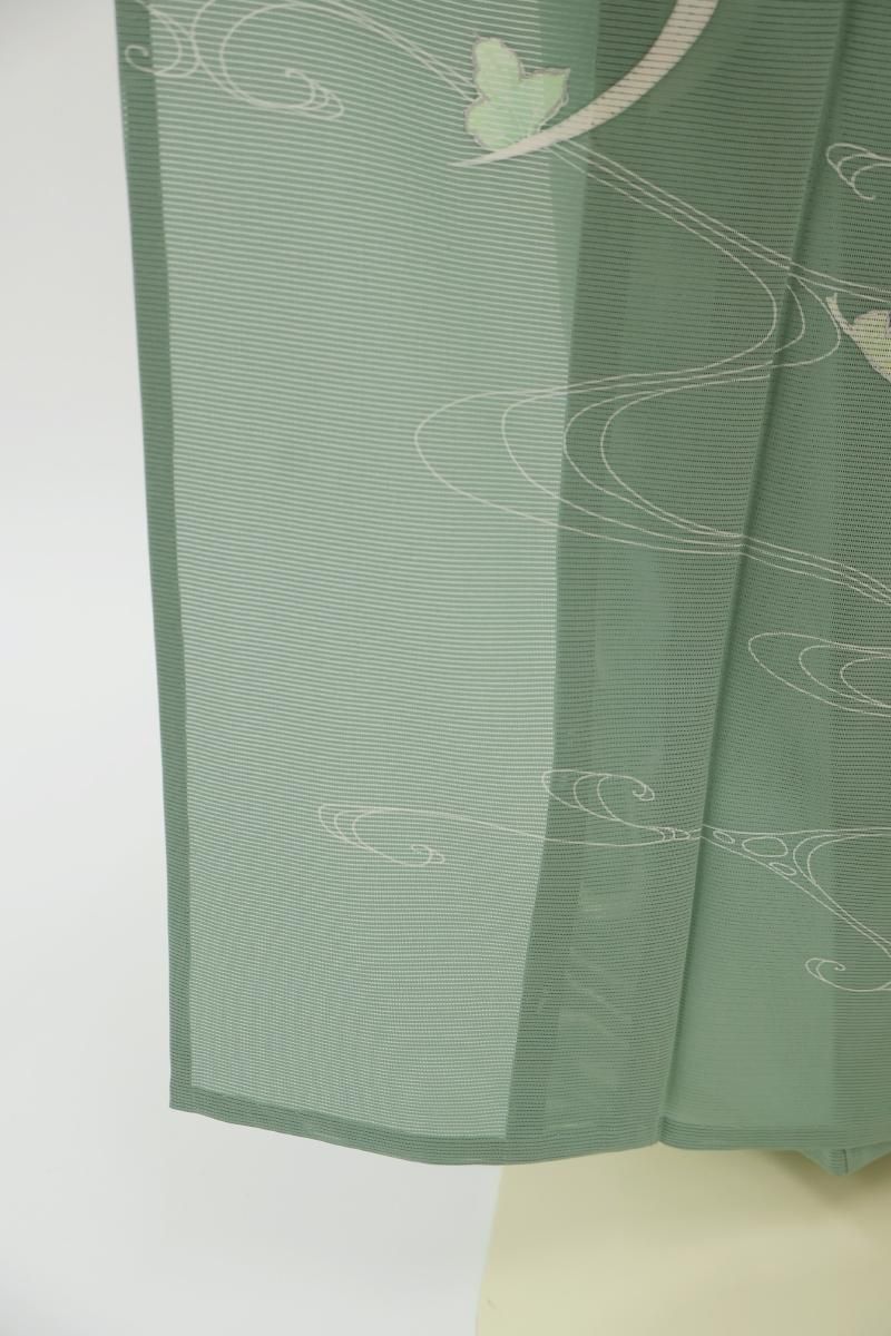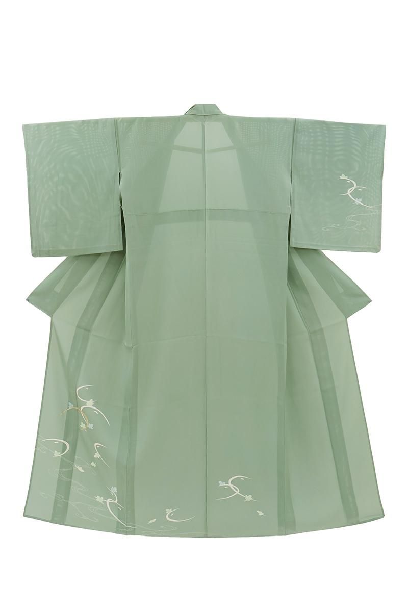 山葵色が近いでしょうか、灰みの薄緑色の地に、弧を描く抽象的な文様や流水、植物の図を描いた絽の付下げです。さらりとした地風にシンプルに描かれた意匠が風雅な印象のお品、一歩控えた穏やかなお色目に品の良さが薫りますね。金銀彩のほんのりとした煌めきがさりげない気品を添え、装いをしっとりと引き立ててくれることと思います。季節感豊かな夏の社交着、この機会にいかがでしょうか。
