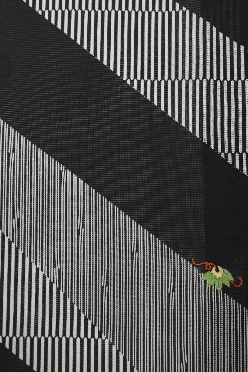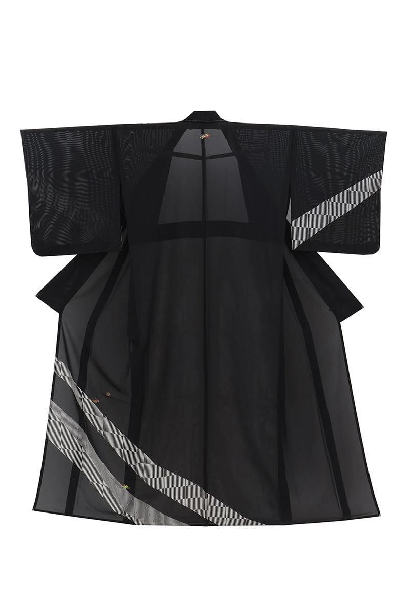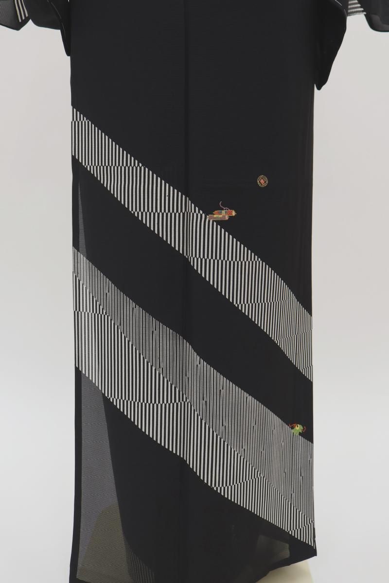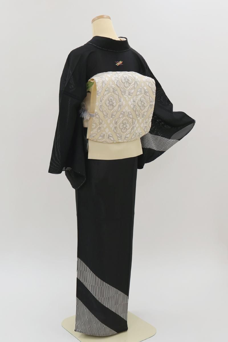 黒色の地に斜め段を配し、緻密な刺繍で宝尽くし文をさりげなくあしらった絽の付下げです。