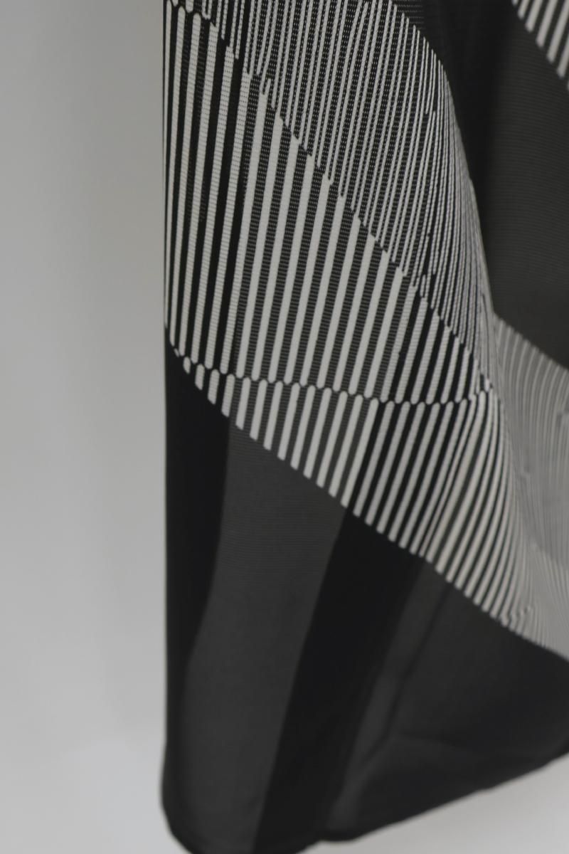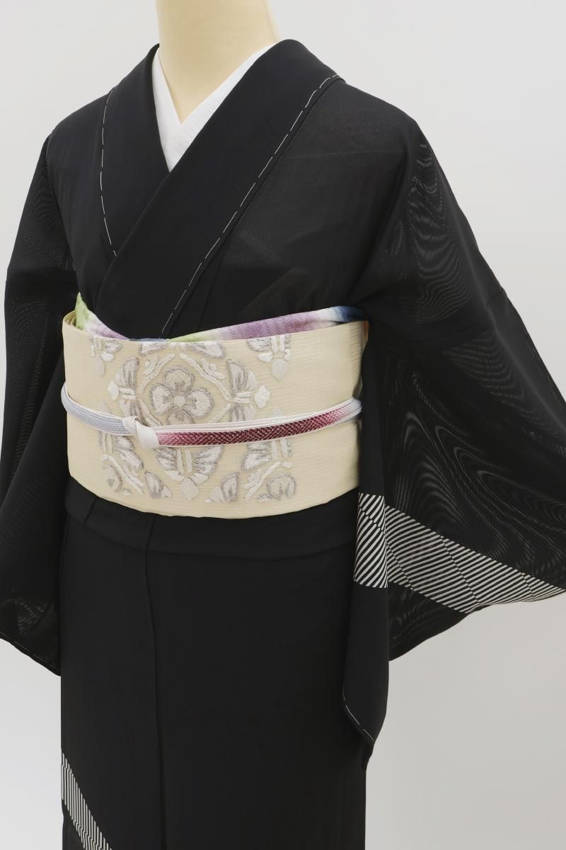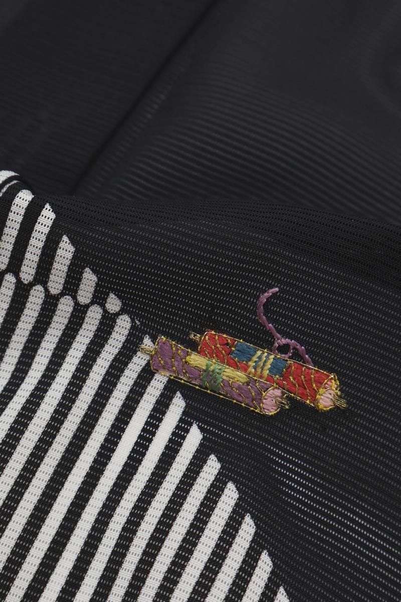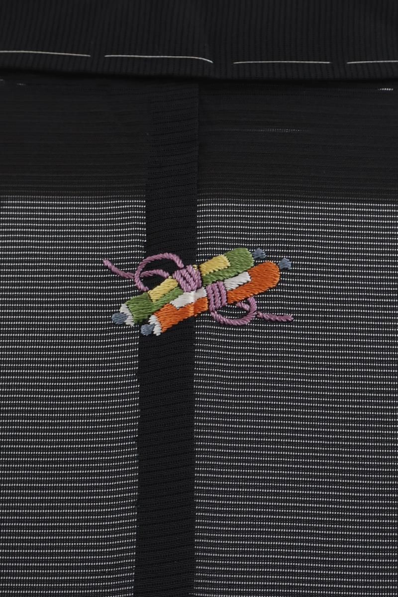 黒色の地に斜め段を配し、緻密な刺繍で宝尽くし文をさりげなくあしらった絽の付下げです。