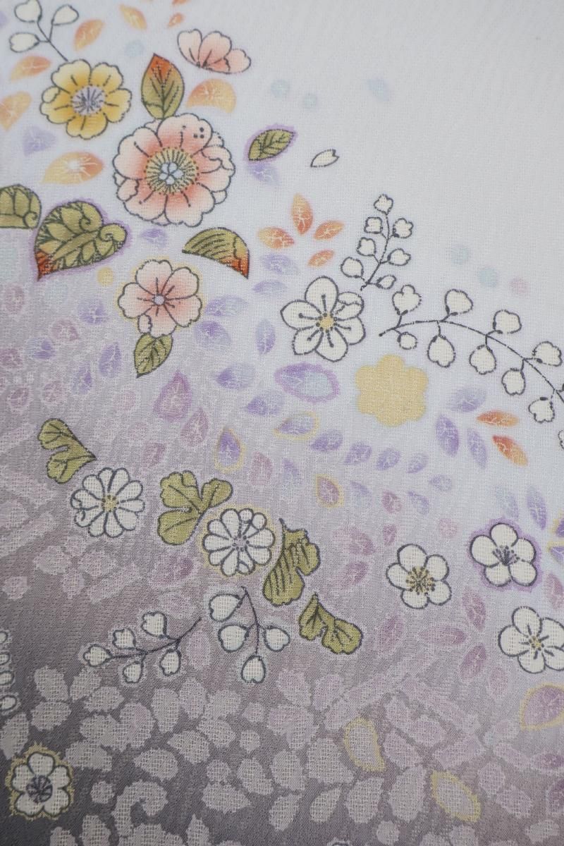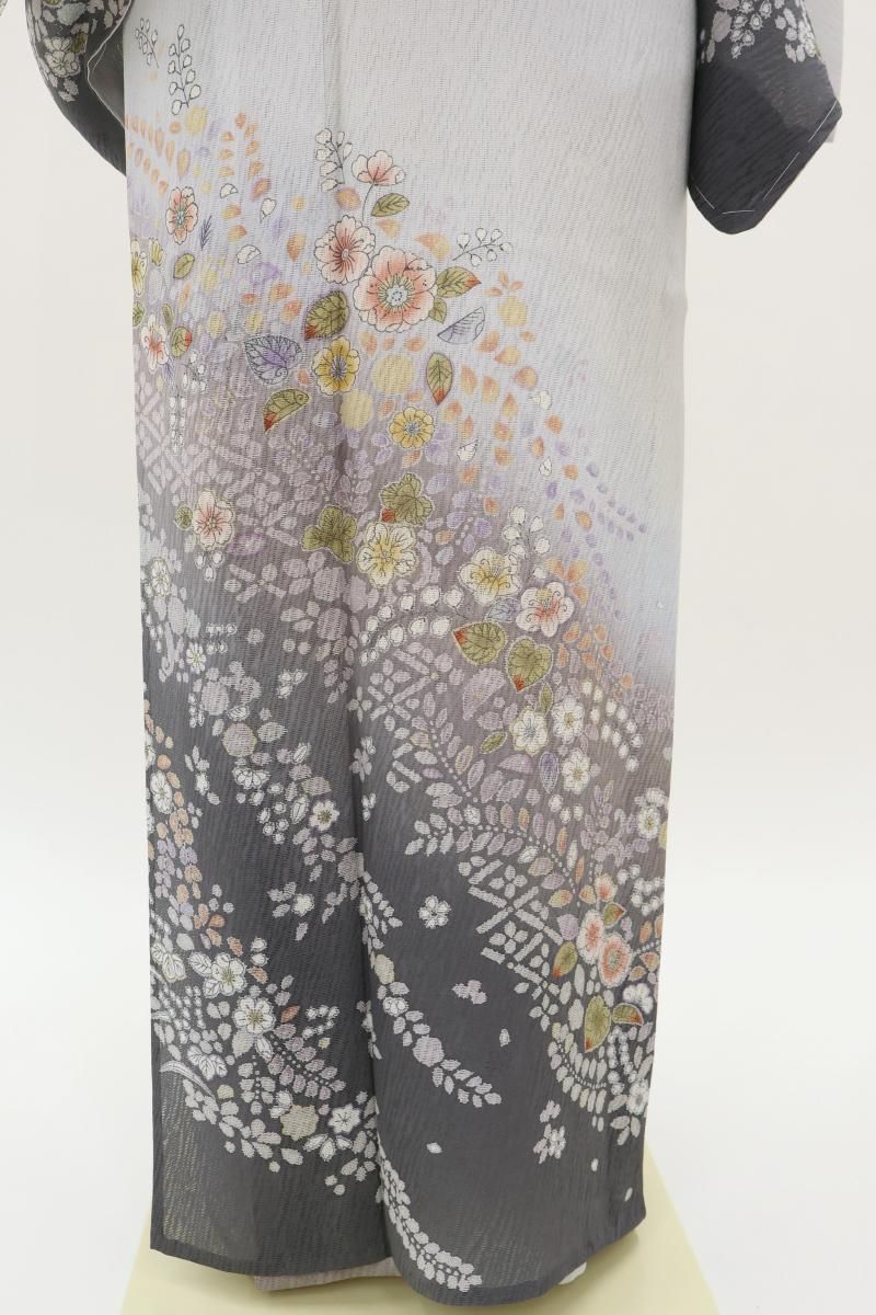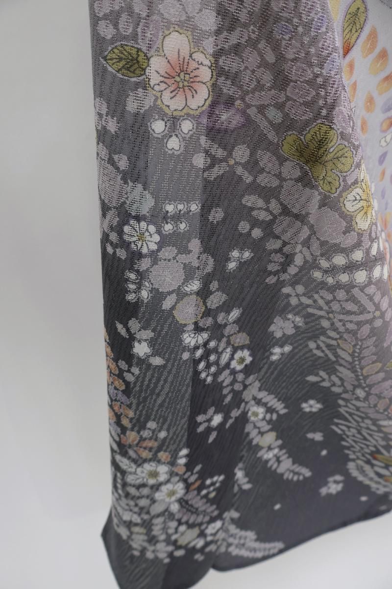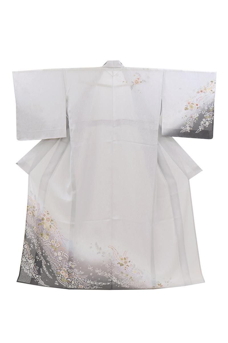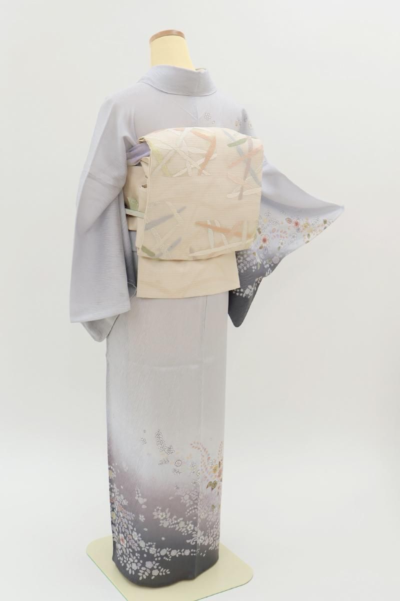 極限まで色を薄めた藤鼠色が近いでしょうか、紫みの薄グレーの地に、濃淡で裾暈かしを配し、重ねて辻が花風文を描いた紋紗の訪問着です。ニュアンスのある地紋が浮かぶ地風に、流れるように配された華やかな文様が幻想的な景色を創るお品、風雅な印象で装いをしっとりと引き立ててくれることと思います。改まったお席やパーティなど、様々な場面にいかがでしょうか。