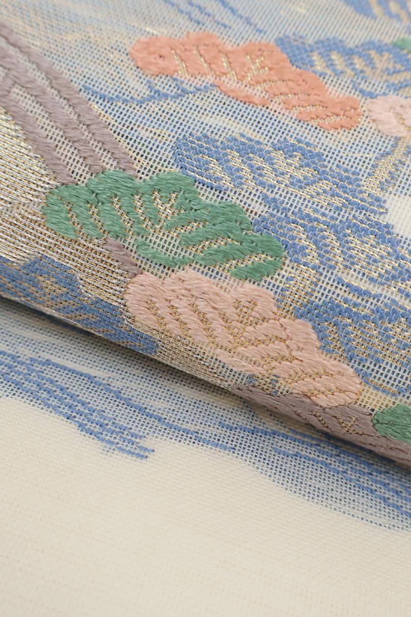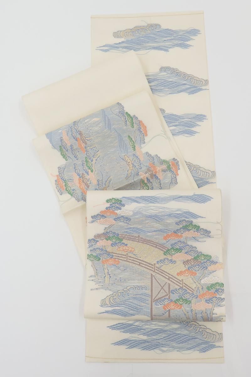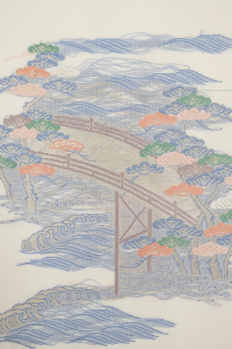 こちらは乳白色が近いでしょうか、透け感ゆたかなしゃりっとした白色の地に波に橋や松の図を織り出したお品、モダンな色遣いにふんだんな金糸を用いて表現された古典意匠が後ろ姿をしっとりと優雅に引き立ててくれることと思います。色無地や付下げ、訪問着などに合わせていかがでしょうか。