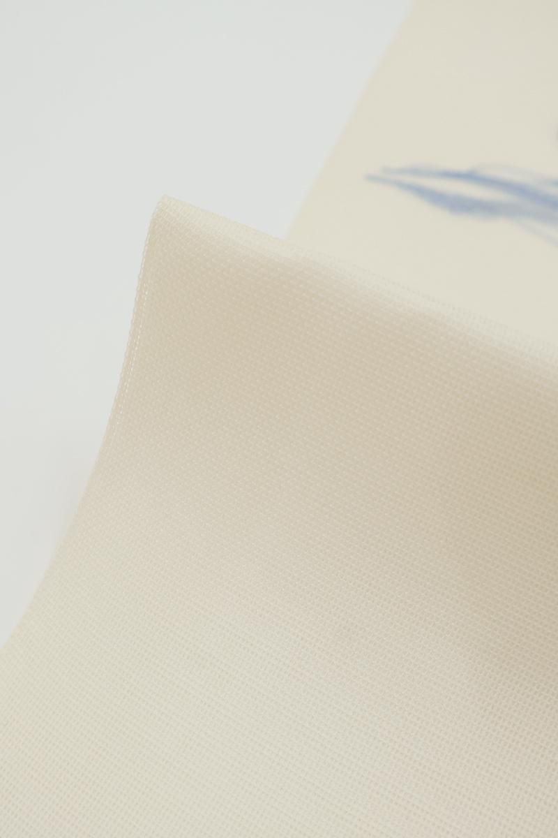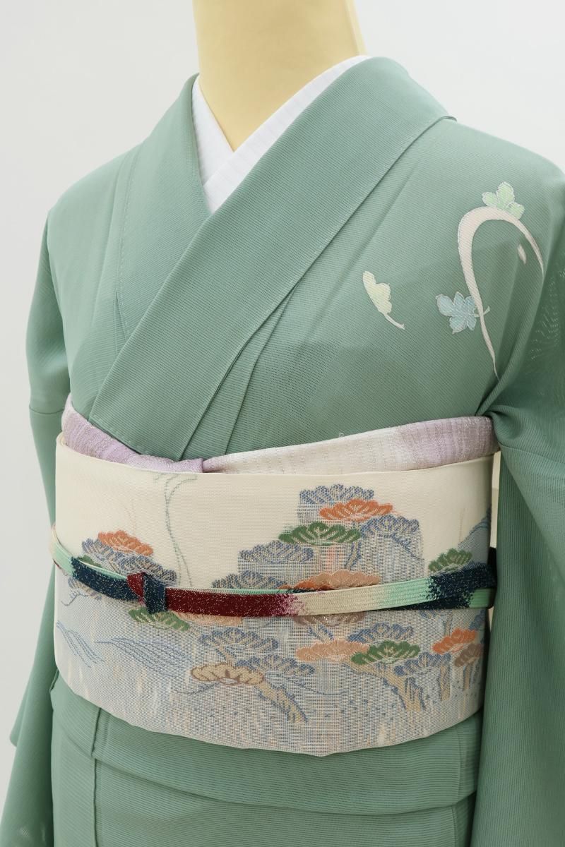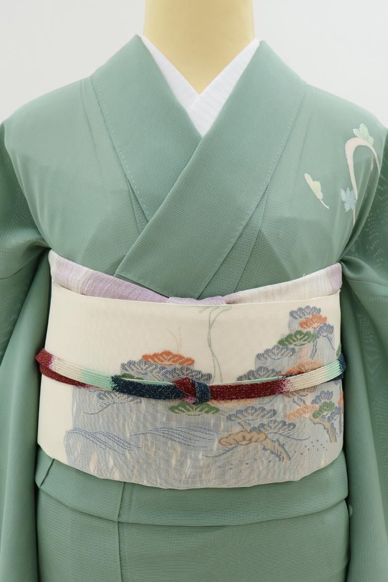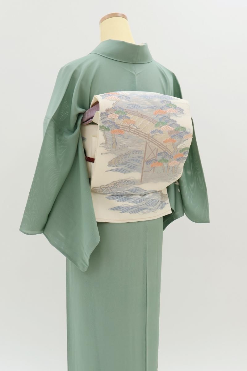 こちらは乳白色が近いでしょうか、透け感ゆたかなしゃりっとした白色の地に波に橋や松の図を織り出したお品、モダンな色遣いにふんだんな金糸を用いて表現された古典意匠が後ろ姿をしっとりと優雅に引き立ててくれることと思います。色無地や付下げ、訪問着などに合わせていかがでしょうか。