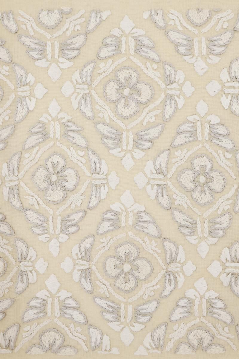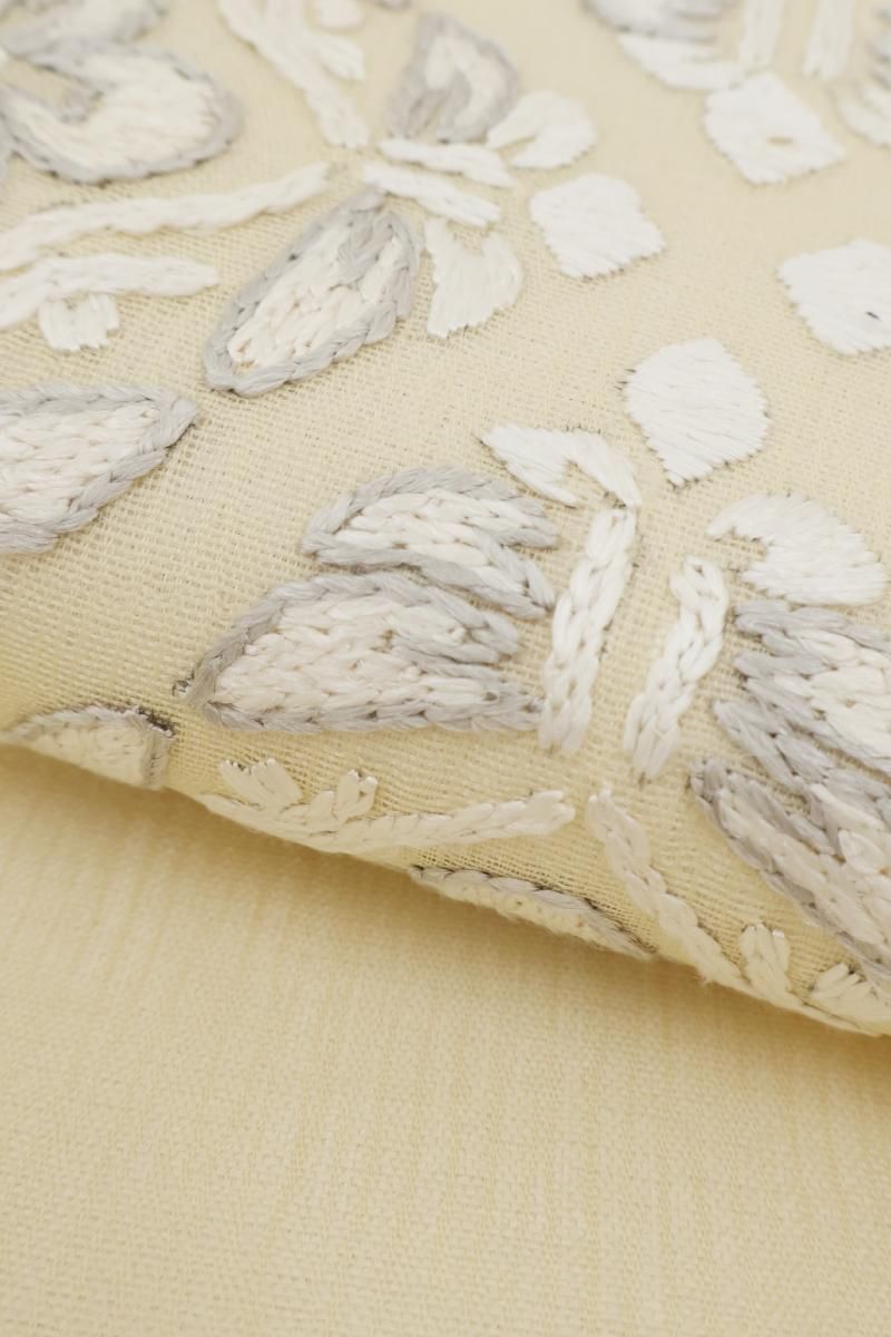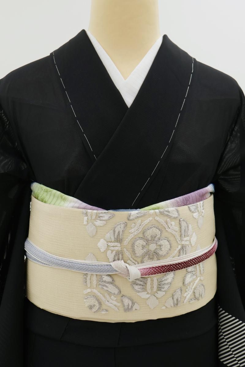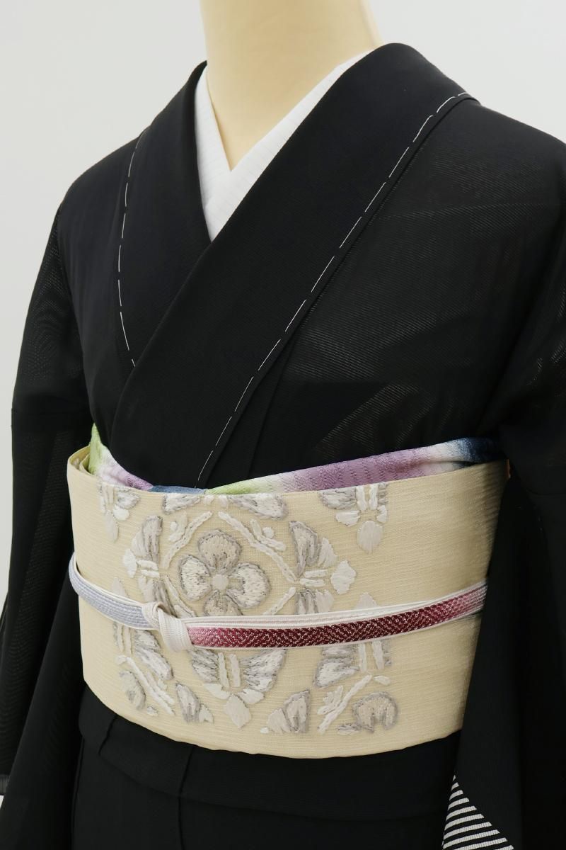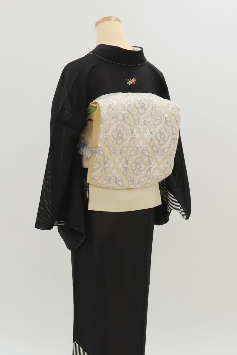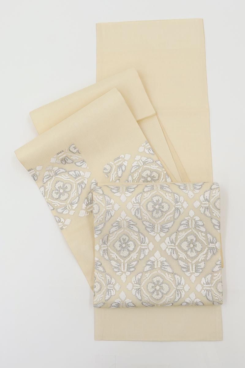 クリーム色が近いでしょうか、淡いベージュホワイトの地に、菱に花文を刺繍であしらった夏の洒落袋帯です。透け感ゆたかなしゃりっとした地風に、ふっくらとした太糸で表現された立体感のあるモチーフが愛らしくモダンな趣のお品、金糸は用いておりませんので合わせる着物も様々にお楽しみいただけることと思います。ドレッシーな小紋や色無地などに合わせて、お食事会や観劇などにいかがでしょうか。
