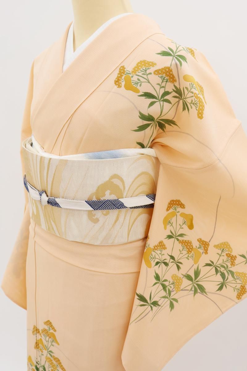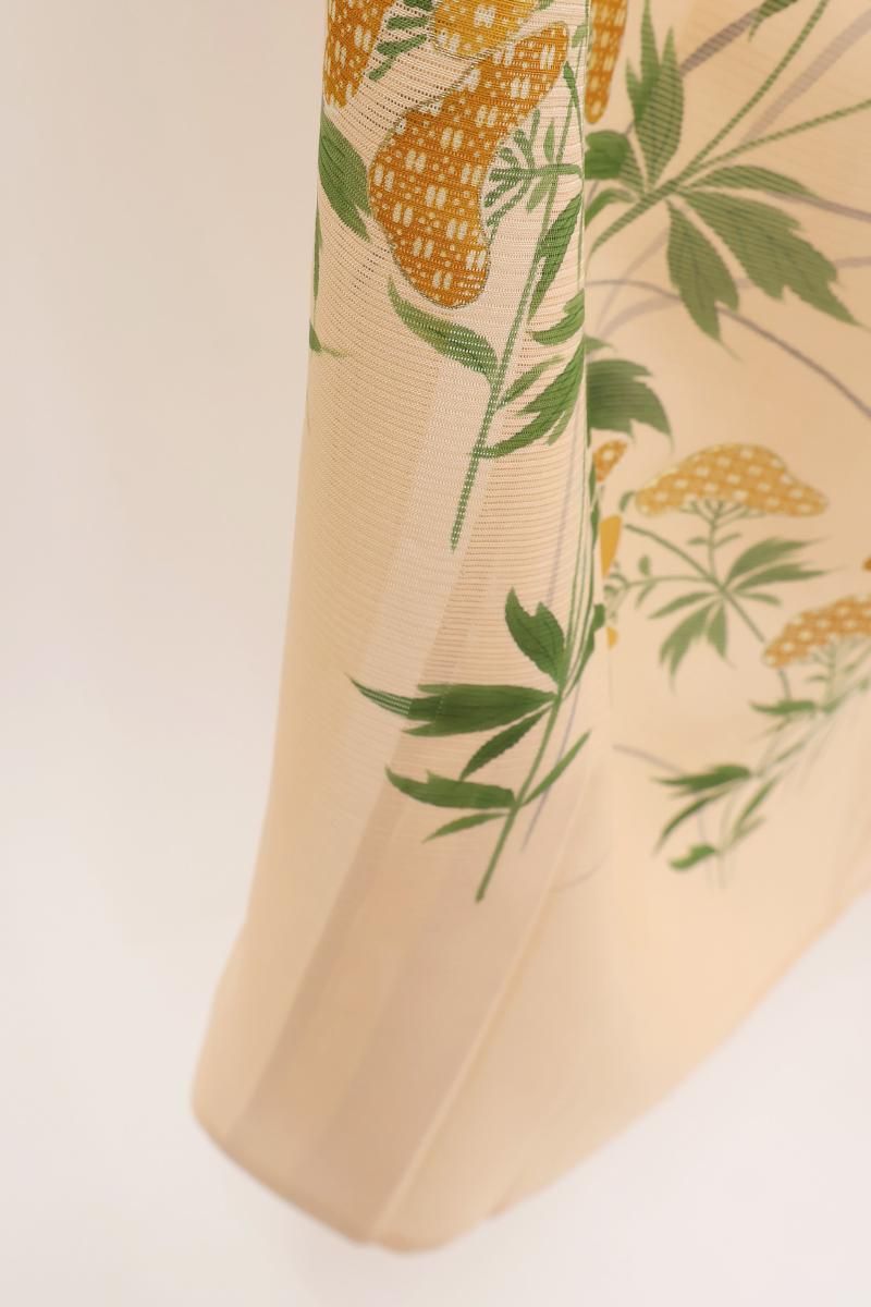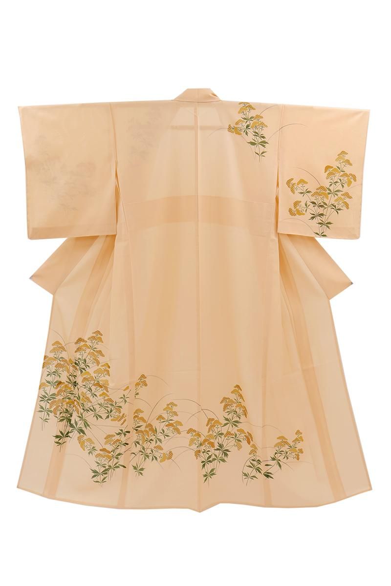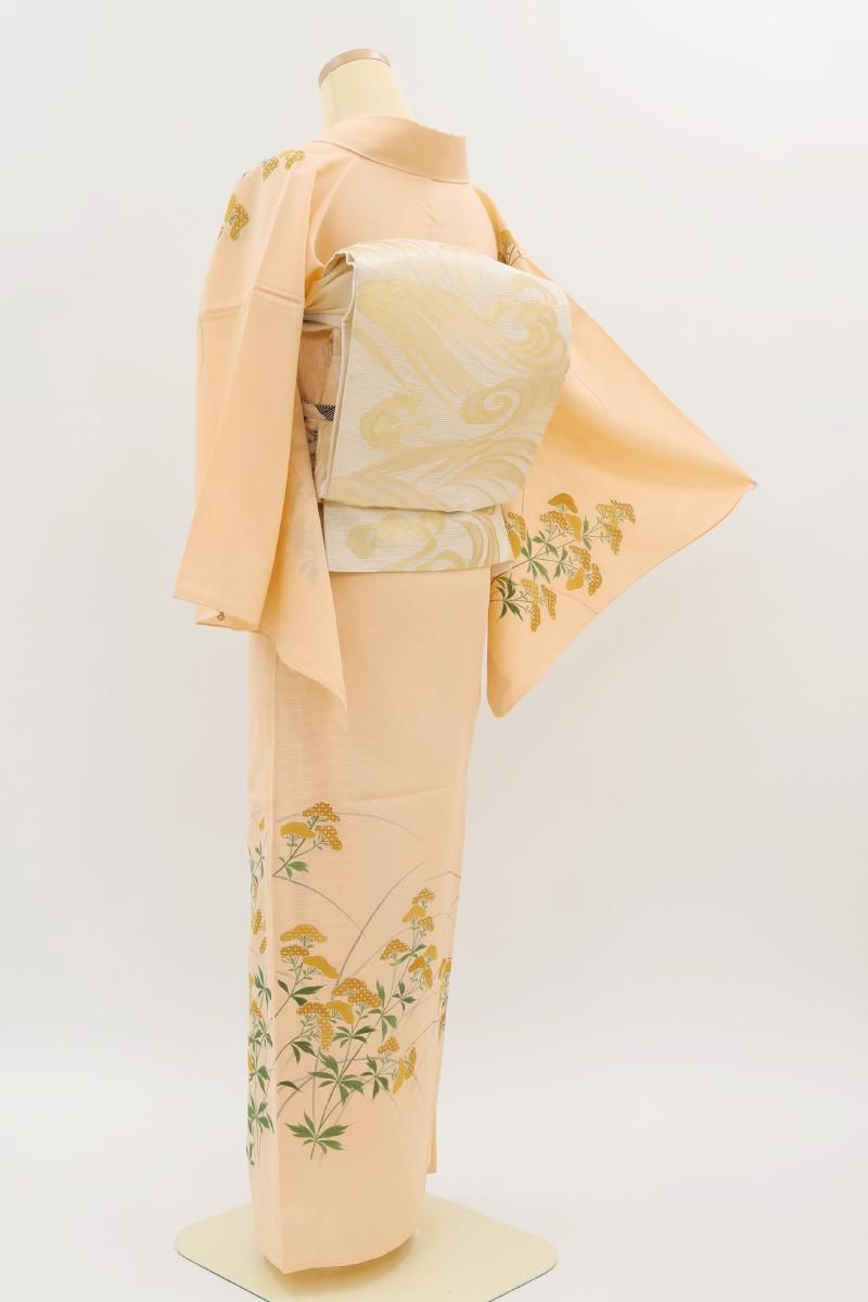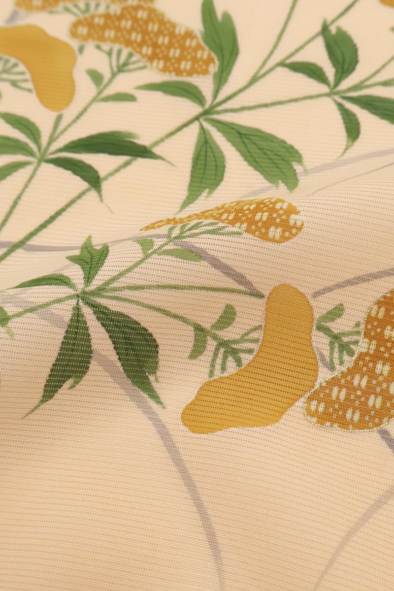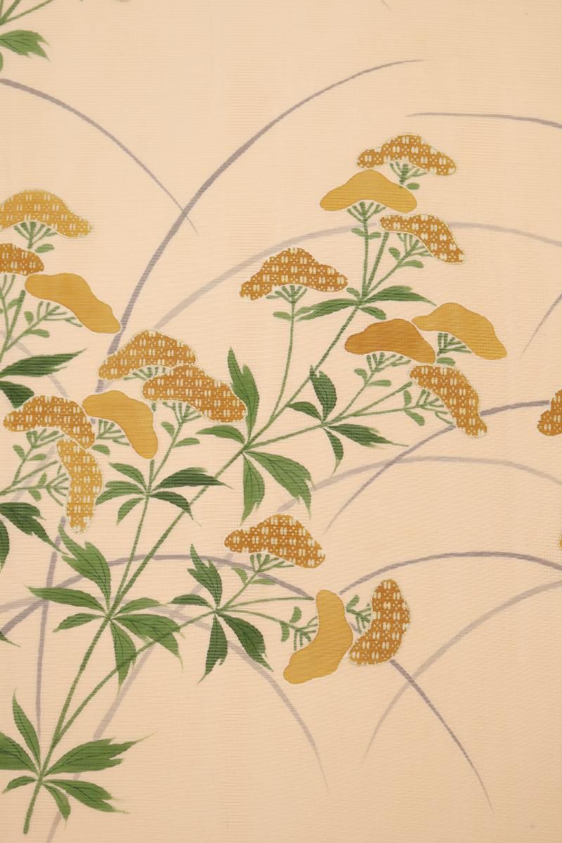 女性らしい甘さのある彩りに、満開に咲く女郎花の姿が朗らかな表情を見せるお品、さりげない繍いや金糸の煌めきが陰影と気品を添えていますね。夏のお呼ばれや改まったお席に季節の風情あふれる優美な装いをいかがでしょうか。