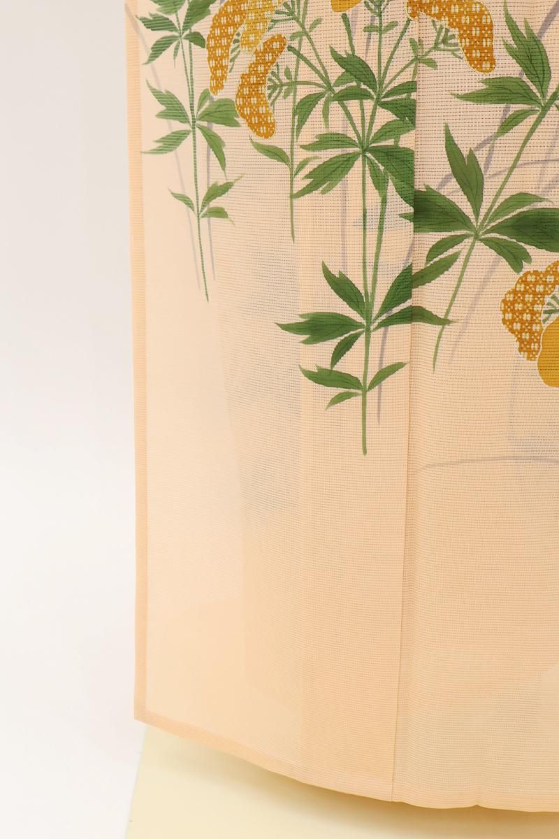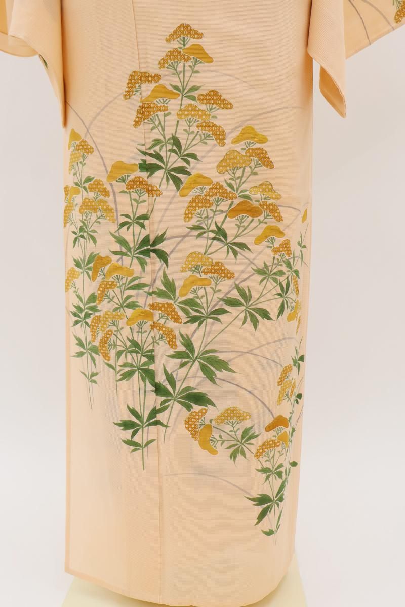 赤白橡色が近いでしょうか、さらりとして程よい張りのあるサーモンオレンジの地に女郎花の図を描いた絽の付下げです。
