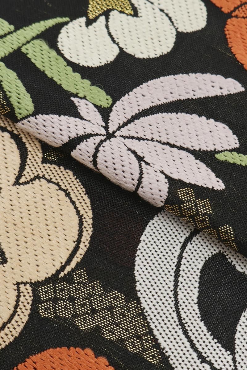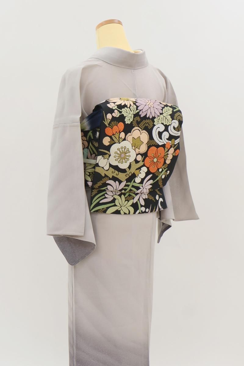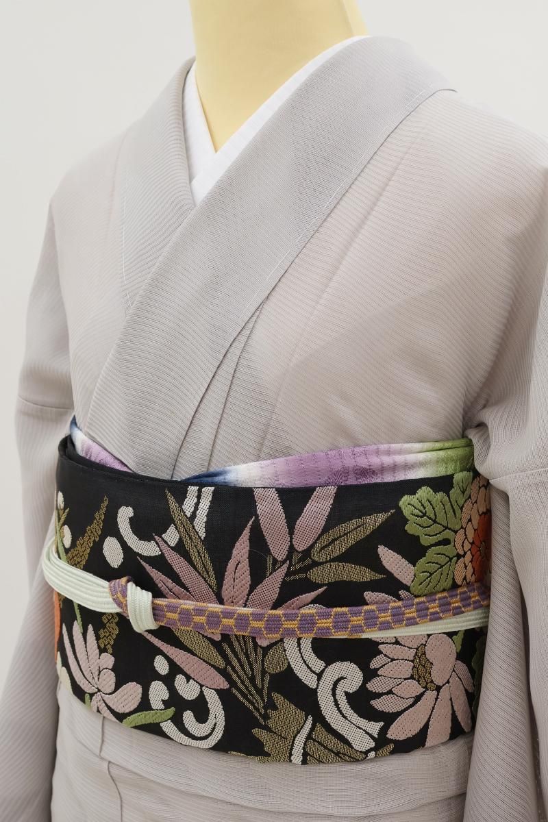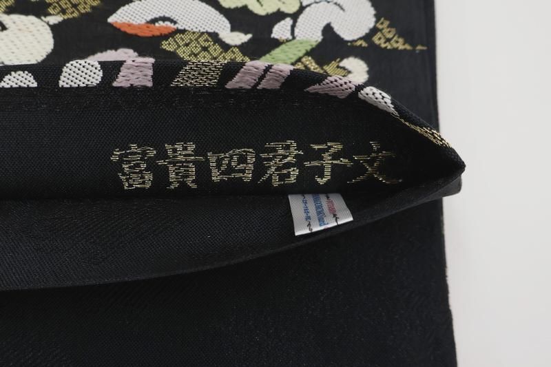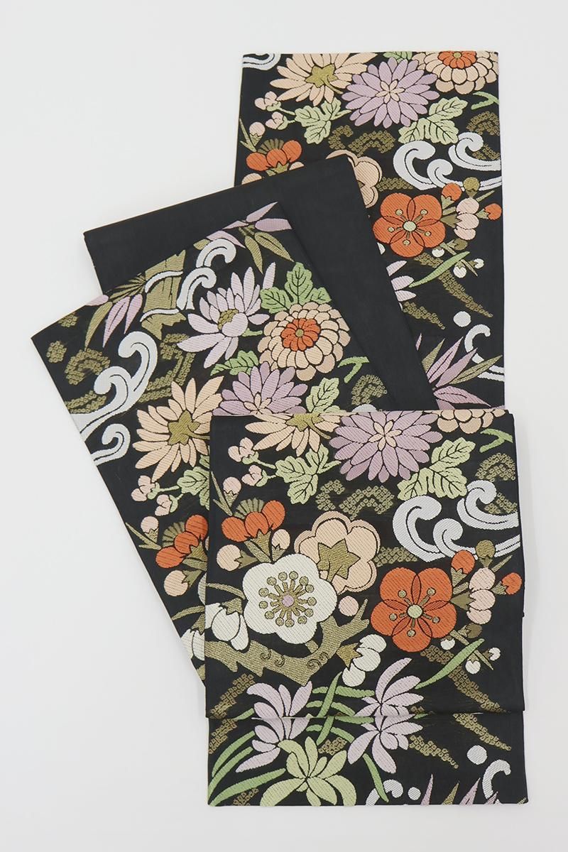 さっくりと透け感のある黒色の地に、優美な彩りでおおらかな四君子文様や波を織り出した夏の袋帯です。
