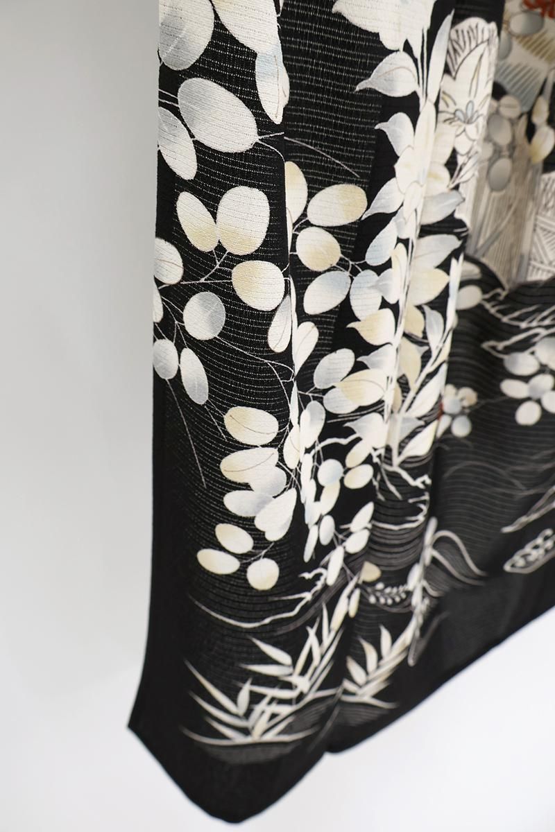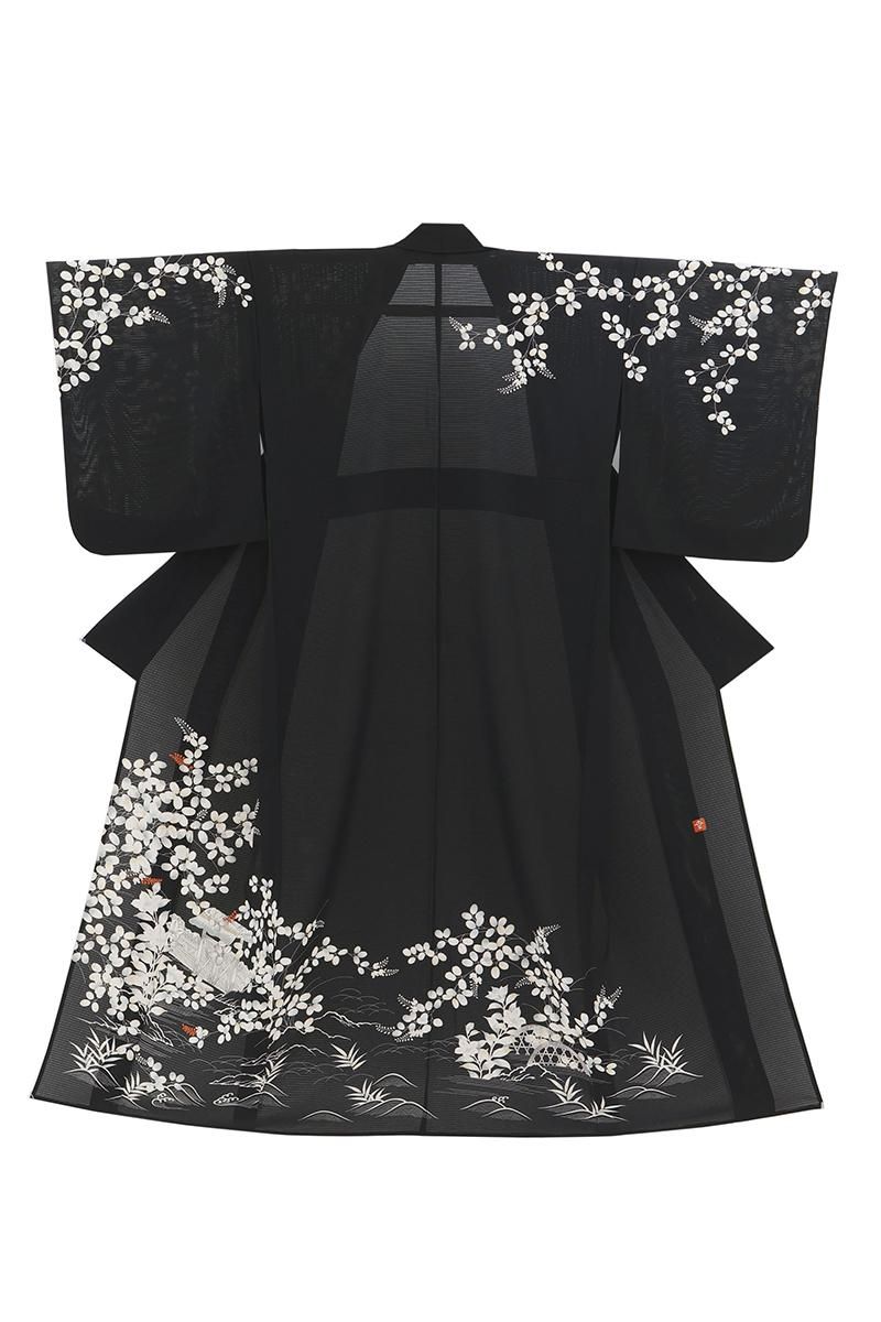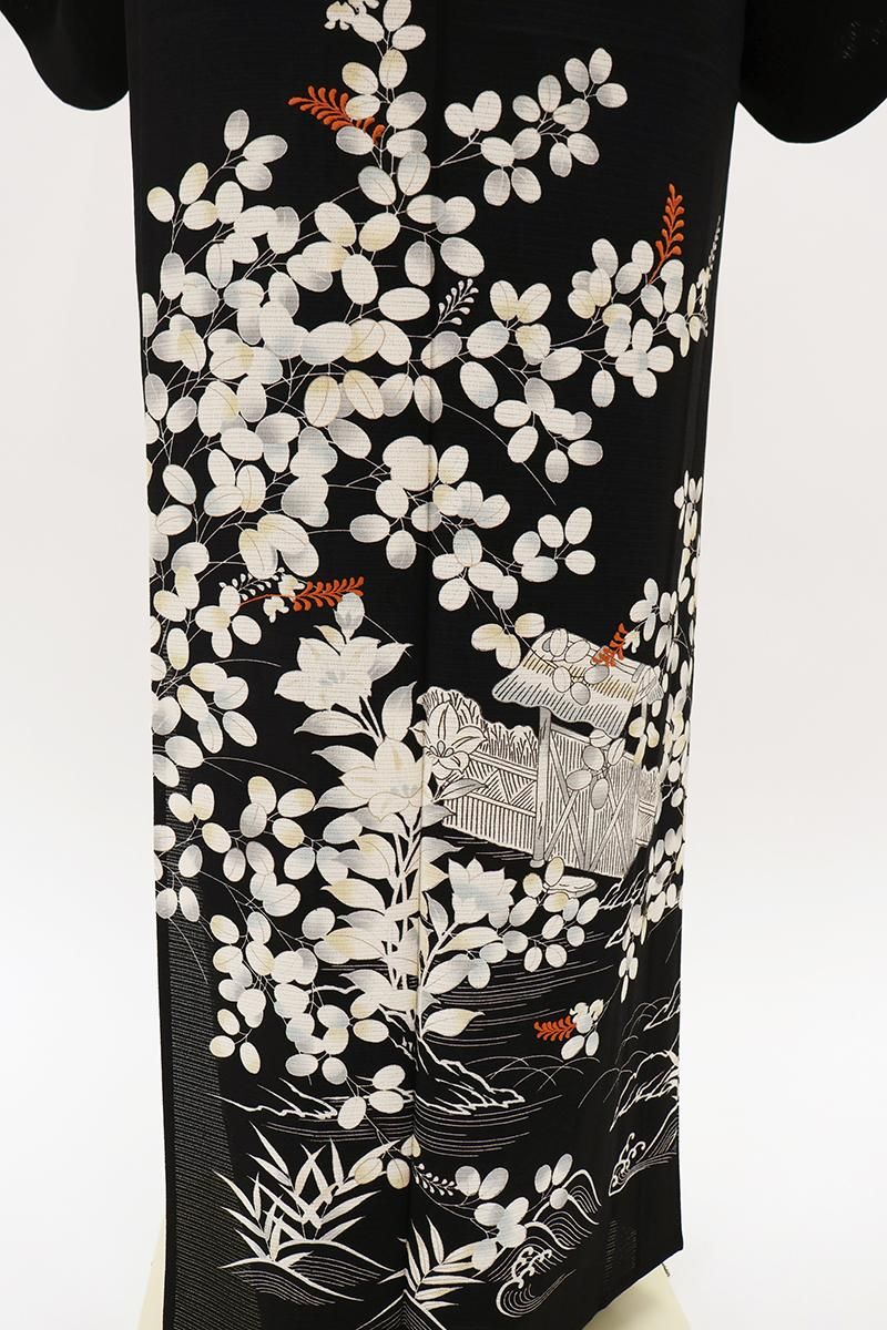 黒色の絽縮緬地に、蛇籠や葦をあしらった水辺の風景や、枝折り戸に萩、桔梗などの秋草などを描いた季節の情緒あふれる訪問着です。