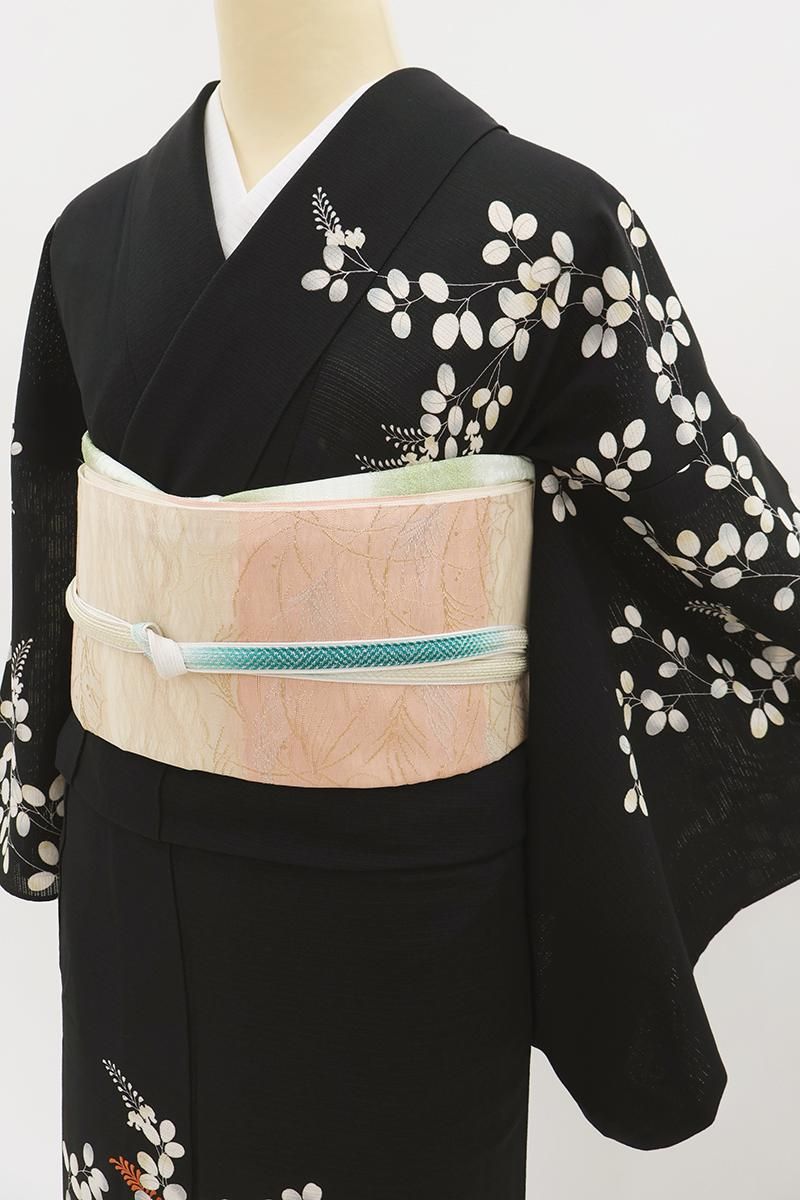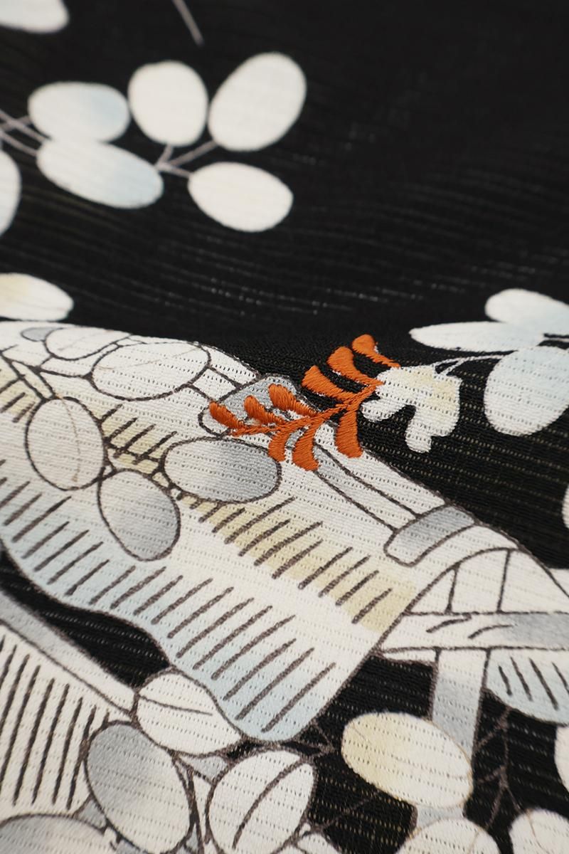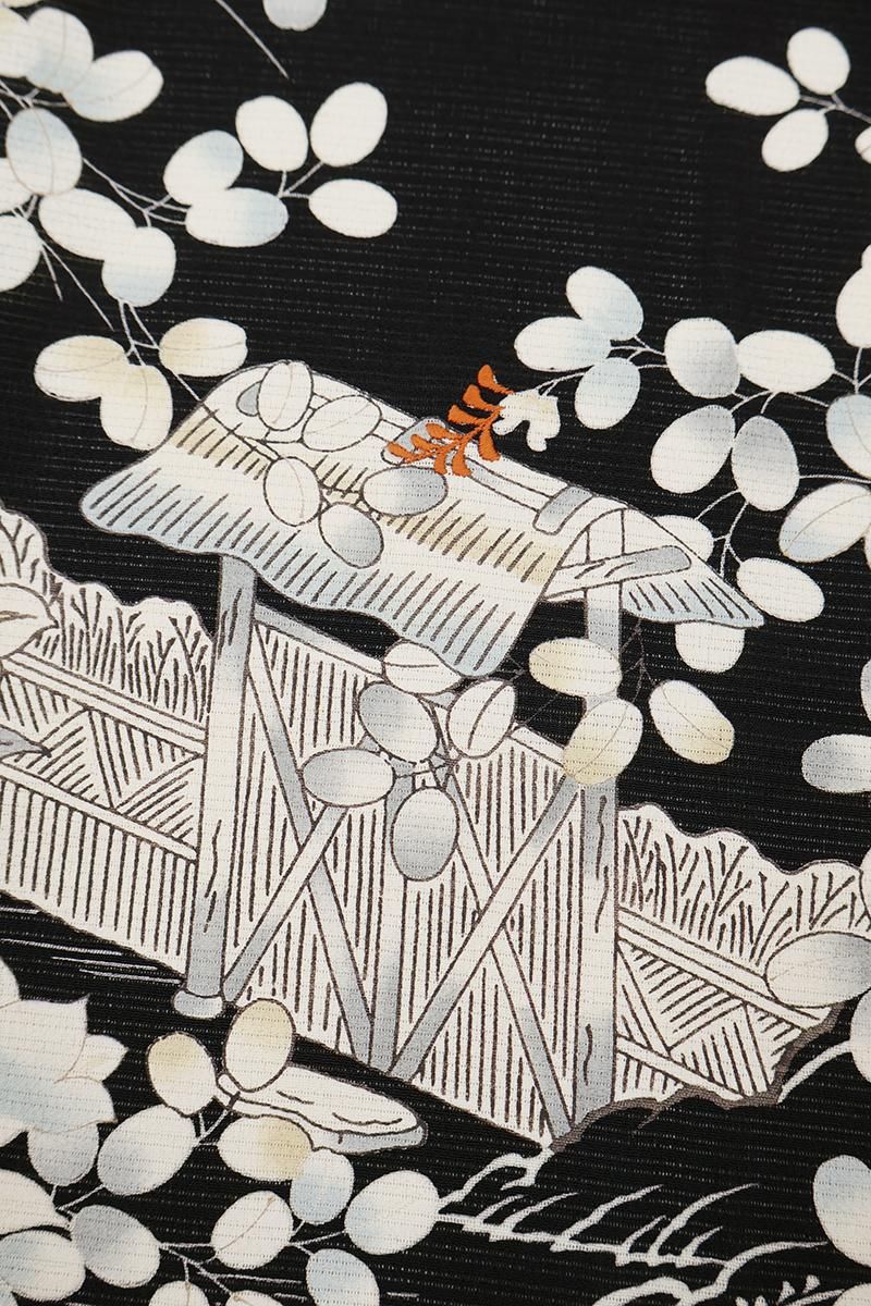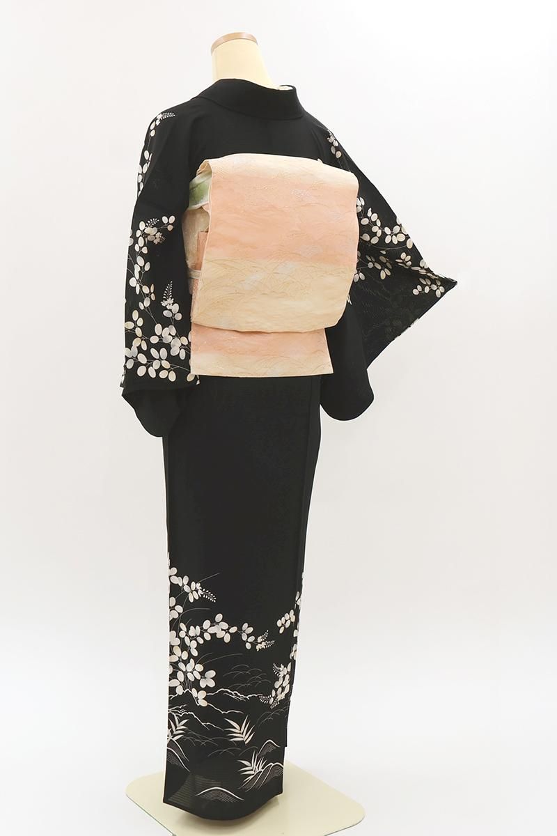 黒色の絽縮緬地に、蛇籠や葦をあしらった水辺の風景や、枝折り戸に萩、桔梗などの秋草などを描いた季節の情緒あふれる訪問着です。