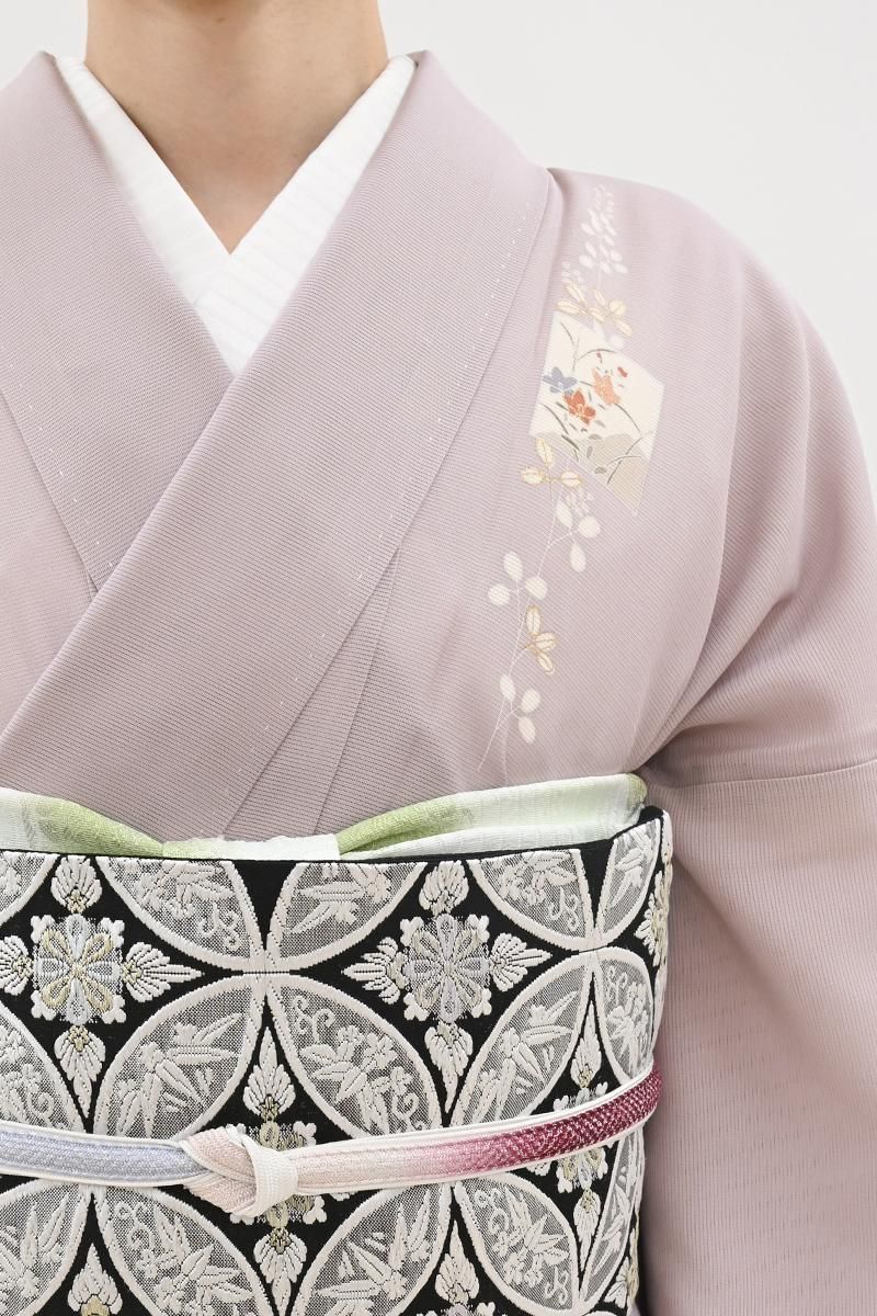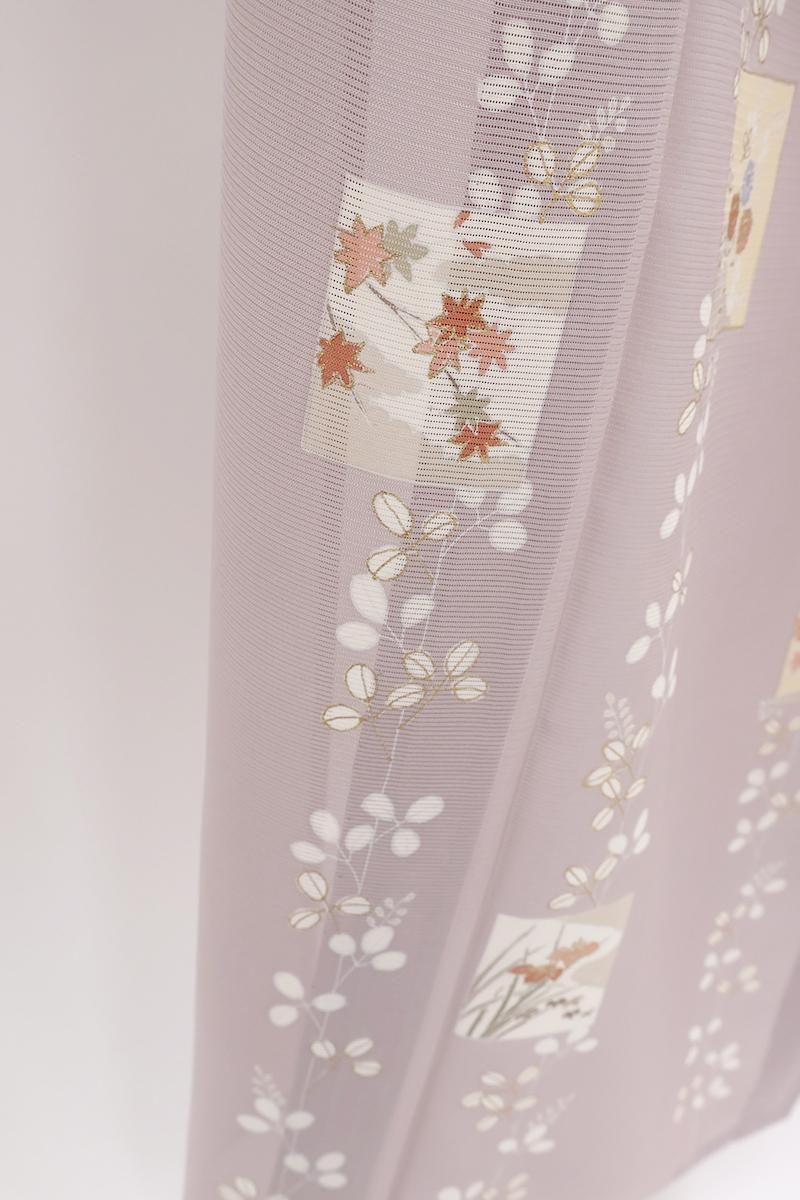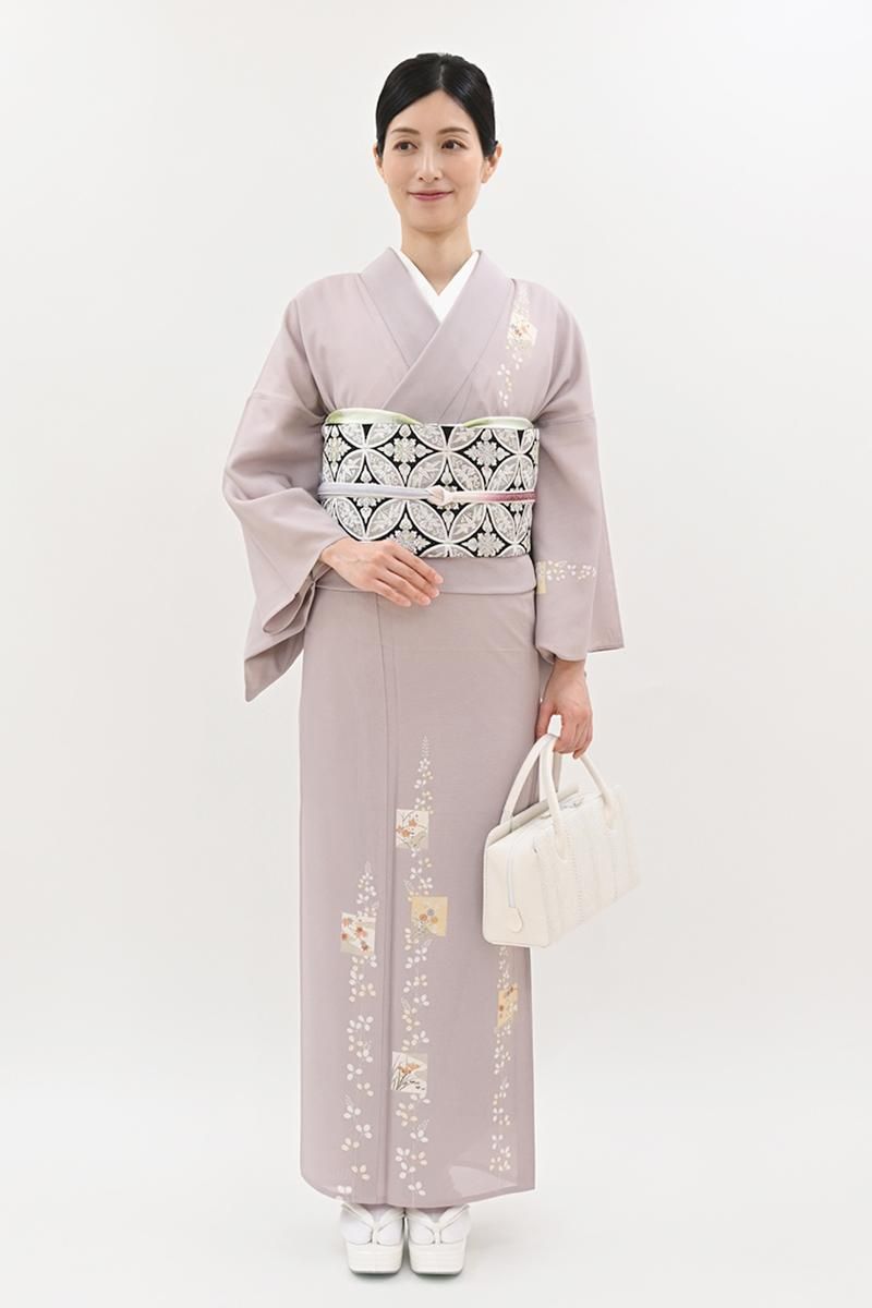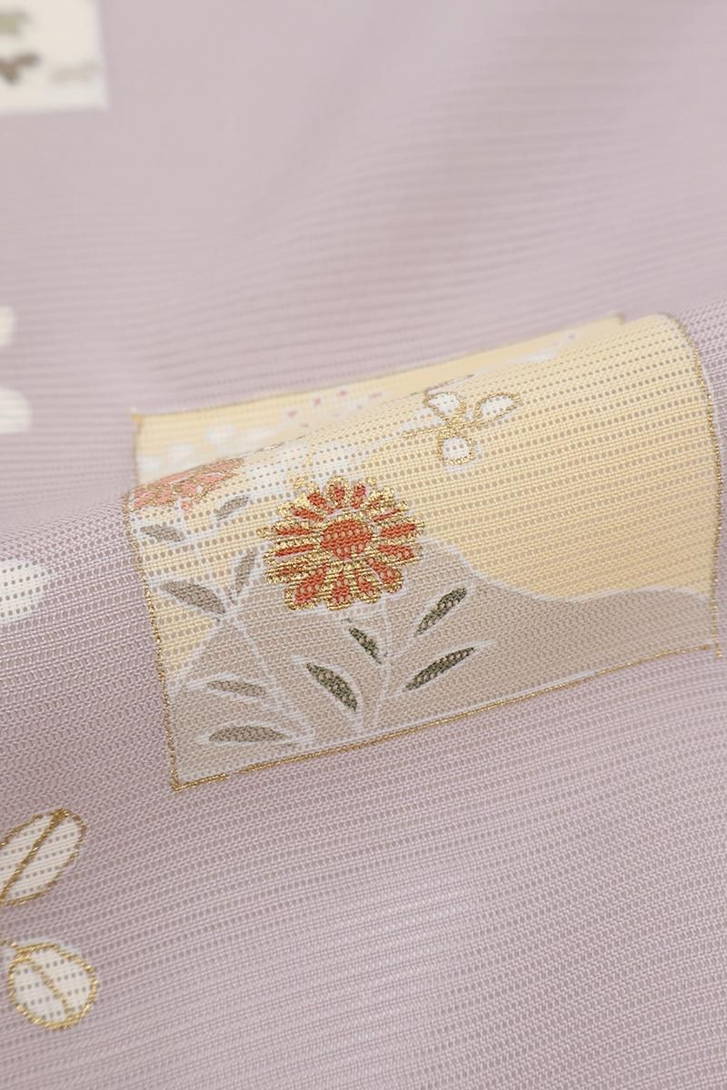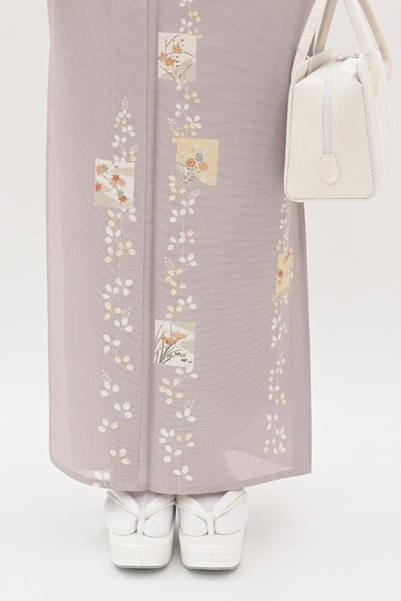 ぐっと色を薄めた梅鼠色が近いでしょうか、灰みの強い薄紫色の地に、色紙や萩の図を染めた絽の付下げです。さらりとした風合いの程よく落ち着いたお色目に、金彩を添えて描かれた優美な意匠が装いを風情豊かに引き立てるお品、はんなりとして一歩控えた色柄は、様々な場面に好感度高くお召しいただけることと思います。改まったお席やお出かけなどに気品溢れる装いをお楽しみくださいませ。