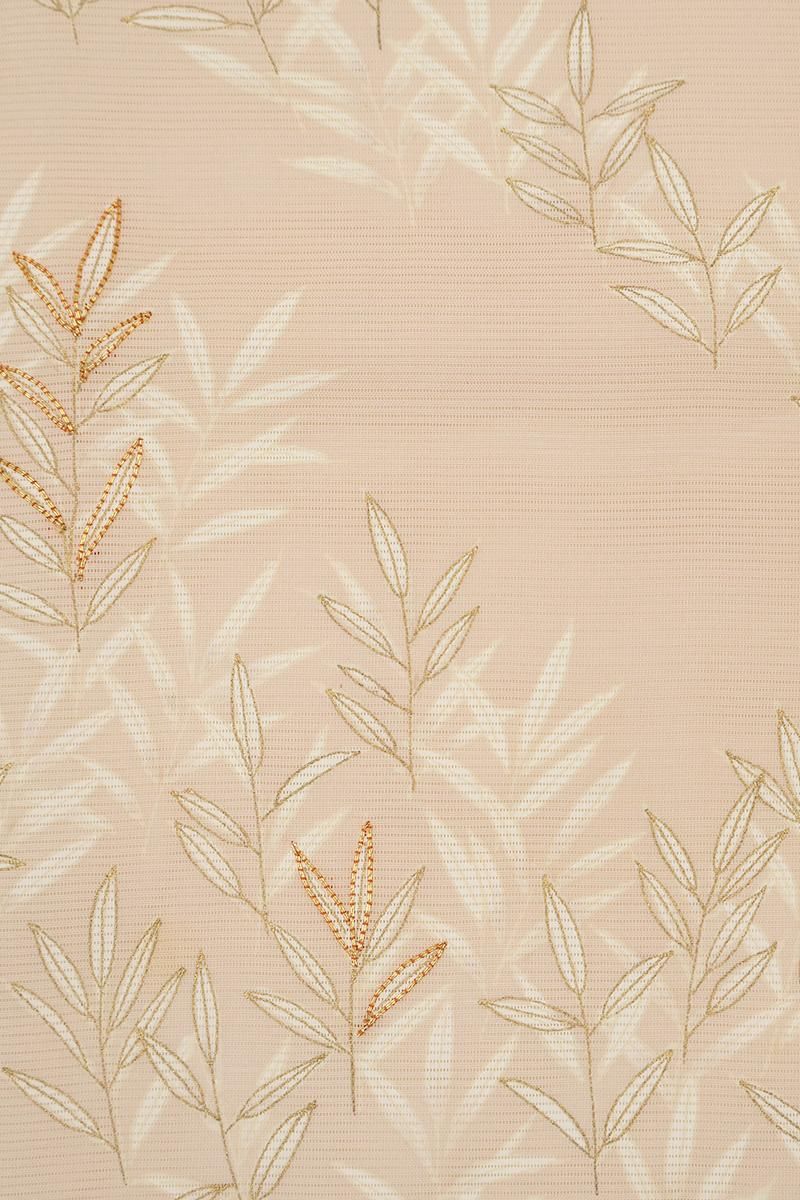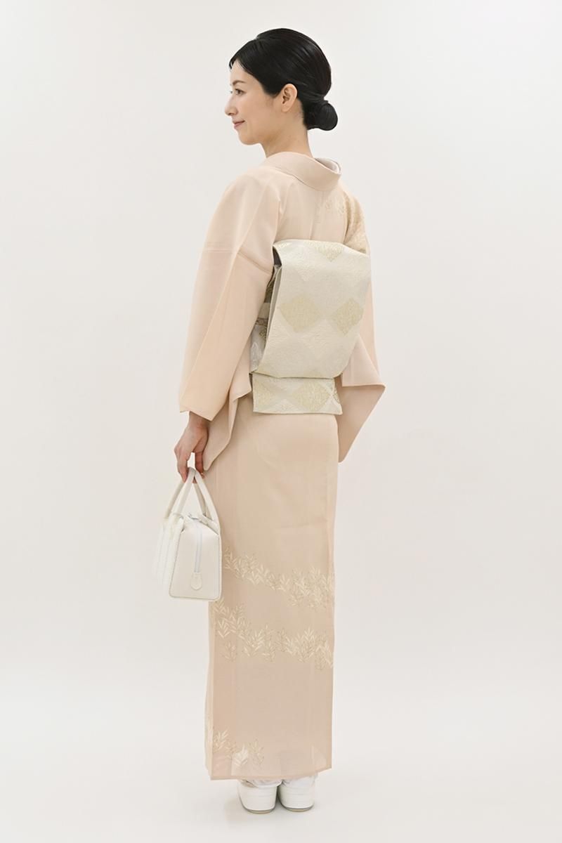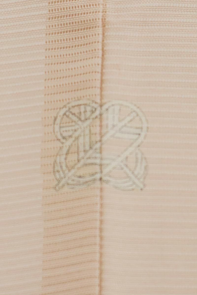 シェルピンク色が近いでしょうか、灰みのピンクベージュの地に、葦の図を配した絽の訪問着です。