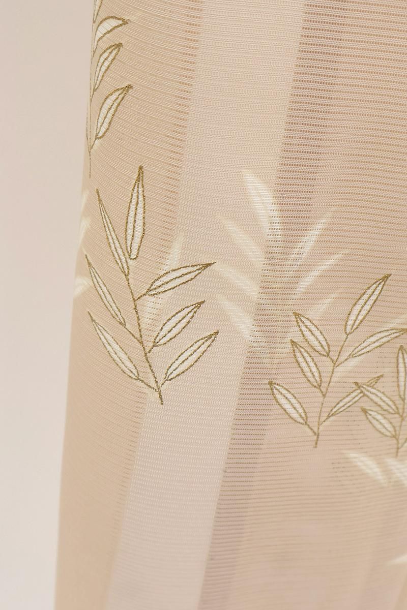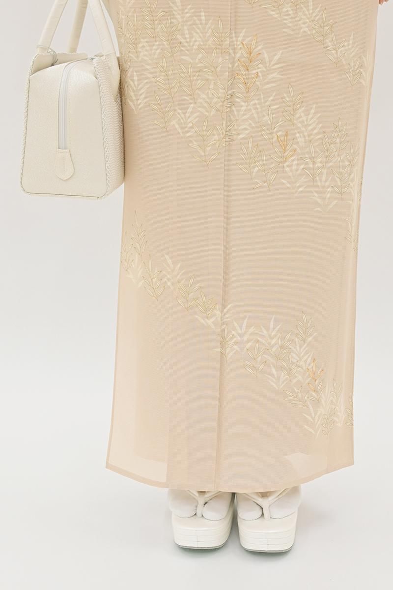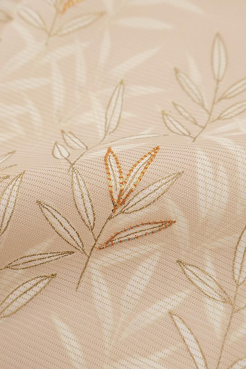しゃりっとした地風の女性らしいお色目に、白色や金色のみで描かれた意匠が涼やかな風を運ぶお品、装いをしっとりと風雅に引き立ててくれることと思います。柄に施された金駒刺繍のきらめきがさりげない気品を添えますね。様々な帯合わせで、改まったお席やパーティなどの場面にいかがでしょうか。