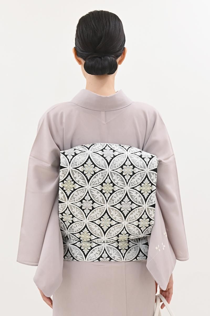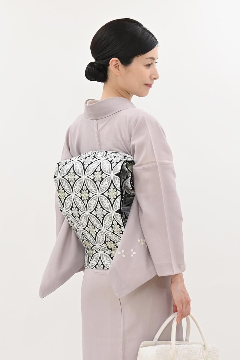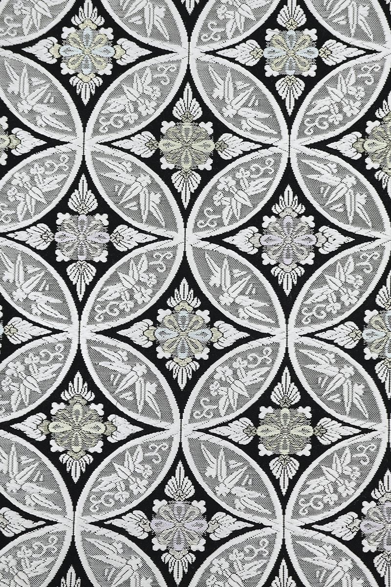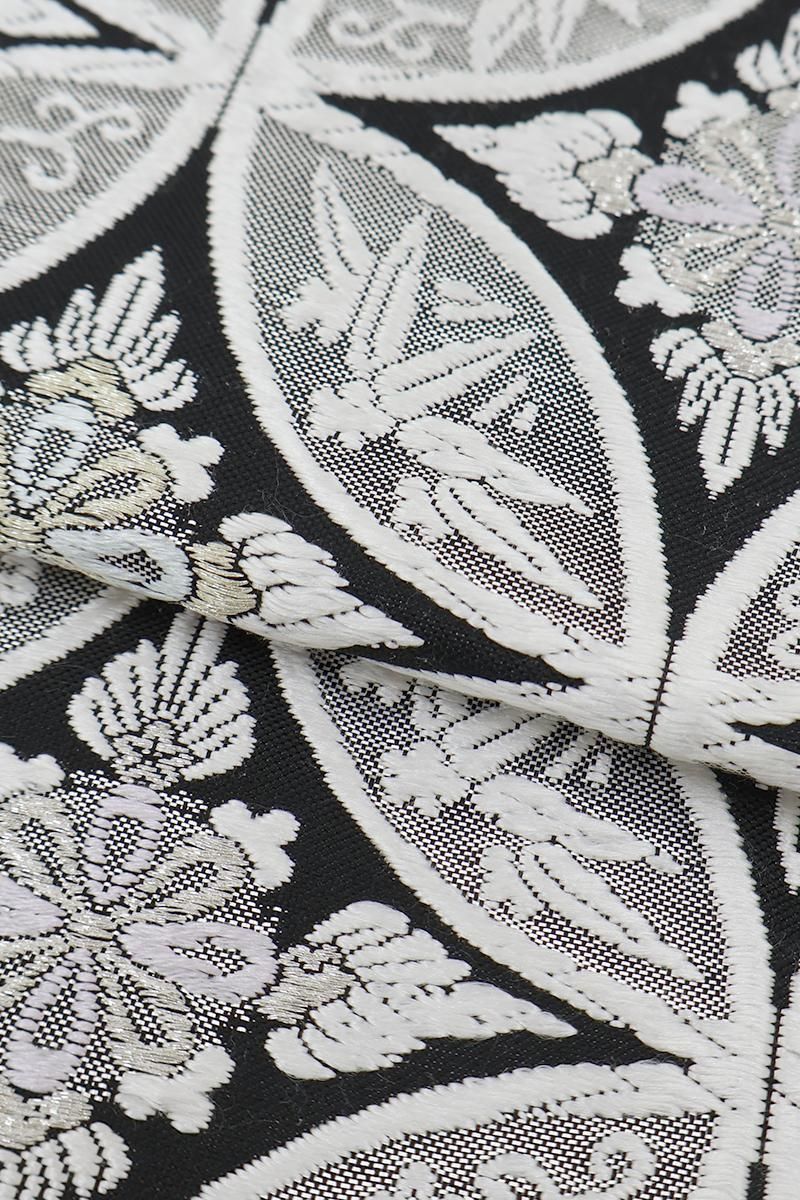こちらは黒色の地に、おおらかな七宝華文を織りだしたお品、白糸やパステルカラーに金銀糸を添えて表現された古典意匠が、気品豊かな表情で装いをきりりと引き締めてくれることと思います。ややさっくりとした地風ですので真夏と真冬を除く長い期間にお使いいだけそうです。色無地から付下げ、訪問着などに合わせて、改まったお席やお呼ばれなどにいかがでしょうか。