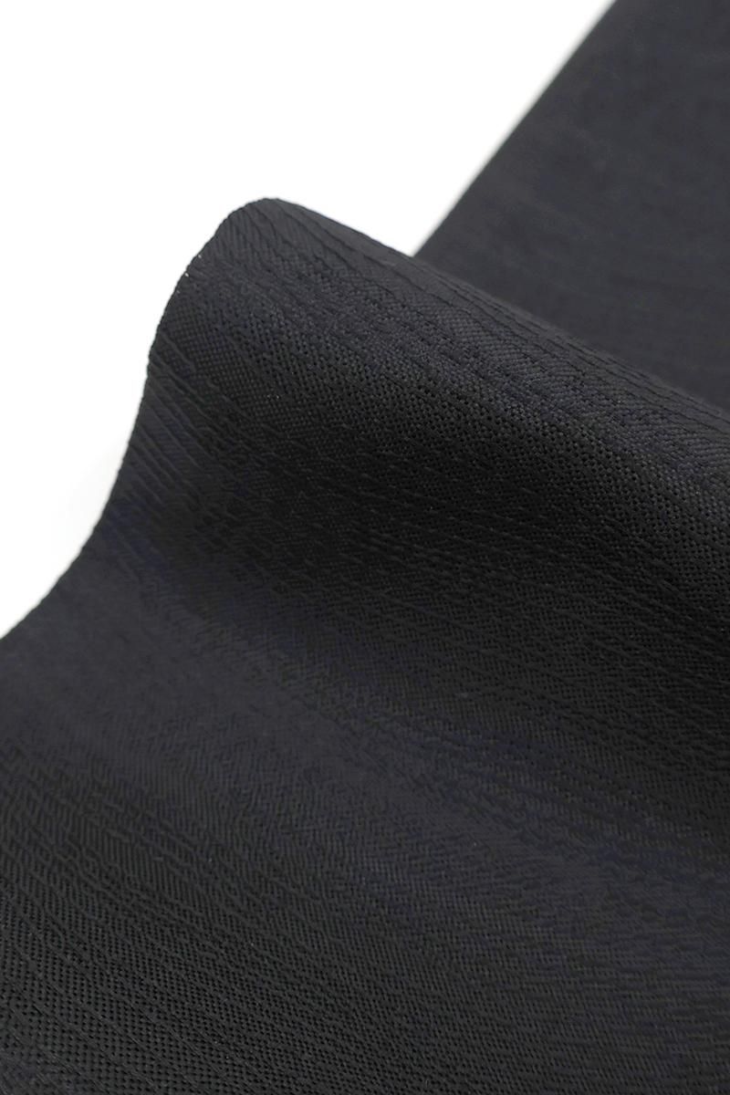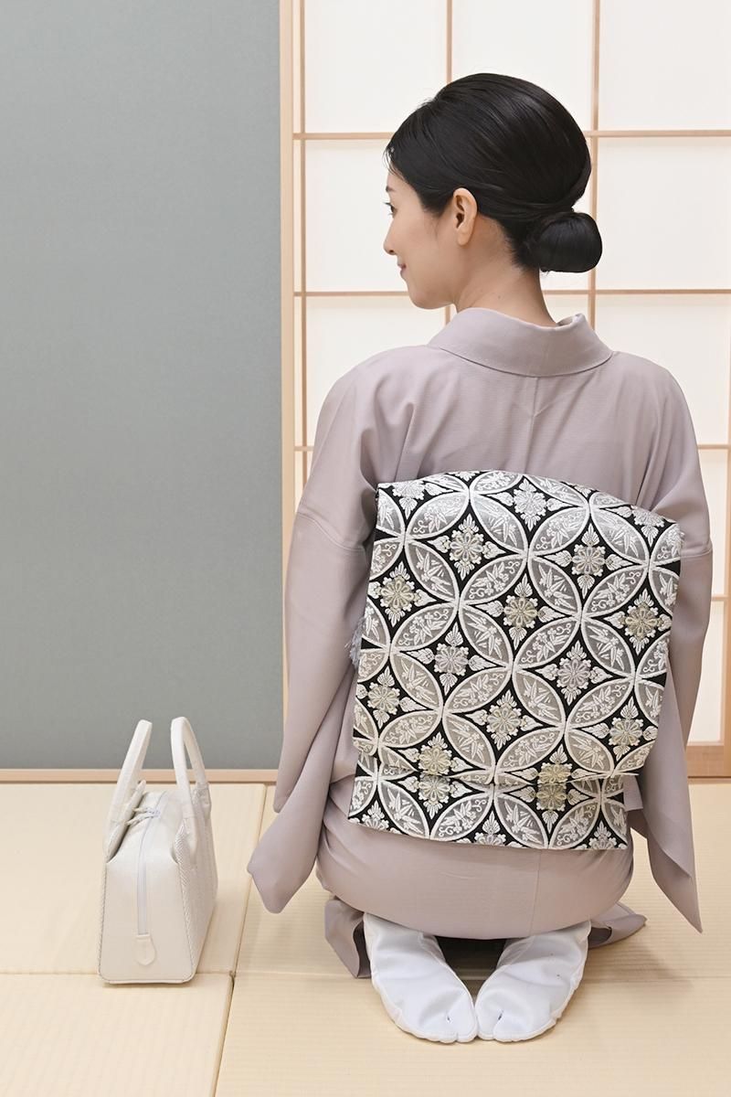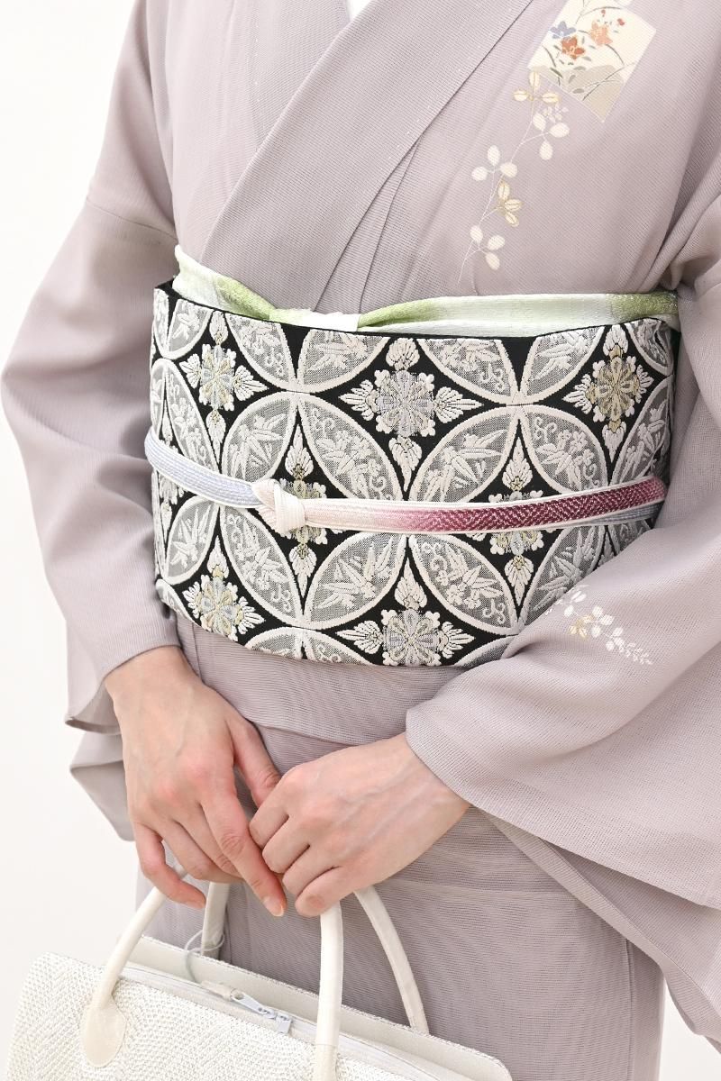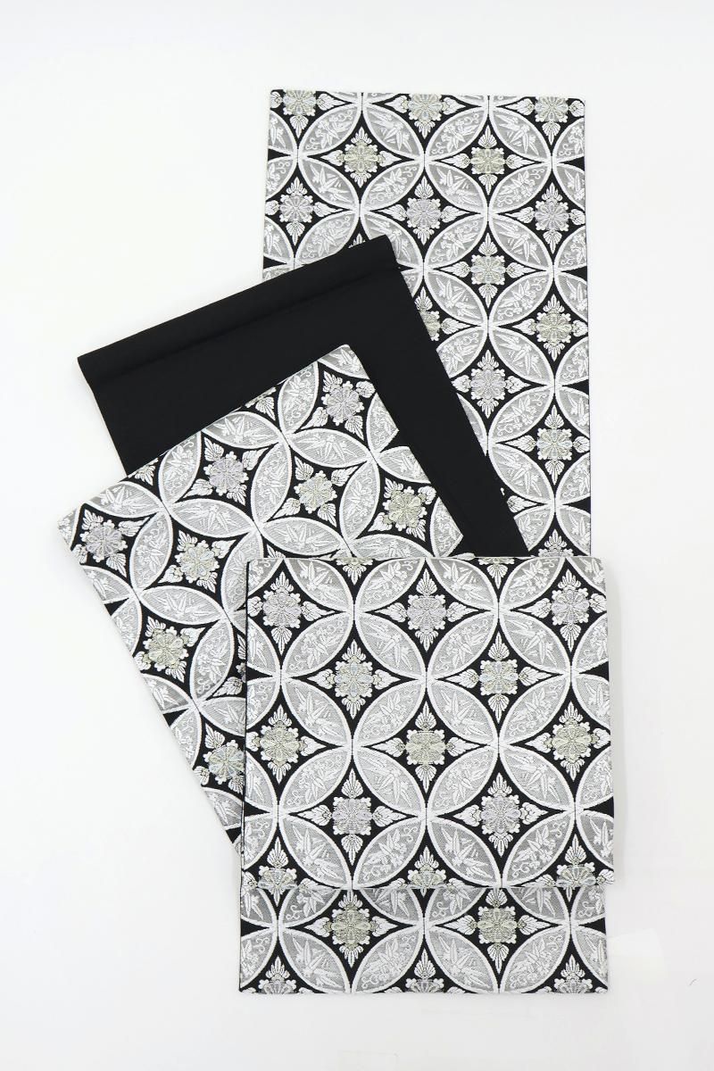 こちらは黒色の地に、おおらかな七宝華文を織りだしたお品、白糸やパステルカラーに金銀糸を添えて表現された古典意匠が、気品豊かな表情で装いをきりりと引き締めてくれることと思います。ややさっくりとした地風ですので真夏と真冬を除く長い期間にお使いいだけそうです。色無地から付下げ、訪問着などに合わせて、改まったお席やお呼ばれなどにいかがでしょうか。