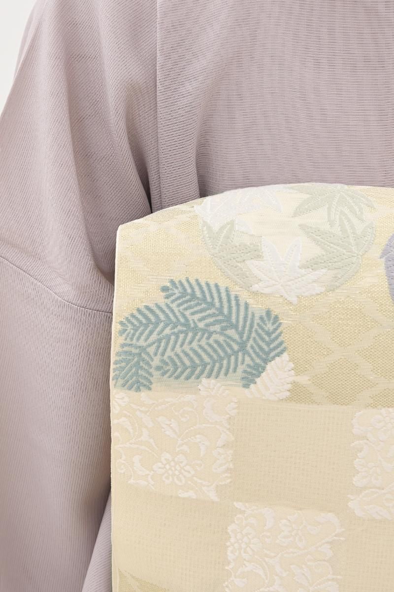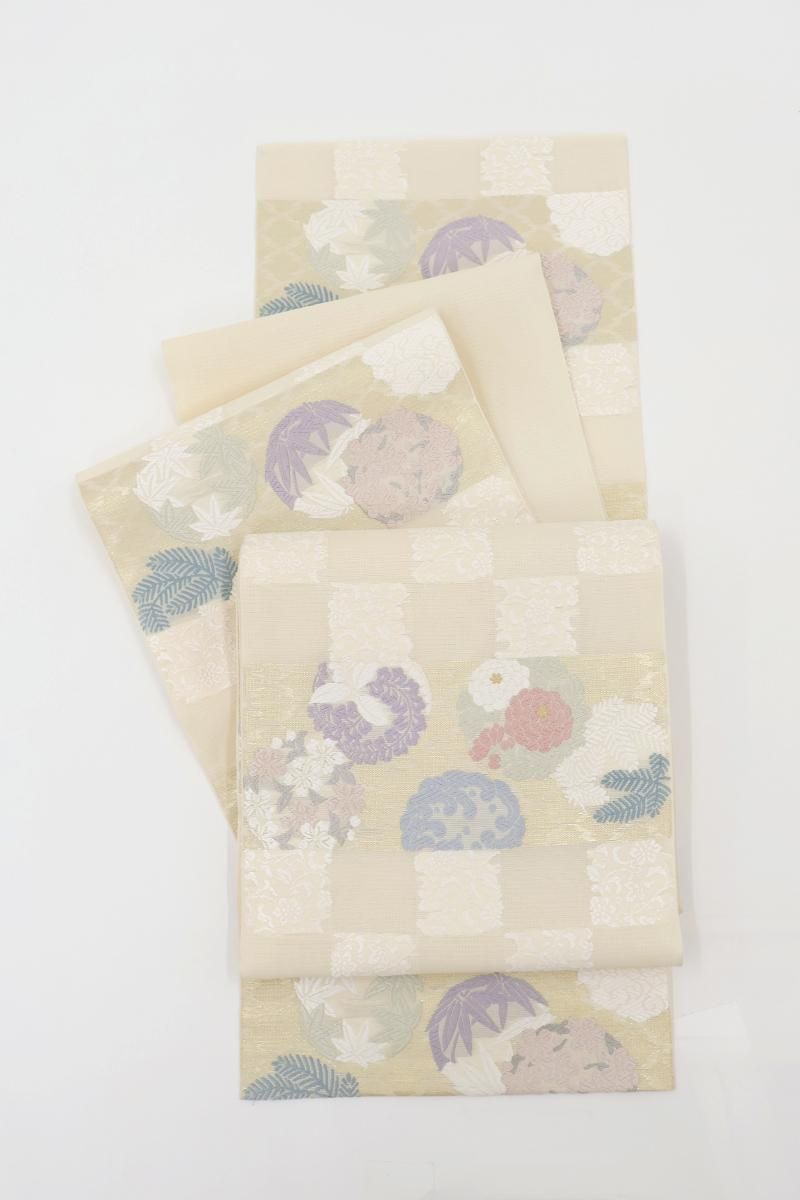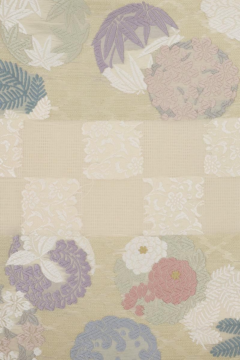 乳白色が近いでしょうか、クリーム色の地に、金で織り出された松皮菱と、花唐草の市松を横段に配し、松竹梅や桜、牡丹などの花の丸をあしらった紗の袋帯です。