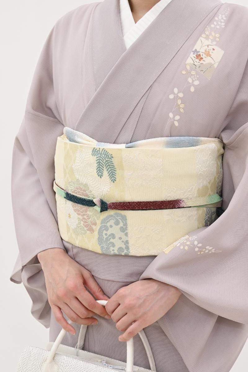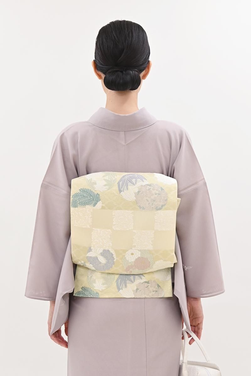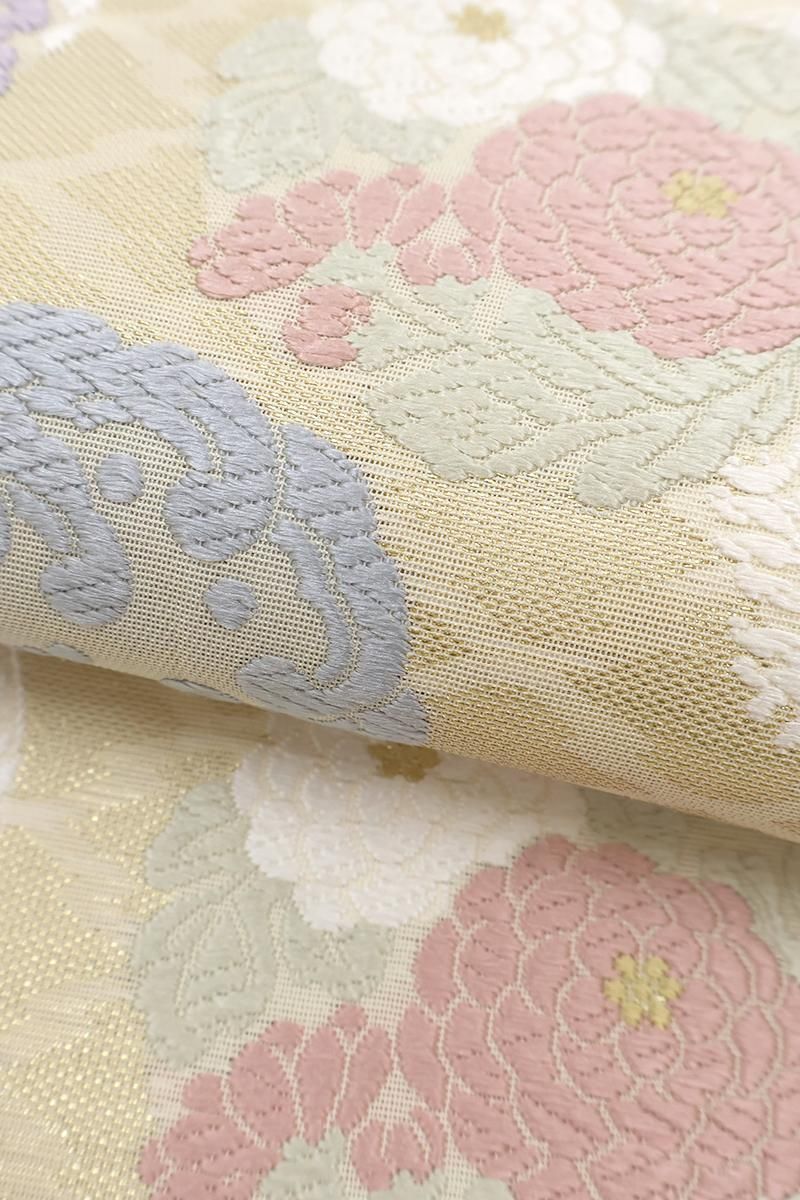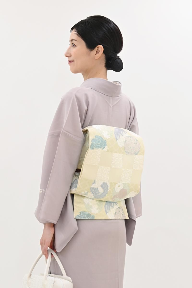 乳白色が近いでしょうか、クリーム色の地に、金で織り出された松皮菱と、花唐草の市松を横段に配し、松竹梅や桜、牡丹などの花の丸をあしらった紗の袋帯です。