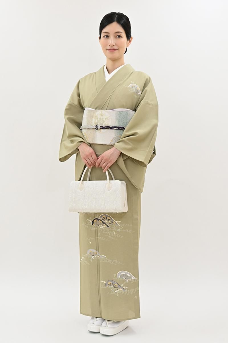こちらはぐっと色を薄めた木蘭色が近いでしょうか、灰みの強い薄緑色の地に、波に片輪車の図を描いたお品、装いに季節ならではの涼感を添えてしっとりと引き立ててくれることと思います。様々な帯合わせで、お祝いのお席やお呼ばれなどに風雅な装いをいかがでしょうか。