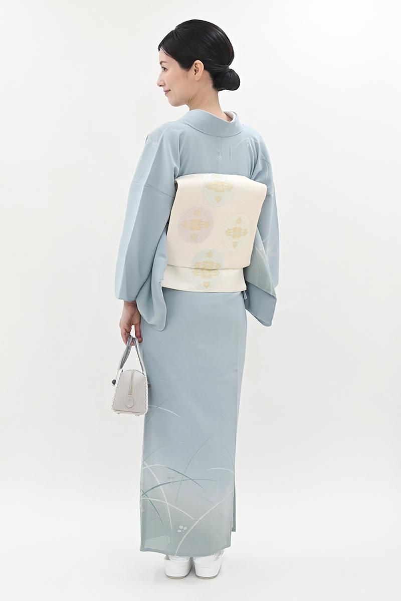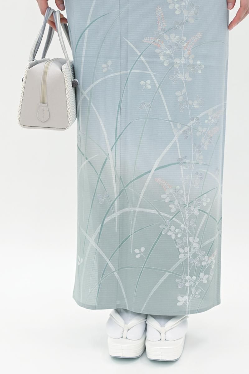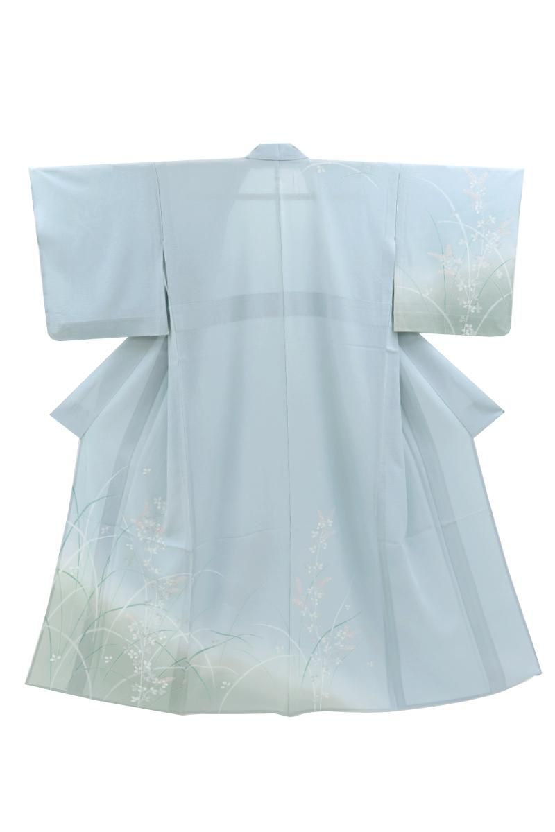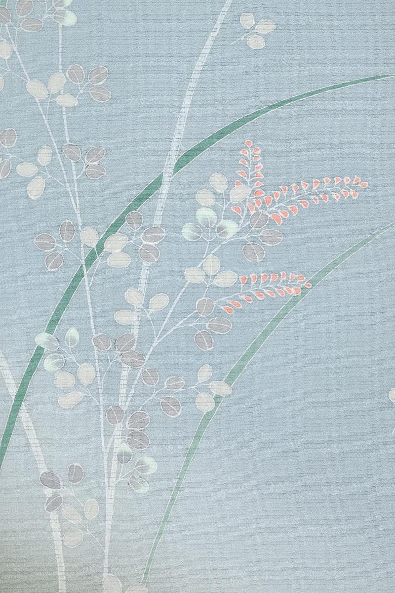 少し色を薄めたわすれなぐさ色が近いでしょうか、灰みの水色の絽縮緬地に袖と裾に灰みの緑で暈しを配し、芝や萩の図をあしらった付下げです。