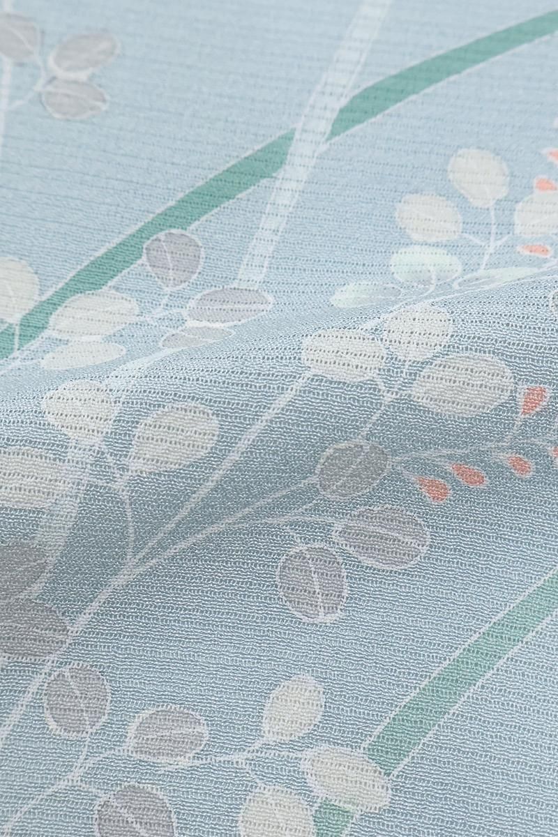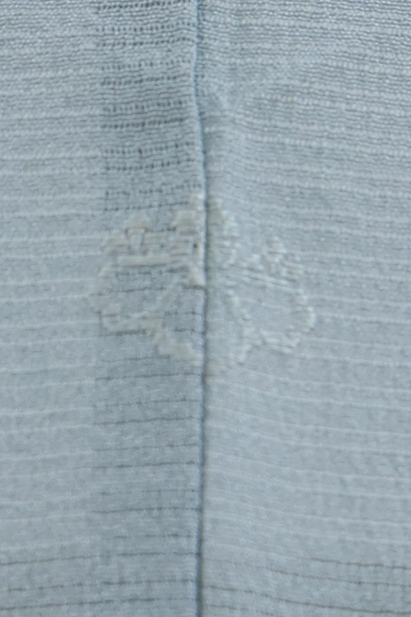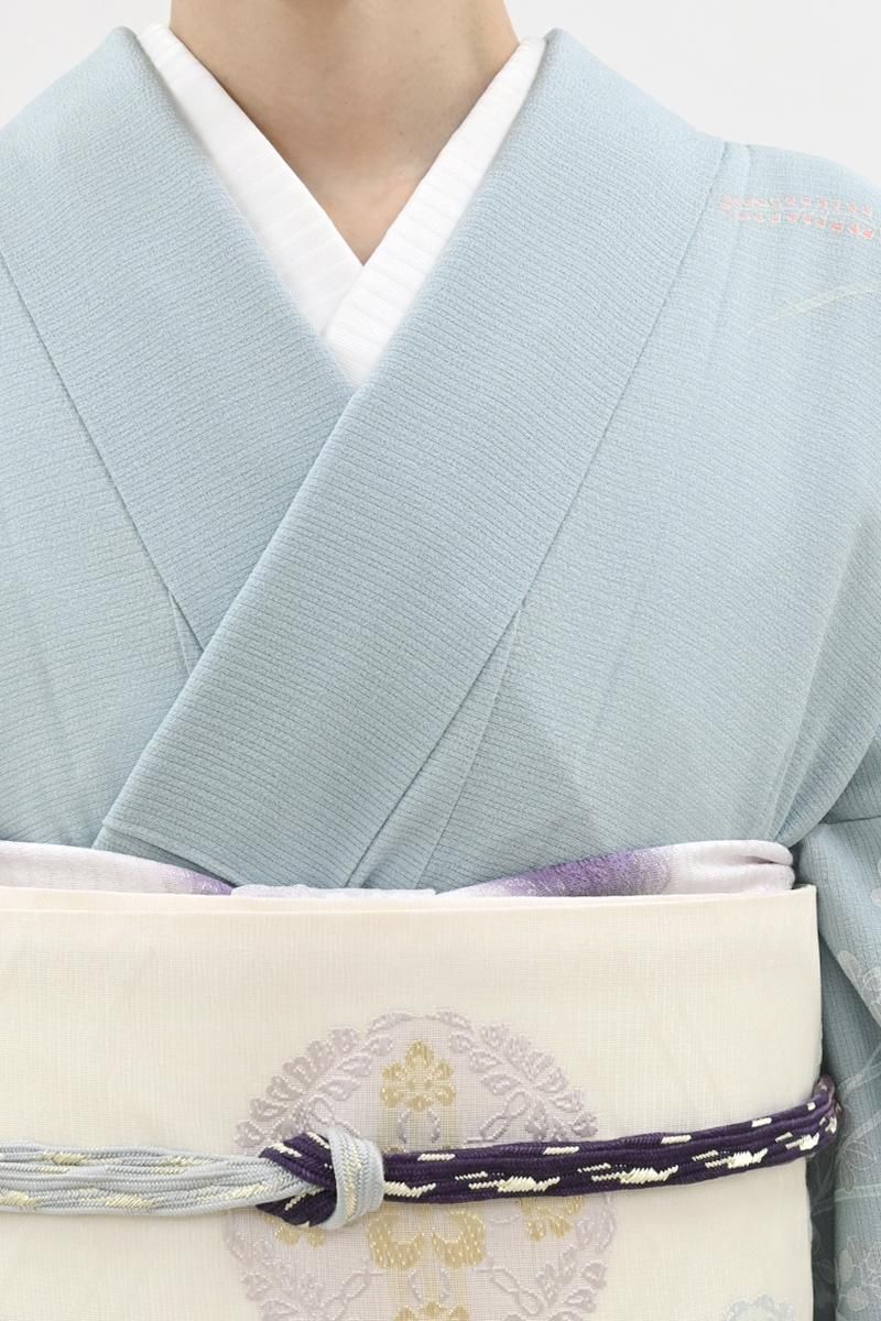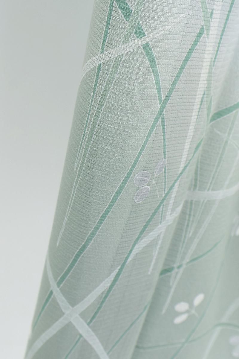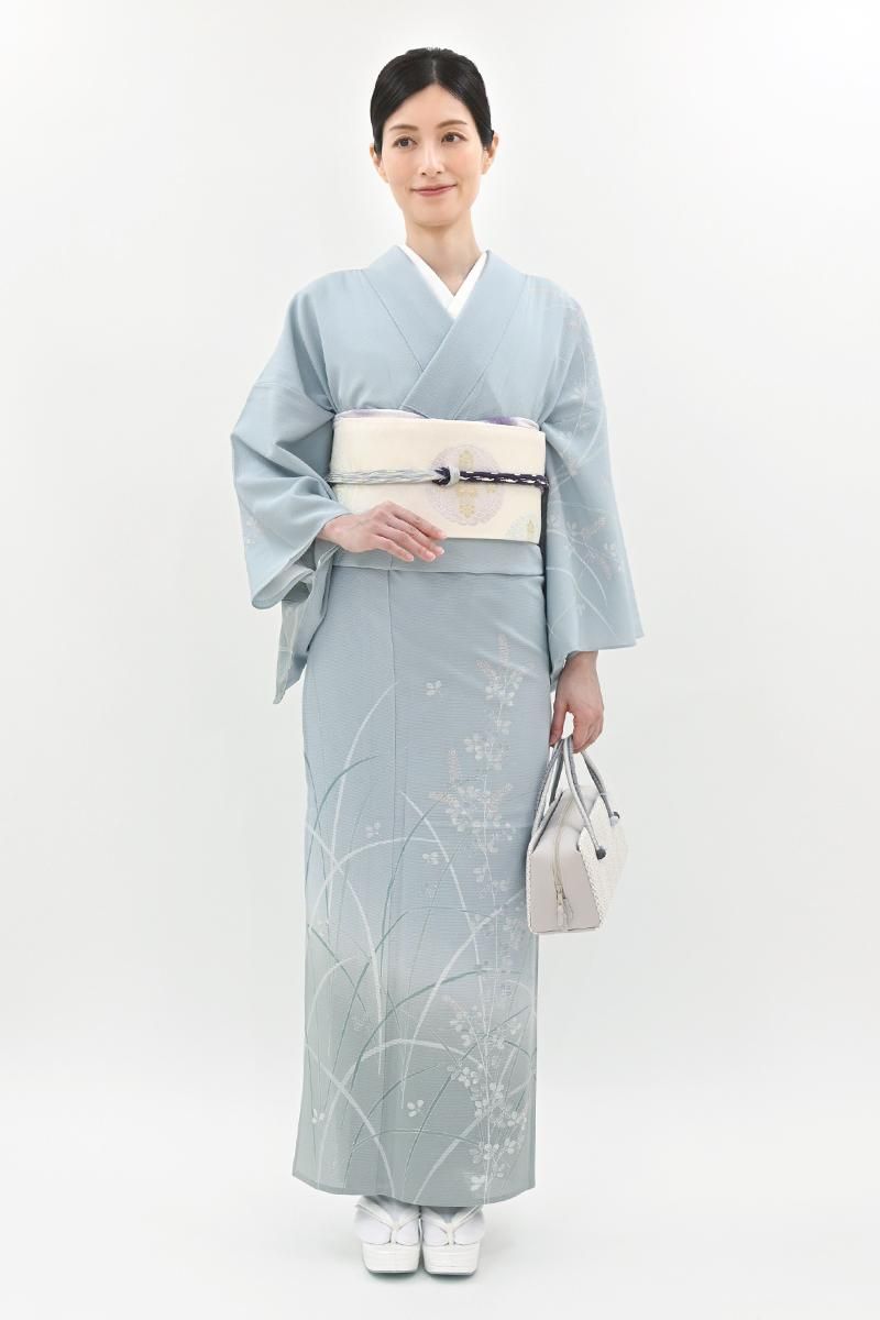 少し色を薄めたわすれなぐさ色が近いでしょうか、灰みの水色の絽縮緬地に袖と裾に灰みの緑で暈しを配し、芝や萩の図をあしらった付下げです。