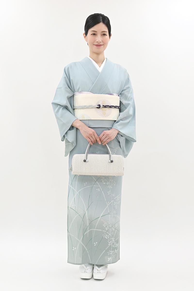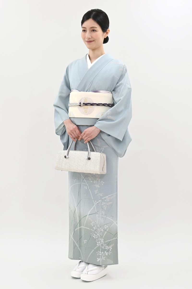 上品なグラデーションと風情ある意匠が、着姿をはんなりと引き立てる一枚、地色に溶け込むような透明感のある色遣いが、気温の高まる時期に涼を感じさせてくれそうですね。程よく控えめな印象の付下げは、着用の機会も幅広く、帯合わせ次第でちょっとした集まりから観劇、お茶席など重宝にお使いいただけることと思います。この機会にいかがでしょうか。