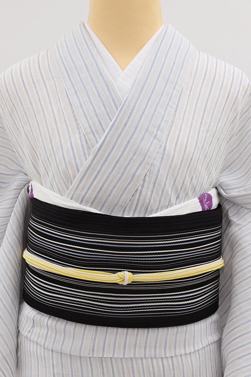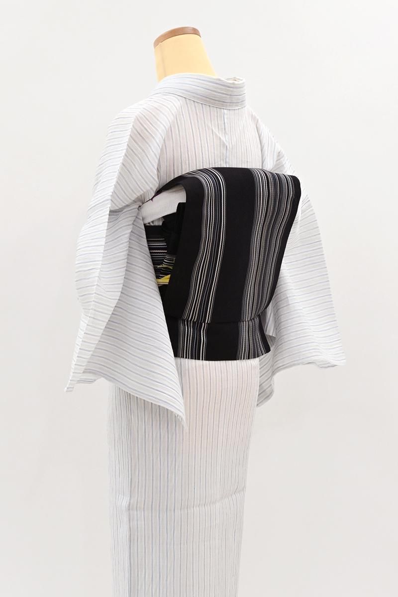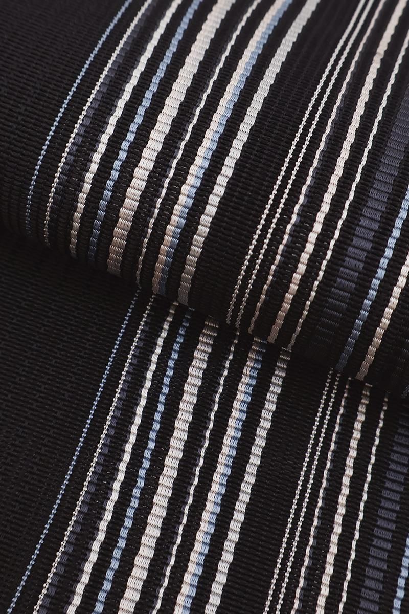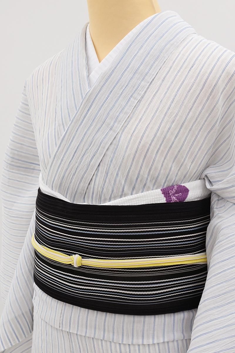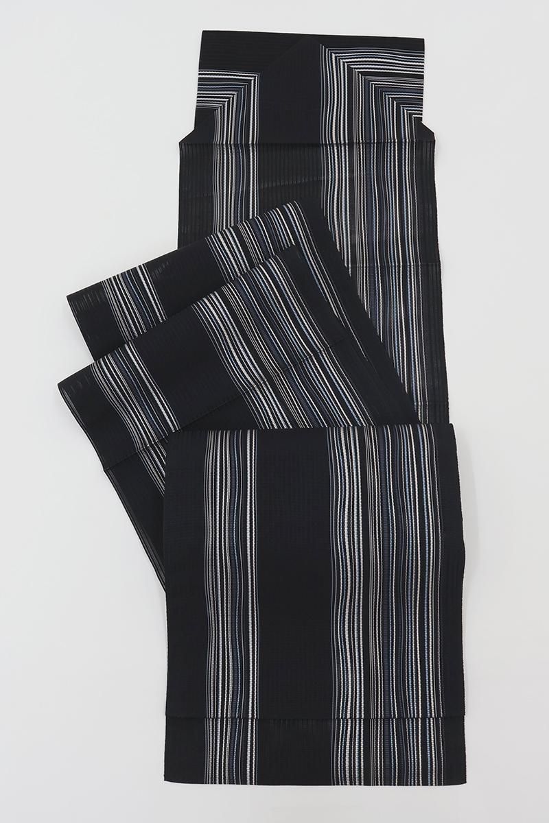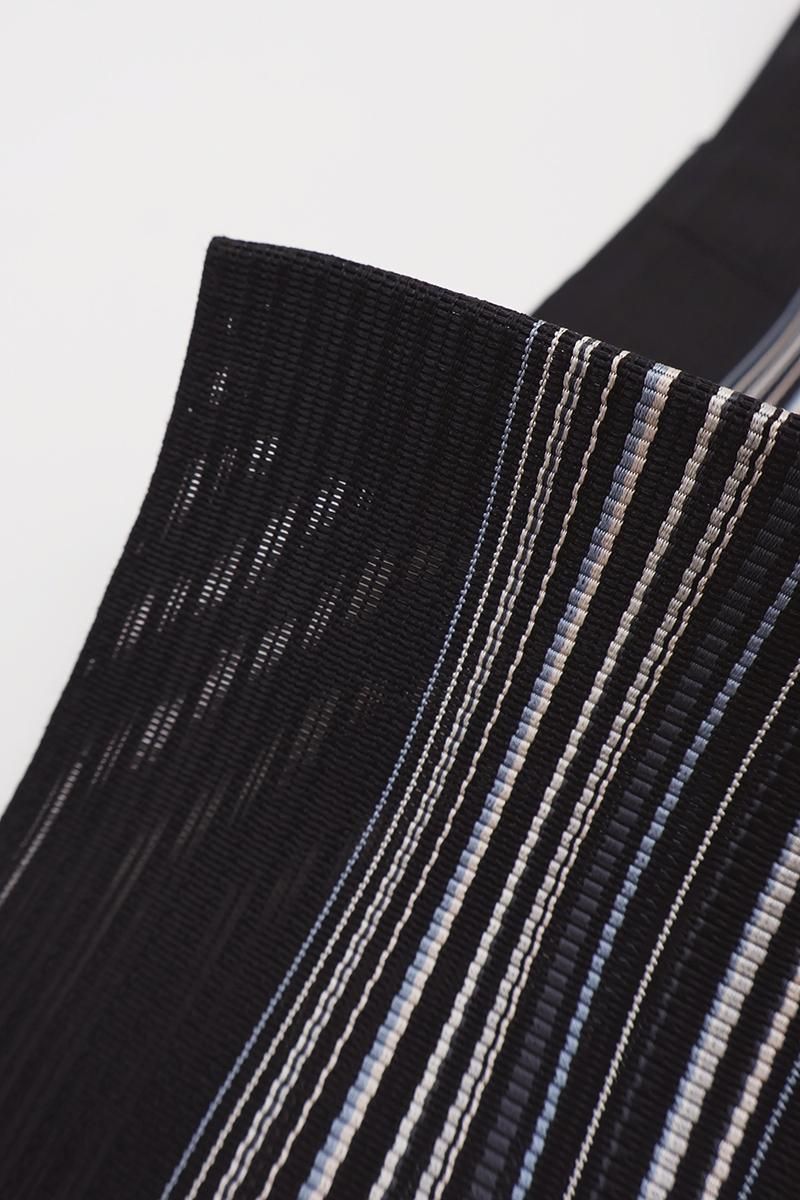 こちらは黒色の地に、グレーや灰みの水色でよろけ縞を織り出したお品、モダンで冴えた色柄が夏の装い引き締め、きりりと小粋に引き立ててくれそうですね。出番の多いお品だけに、素敵なお色のものは複数揃えておきたいもの。この機会にいかがでしょうか。