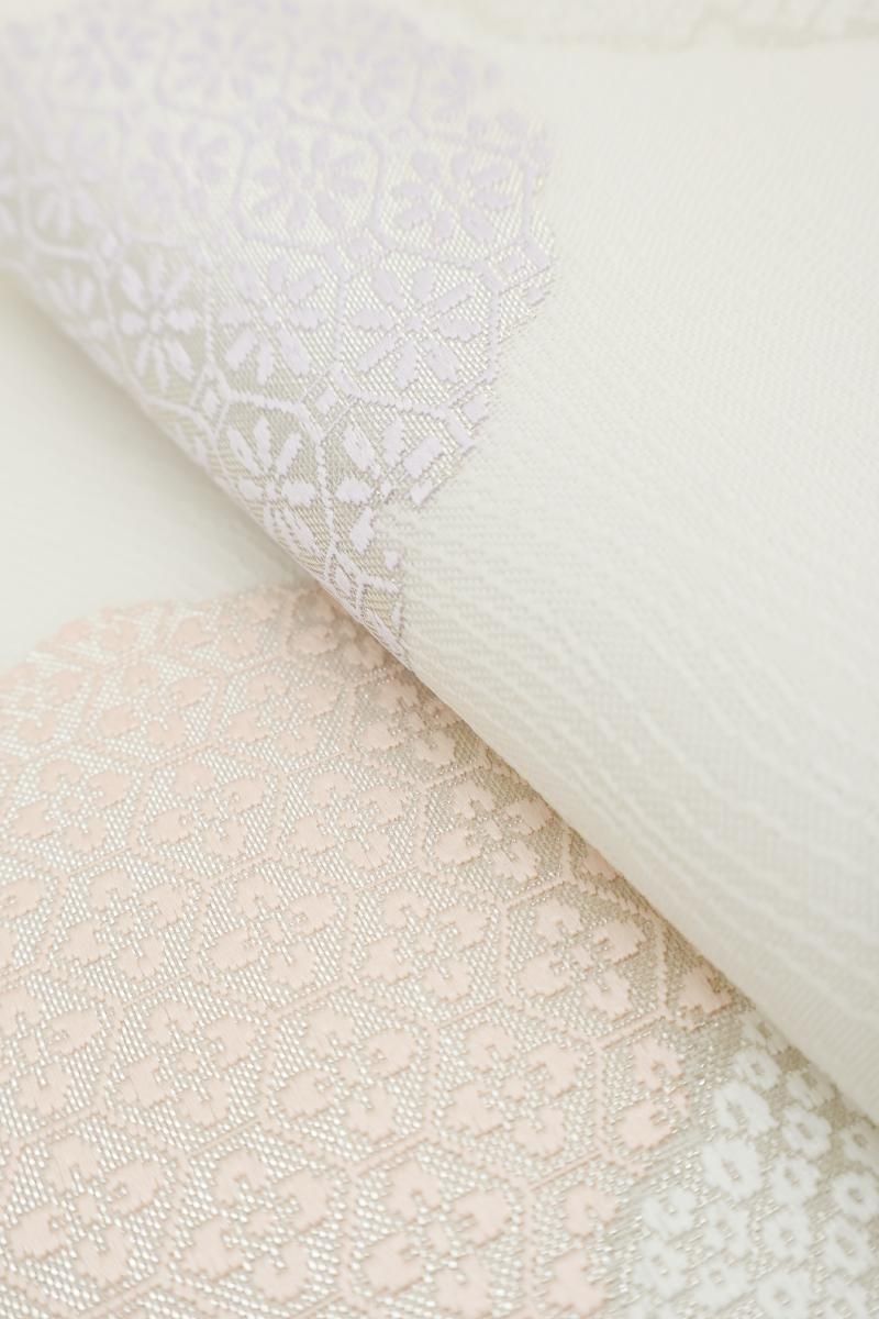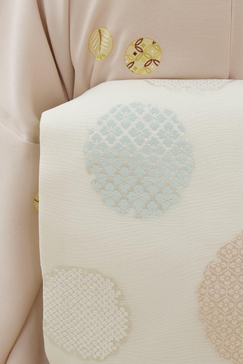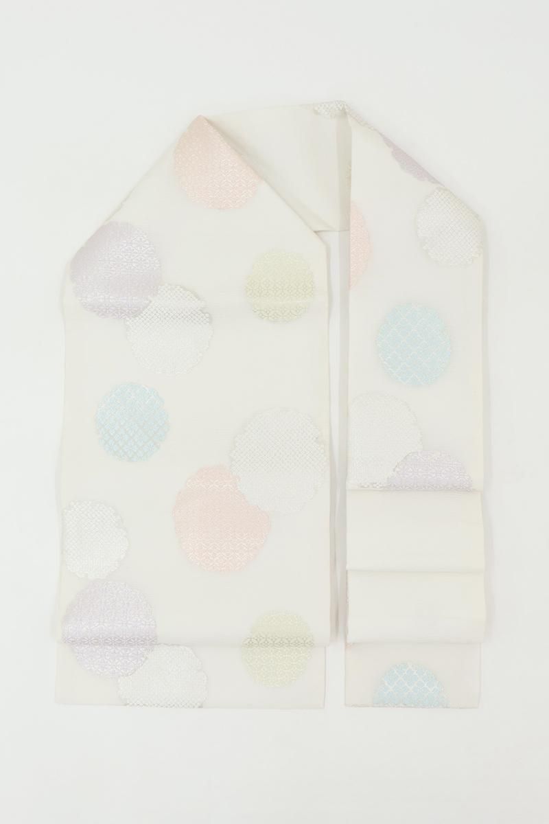 流線の地紋の浮かぶ白色の地に、匹田や七宝などを詰めた雪輪文を配した名古屋帯です。