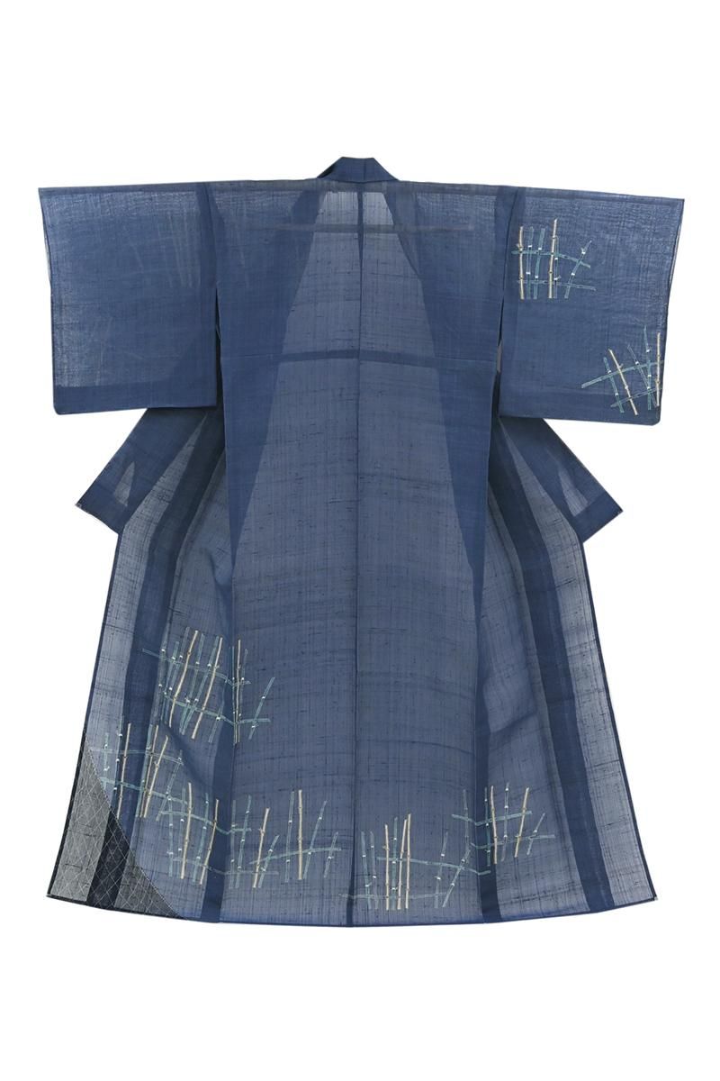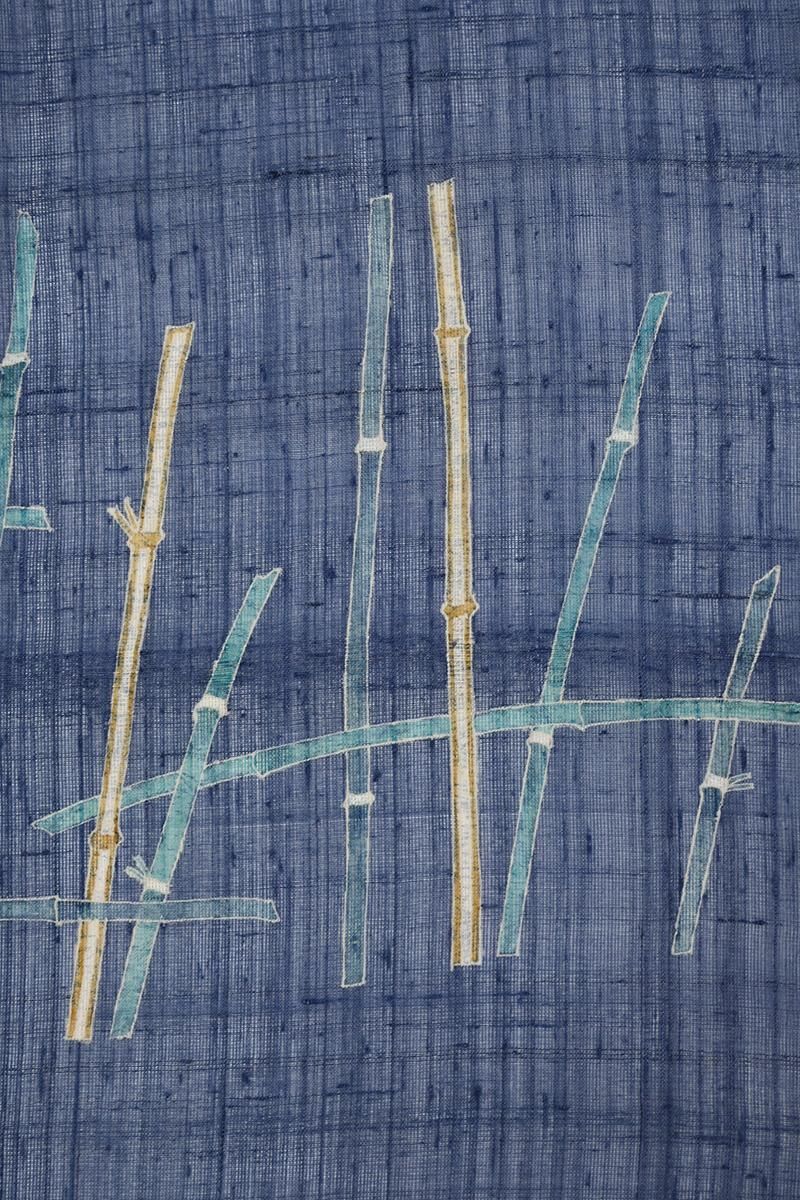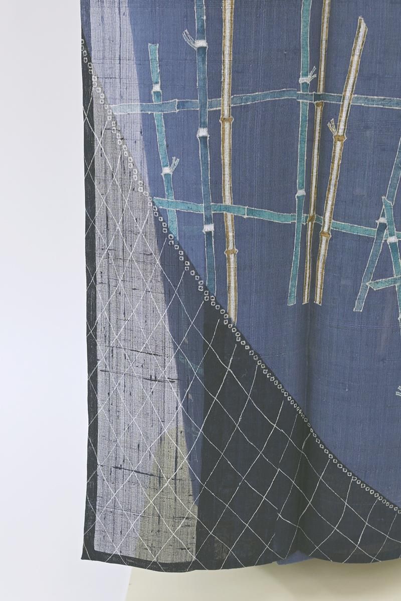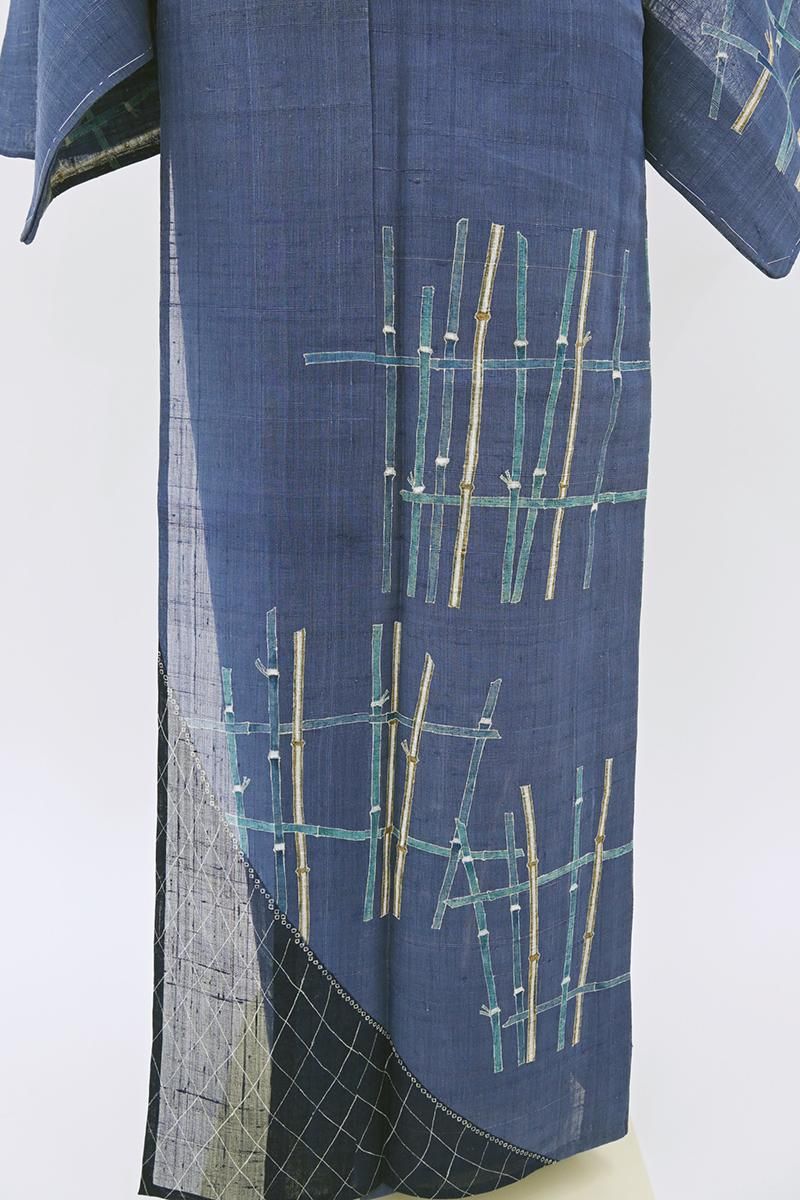 瑠璃色が近いでしょうか、ほのかに紫みを含んだ青色の地に竹垣や網干の図を配した夏の付下げです。