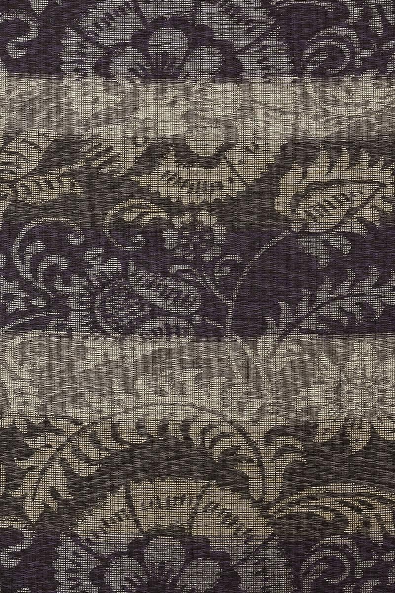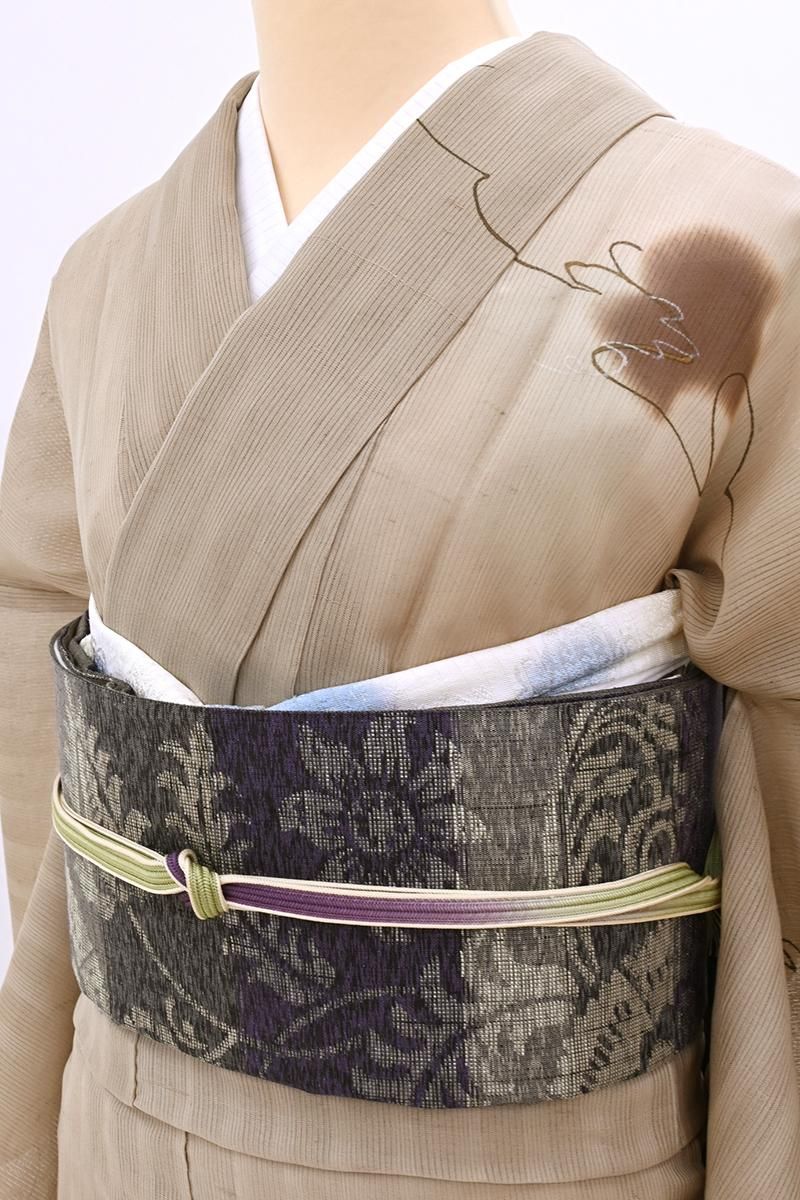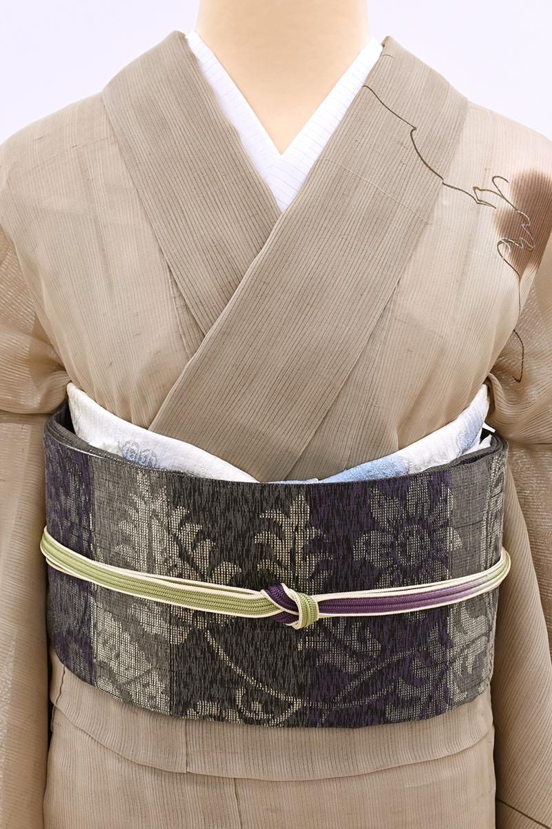 紫色とグレーの横段を背に、おおらかな唐花文を織り出した夏の洒落袋帯です。