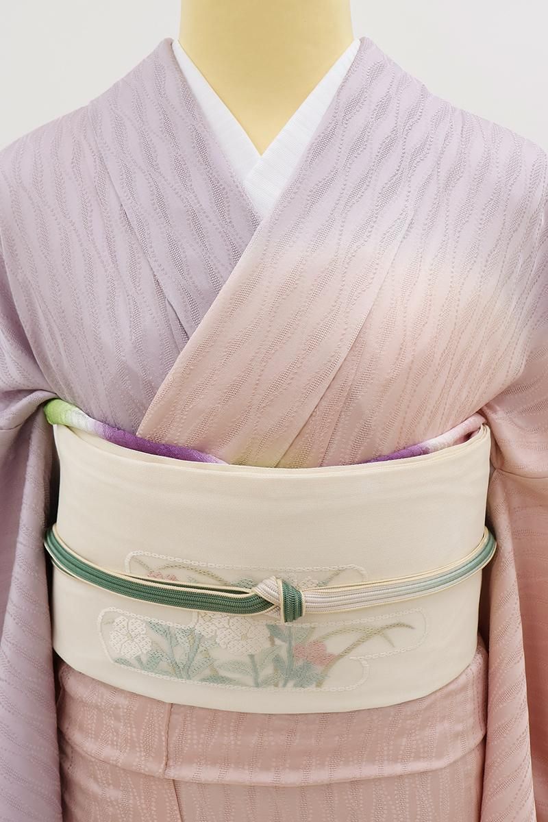 こちらはしゃりっとした地風の明るいお色目に、優美な色遣いで表現された緻密な刺繍がすっと目を惹くお品、しっとりと優美な文様が着姿に大人の愛らしさを添えますね。色無地から付下げ、訪問着などに合わせて、改まったお出かけやパーティなどにいかがでしょうか。