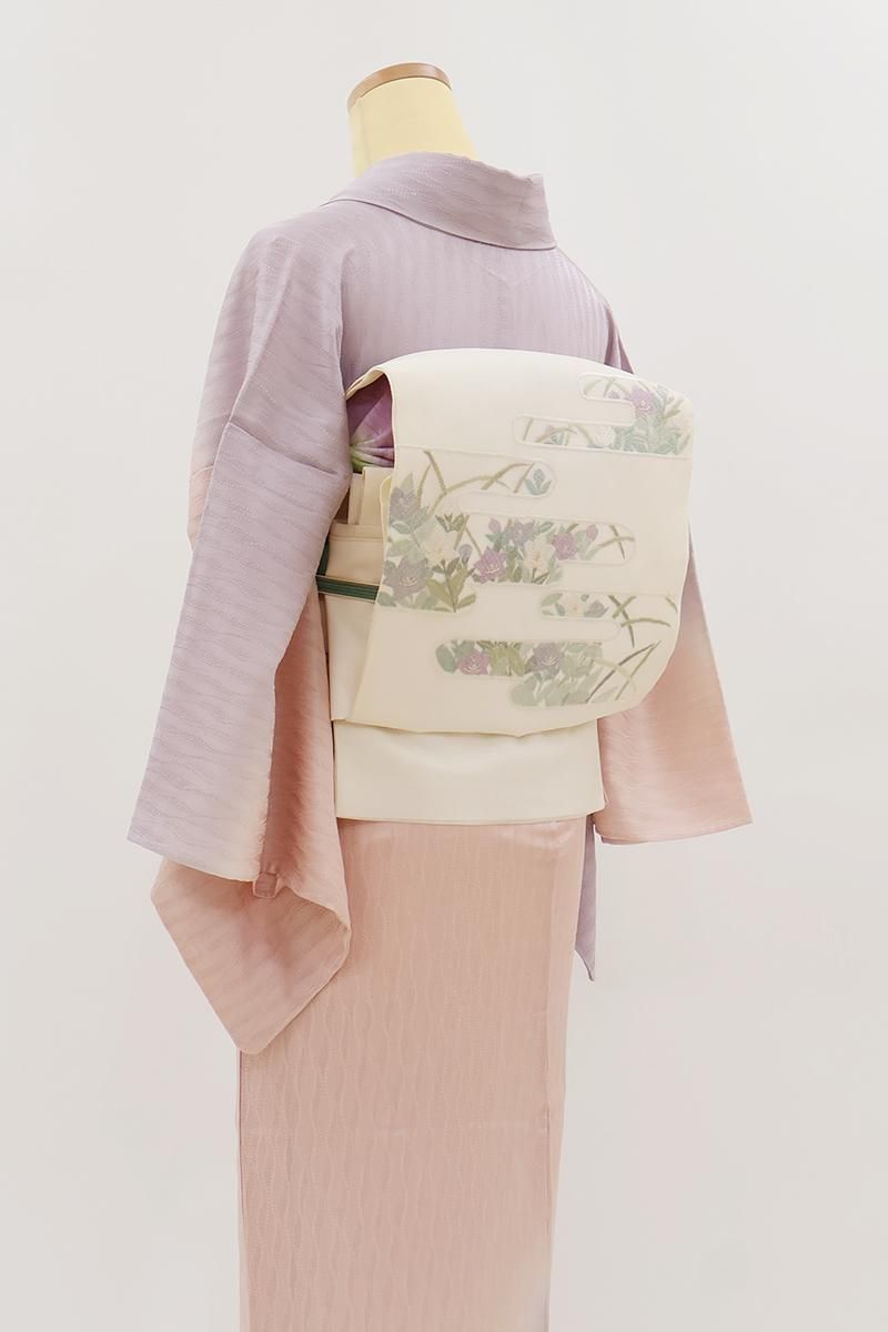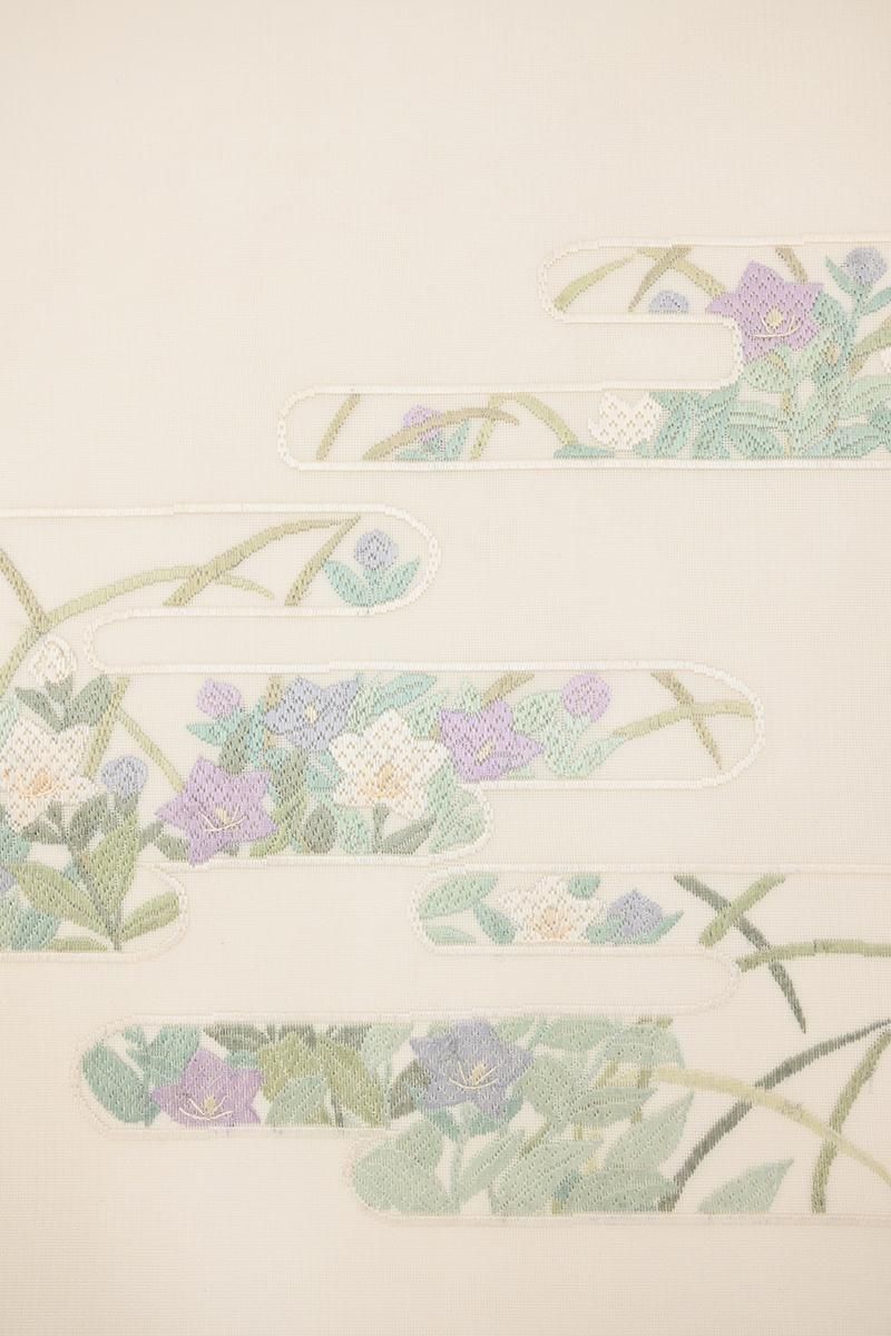乳白色が近いでしょうか、やさしい白色の地に、霞に桔梗の図をあしらった袋帯です。