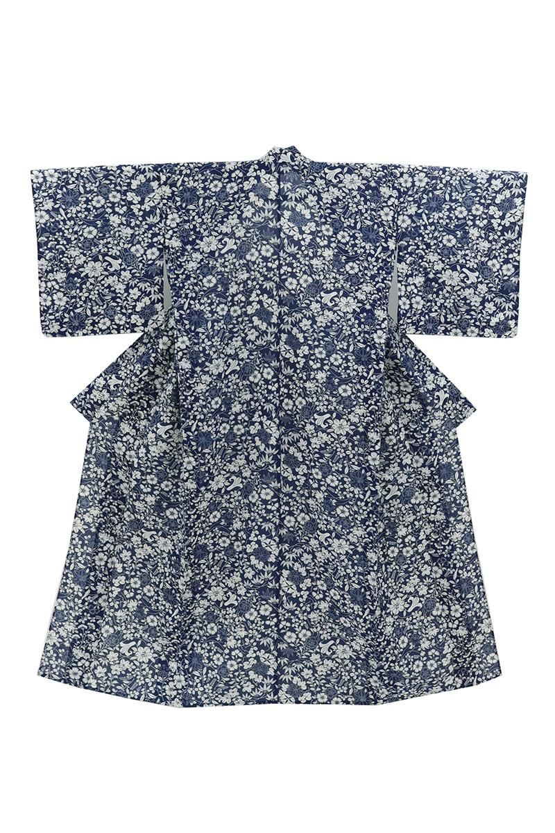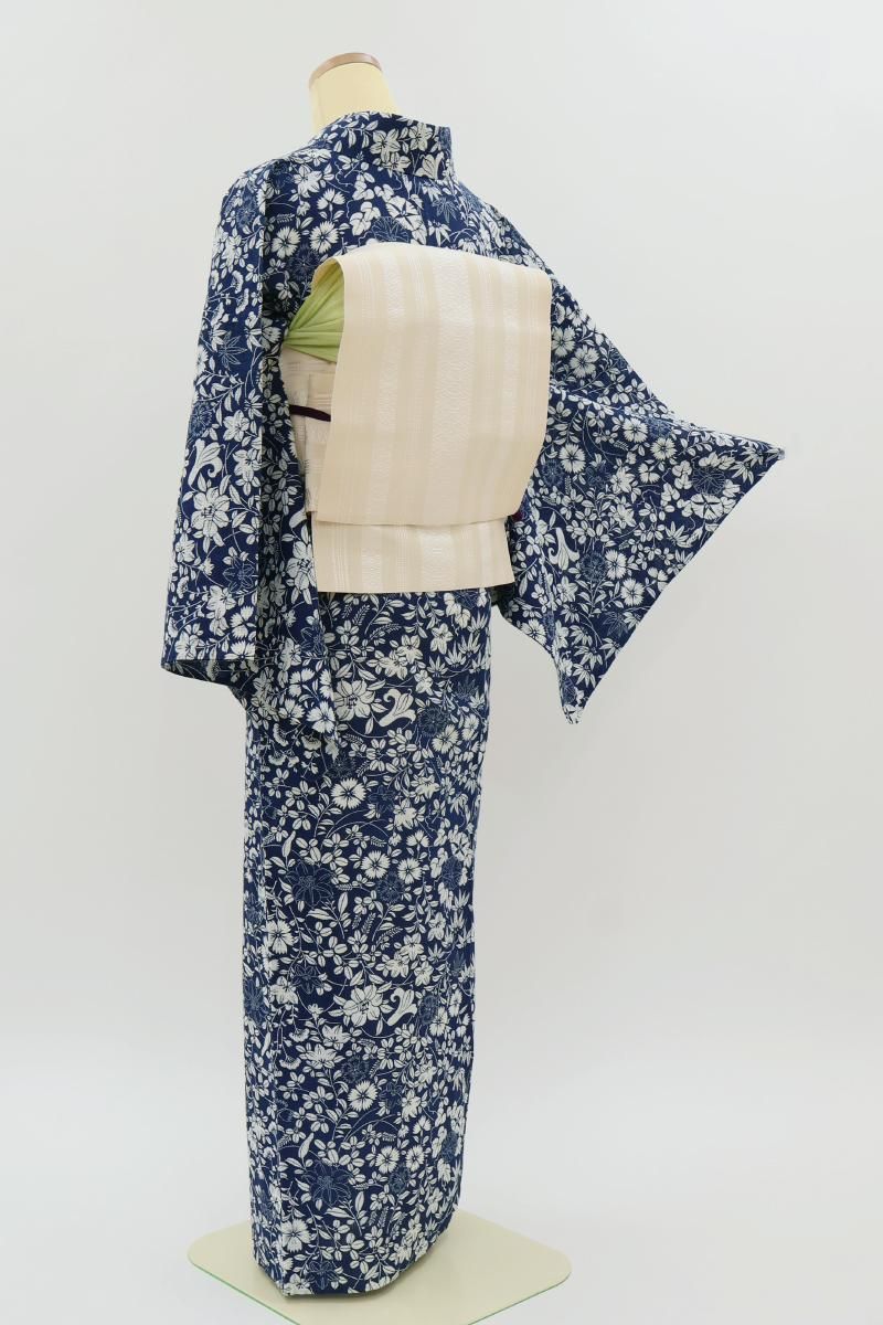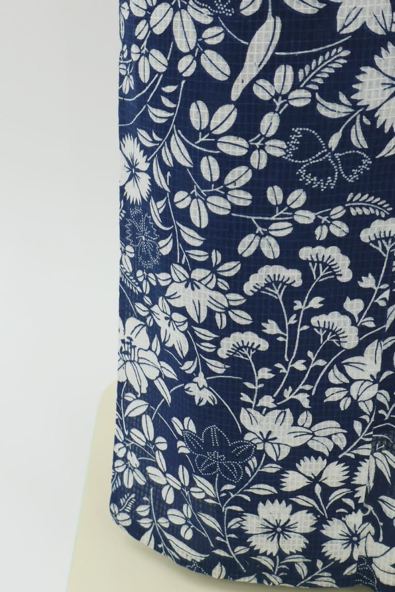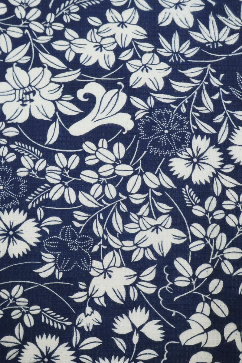 やや色を深めた紺青色が近いでしょうか、落ち着いた紺色の地に撫子や萩、百合や桔梗などの花々の図を白抜きで表した綿紅梅の浴衣です。