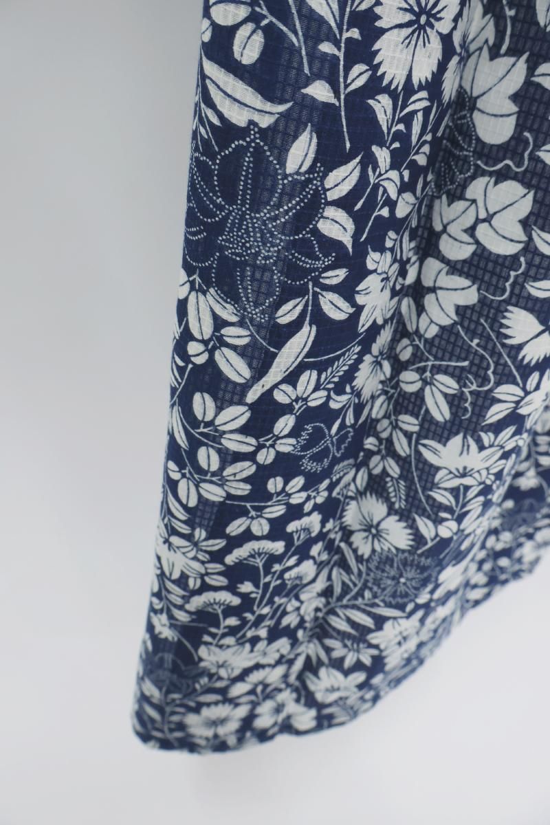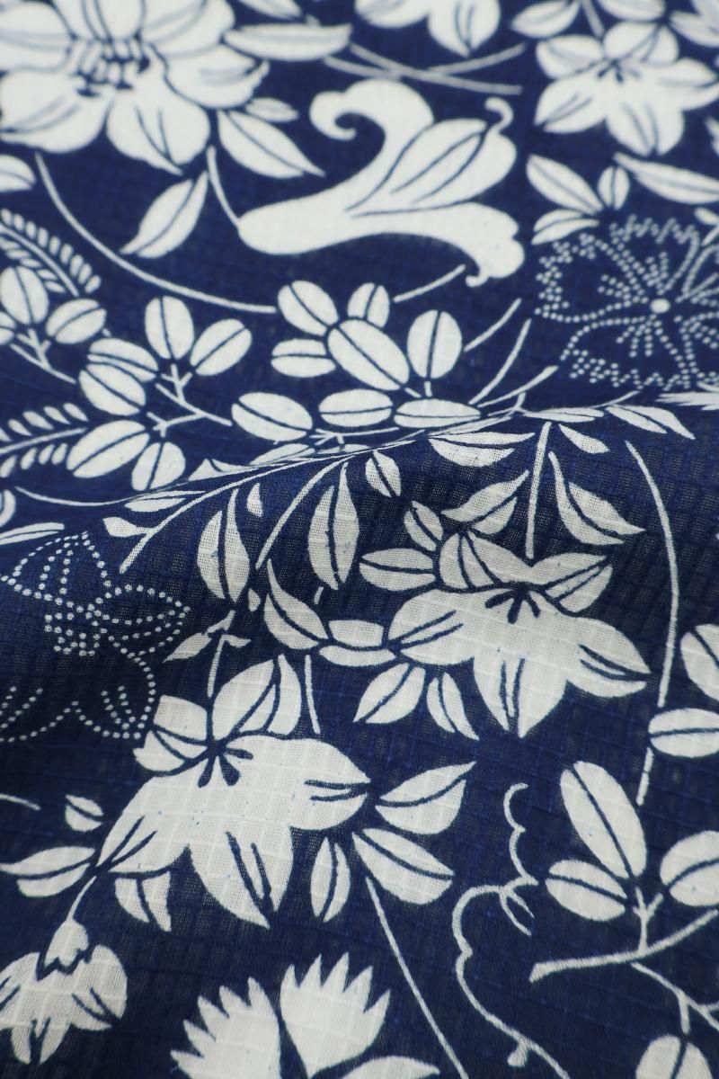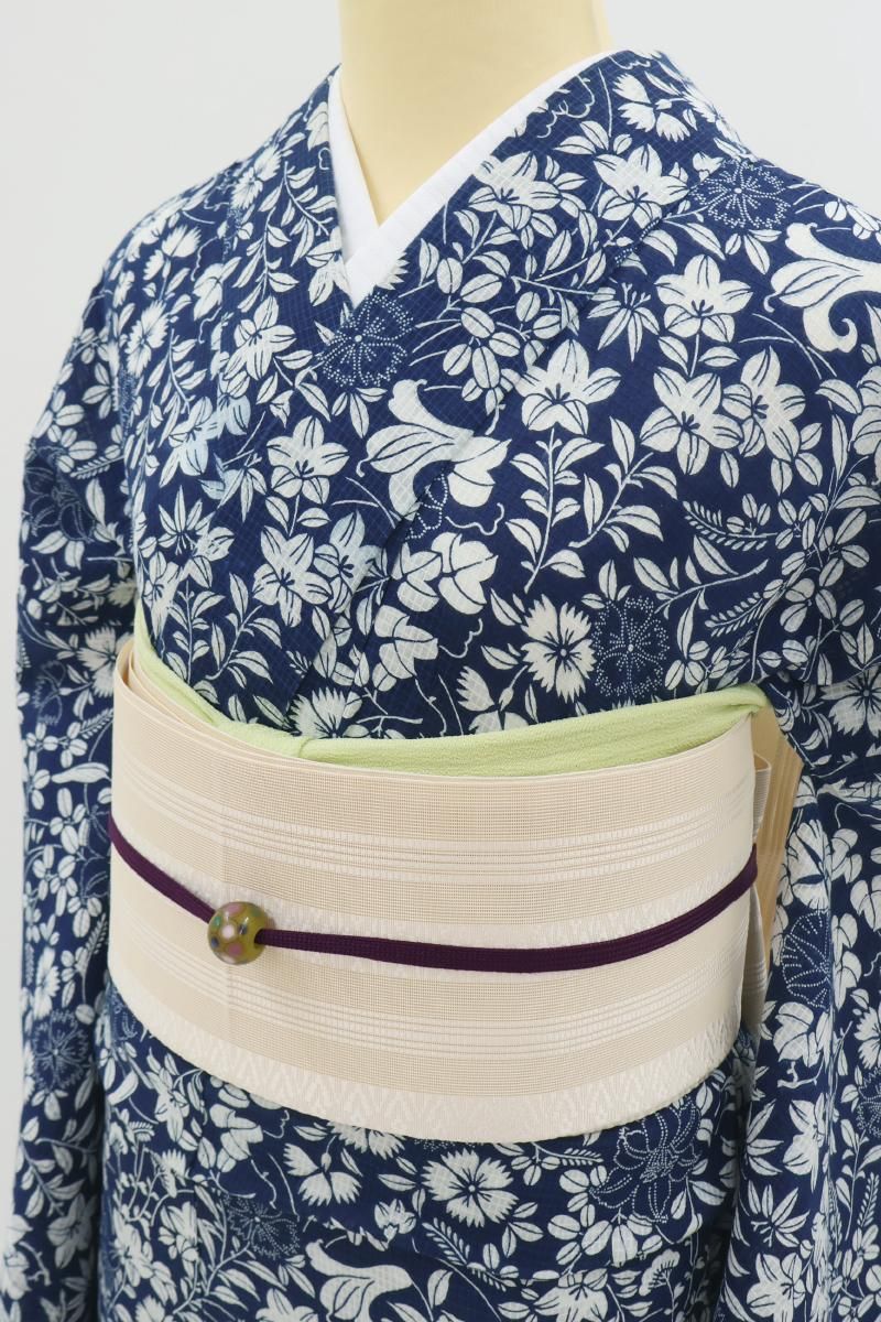 濃地にすっきりと引き立つ、たおやかで優美な花々の姿に大人の女性らしい優美さが光るお品、二種類の木綿糸で細やかな格子が織り上げられた綿紅梅ですので、半幅帯と合わせて浴衣感覚の装いは勿論のこと、半衿に足袋、名古屋帯を合わせた小紋感覚の装いも素敵ですね。花火などの夏のイベントや気軽な街着にいかがでしょうか。