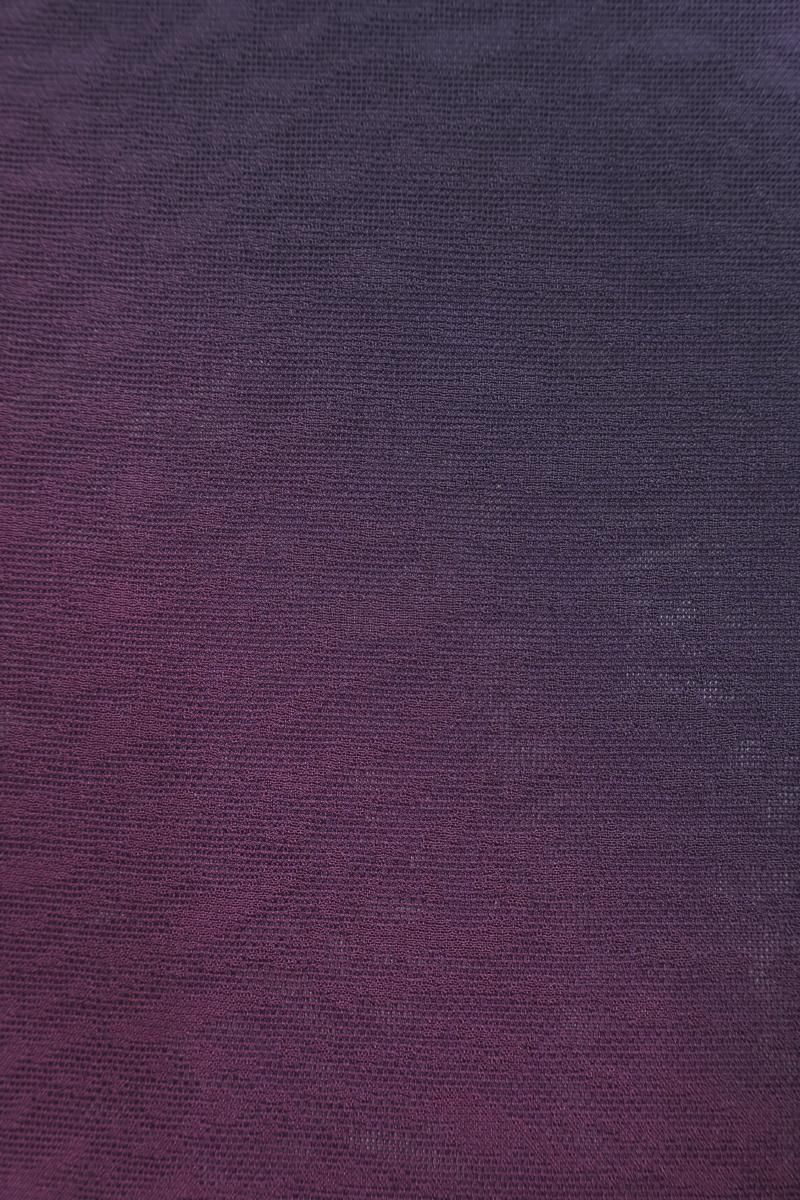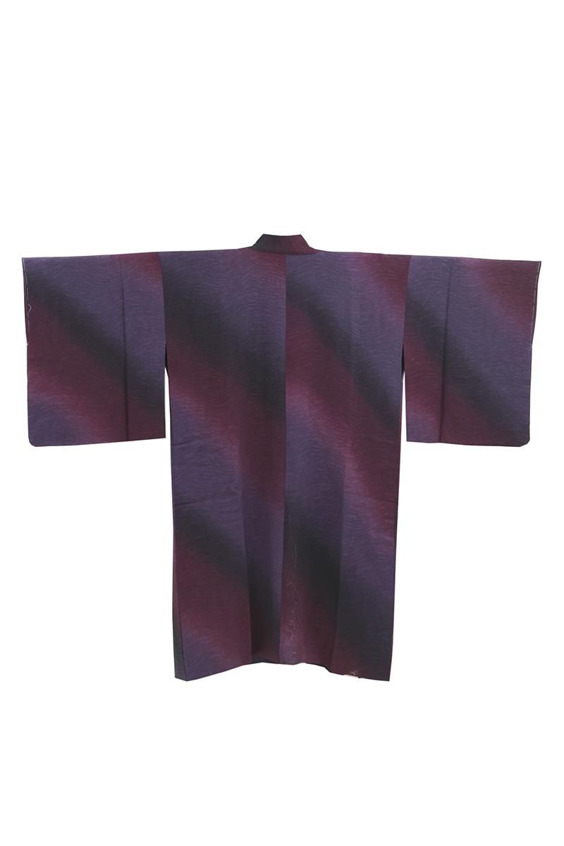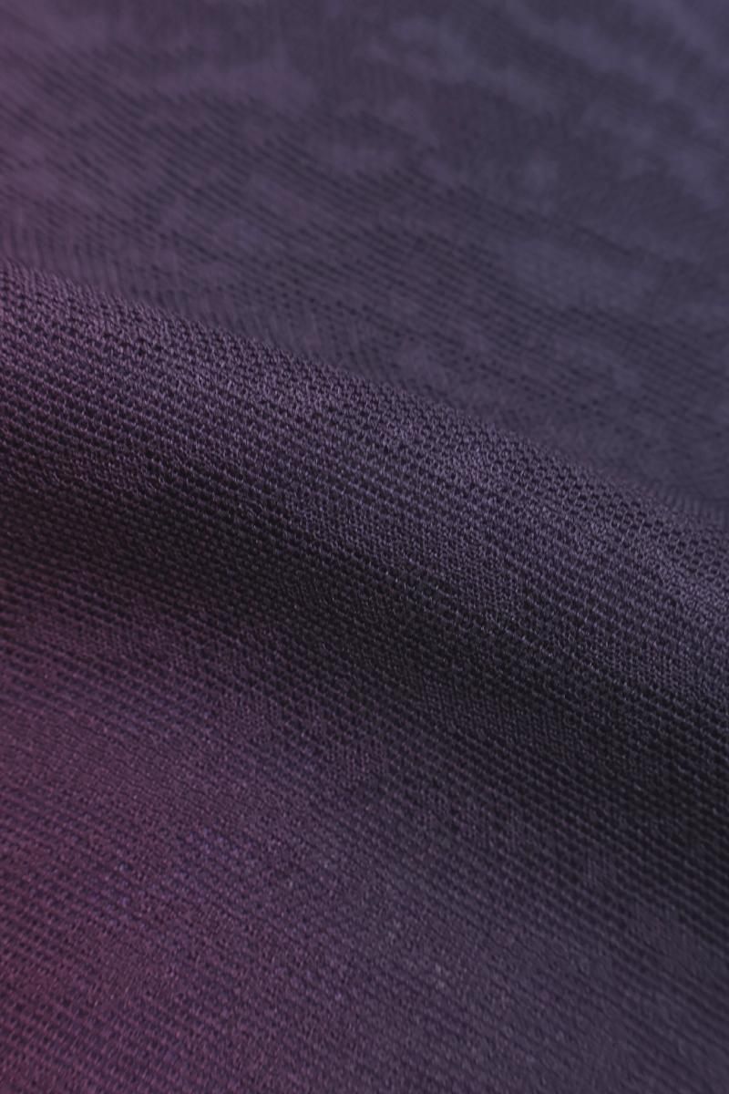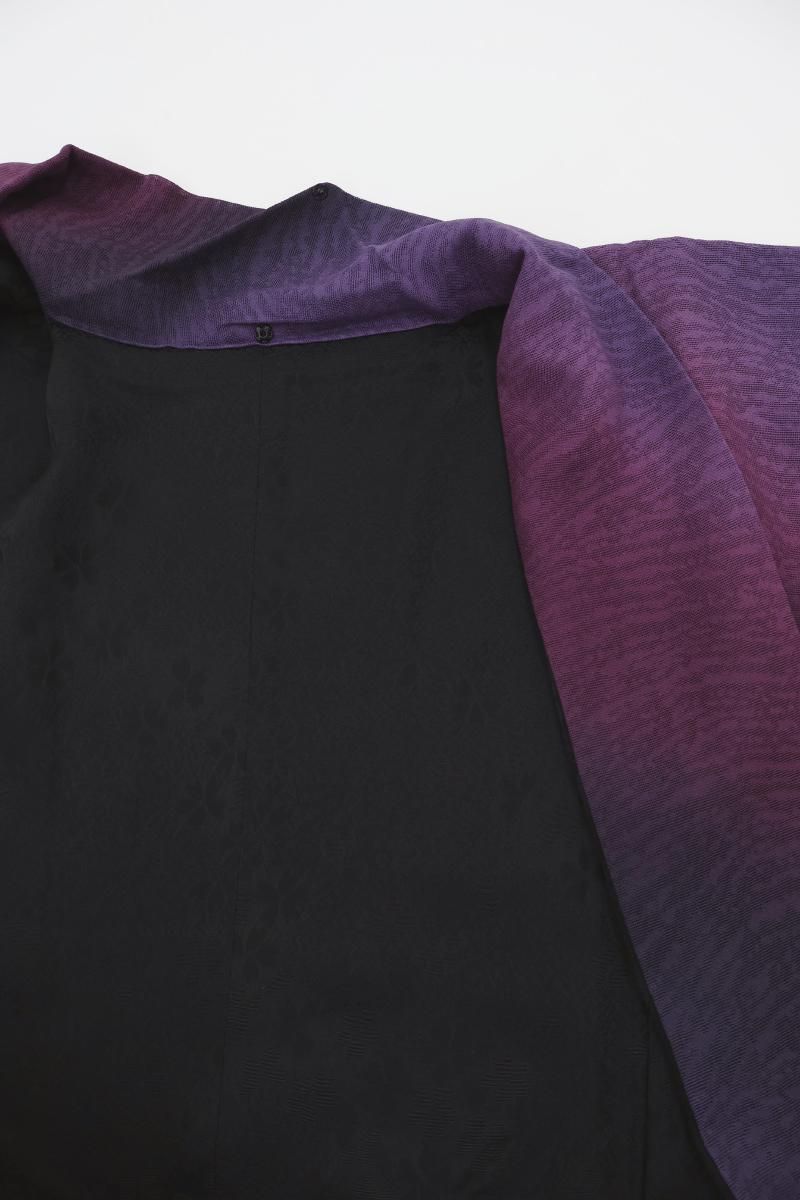 さざなみのような地紋が浮かぶ紋紗地に、江戸紫やプラム色、茄子紺など様々な紫色で斜め暈かしを配した道中着です。こちらはシックで落ち着いたグラデーションが無地感覚でありながら奥行きのある表情を見せるお品、淡色の着物に重ねてお召しいただくと一層地紋が際立ち、装いを大人の女性らしく凛と引き立ててくれることと思います。防寒の羽織ものは不要な春夏も、着物や帯の汚れを防ぐために一枚重ねて頂くとやはり安心ですね。この機会にぜひご用意下さいませ。